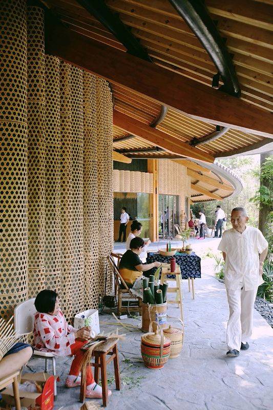 ?在竹里項(xiàng)目中,通過對當(dāng)?shù)亟ㄖa(chǎn)業(yè)的調(diào)研,該事務(wù)所發(fā)現(xiàn)竹子并不適合建筑的主體結(jié)構(gòu)。通過和當(dāng)?shù)匾患沂止に嚾说慕涣饕约?0余次的打樣,使用傳統(tǒng)的紋理設(shè)計(jì),將竹編與建筑立面結(jié)合起來,形成了既熟悉又完全不同的新效果。
