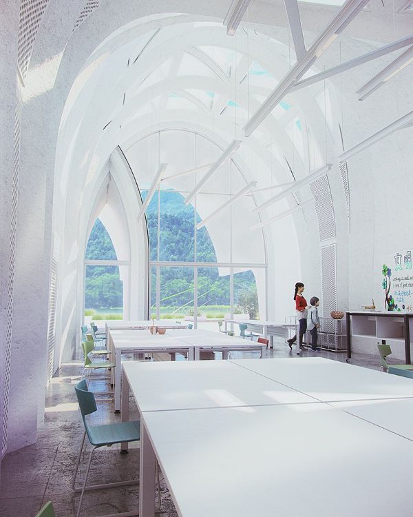 ?“拱形教室朝向最佳的自然光,同時(shí)對(duì)周圍景觀形成框景,”扎哈事務(wù)所解釋道,“懸挑部分保護(hù)教室免受江西亞熱帶氣候的陽光,同時(shí)將教學(xué)空間延伸到景觀中創(chuàng)造一種豐富互動(dòng)的學(xué)習(xí)環(huán)境。桶狀拋物線拱形作為學(xué)校的主要結(jié)構(gòu)和圍合系統(tǒng),每個(gè)拱形作為一個(gè)獨(dú)立的結(jié)構(gòu)元素而存在”。