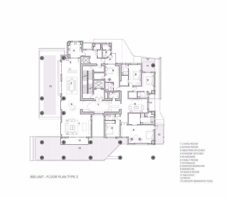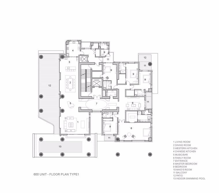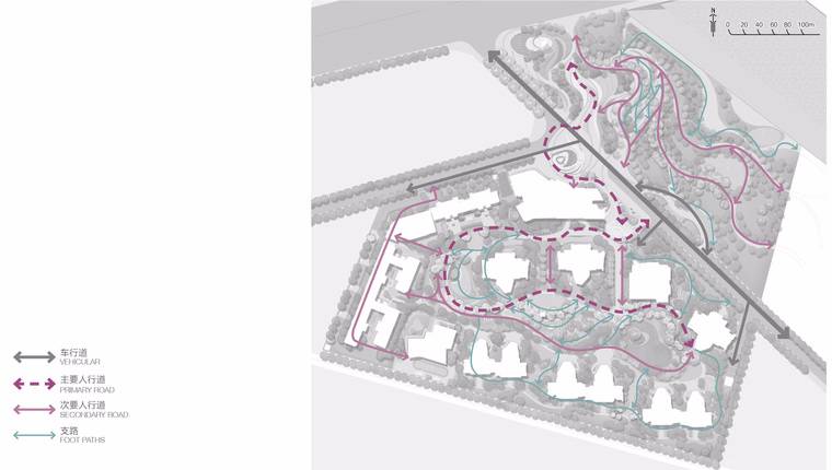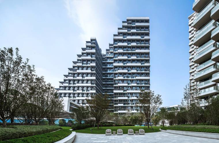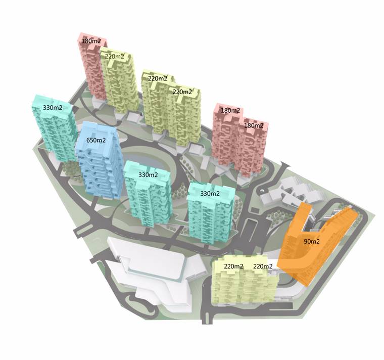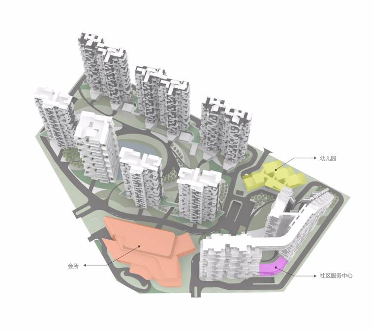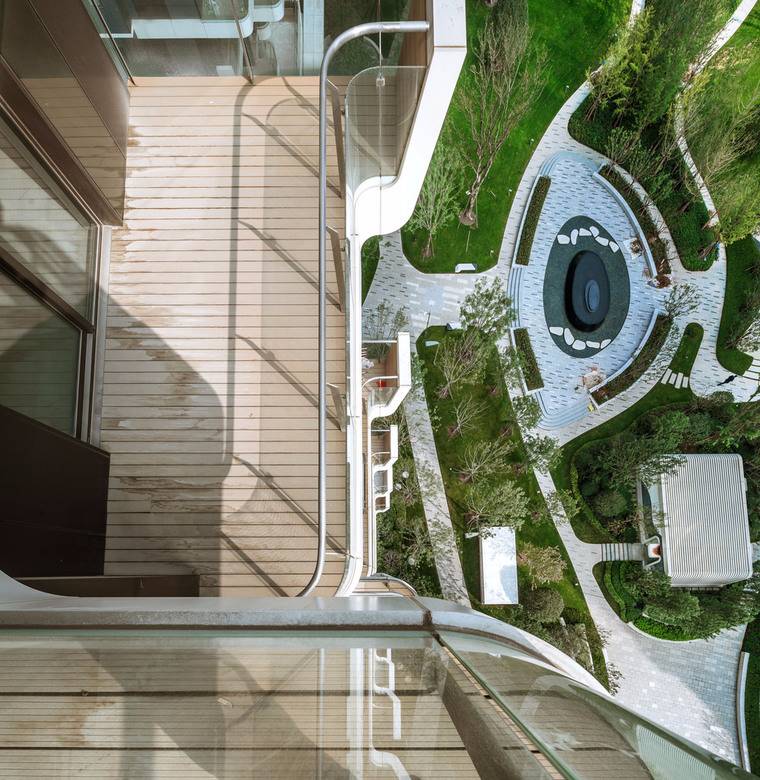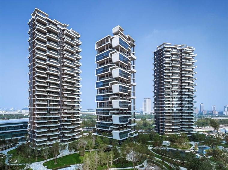 “與自然共生”起源于一個(gè)環(huán)境倫理——非人類(lèi)中心主義,即不再將人類(lèi)的自身利益作為整個(gè)星球發(fā)展的目標(biāo),而是平等地對(duì)待整個(gè)星球的物種。建筑師們著眼于將建筑變成人類(lèi)和其他動(dòng)植物共同的家園:通過(guò)倍增“垂直森林”的系統(tǒng),建設(shè)真正的生物多樣性的高密度城市。瀚海晴宇住宅是筑弧建筑事務(wù)所在中國(guó)鄭州鄭東新區(qū)CBD副中心所做的一個(gè)嘗試:與自然和諧共生的住宅??偨ㄖ娣e為21.5萬(wàn)平方米,由9個(gè)高層住宅樓,3個(gè)生活輔助建筑合圍超大面積的中央花園組成。三個(gè)生活輔助設(shè)施分別是專(zhuān)供小區(qū)居民娛樂(lè)的會(huì)所、物業(yè)用房、和一個(gè)九班的幼兒園。瀚海晴宇住宅行云流水般的跳層處理,塑造了創(chuàng)新的公建化建筑立面,極具趣味性和標(biāo)志性。項(xiàng)目結(jié)合了用戶(hù)對(duì)于私密性和舒適性的需求,利用大面積的露臺(tái)與陽(yáng)臺(tái)設(shè)計(jì),以垂直森林、空中泳池、空中花園為特色,營(yíng)造獨(dú)特的垂直景觀空間。讓建筑如同生在園林之中,將室外景觀引入室內(nèi),讓人在城市豎向居住空間亦可體驗(yàn)別墅般的優(yōu)越感和舒適感,重新定義都市高層住宅的水平。