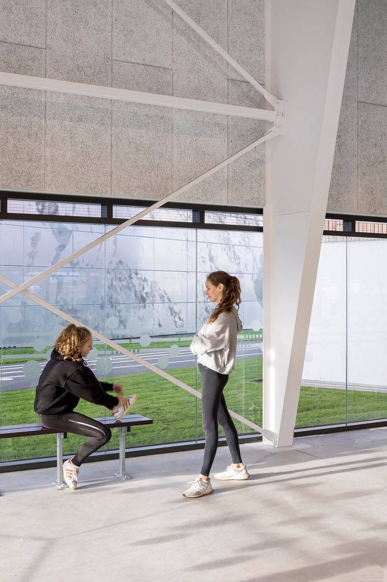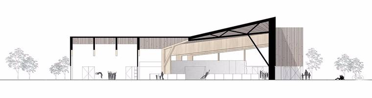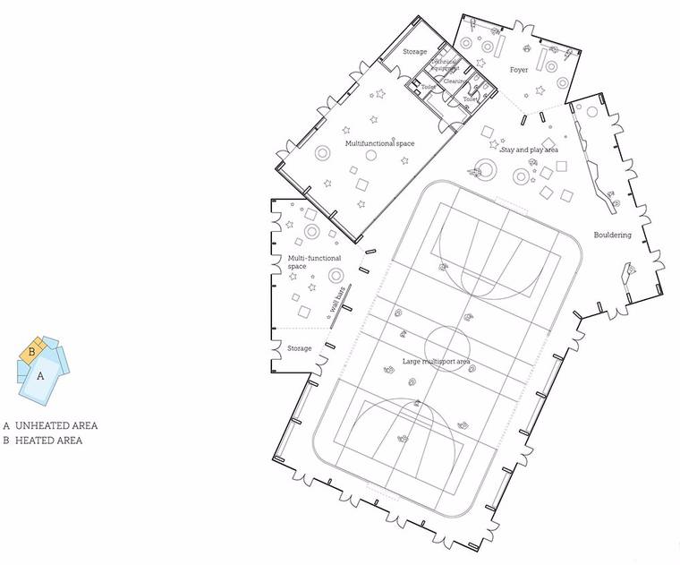 該建筑全天開放,為學(xué)校課程或當(dāng)?shù)伢w育俱樂部提供場地,可用于舉辦各種活動(dòng)。建筑由三個(gè)體量組合而成,三個(gè)體量的中心相互連接,形成斷裂的形臺(tái),可以清楚區(qū)分不同的功能區(qū)域。建筑內(nèi)部空間大面積開放,因此可以靈活使用。三種體量中只有一個(gè)與室內(nèi)其余部分分開,同時(shí)這個(gè)空間也具有相應(yīng)的隱私保障與隔音設(shè)施。這個(gè)封閉的房間也具有隔熱的效果,可用作會(huì)議室或咖啡廳,或作為舞蹈、瑜伽、武術(shù)和其他小型活動(dòng)的工作室。主要的多功能空間面積寬敞,可用于團(tuán)隊(duì)運(yùn)動(dòng),如籃球或足球。另外,這里還可以舉辦跳蚤市場等社區(qū)活動(dòng)。