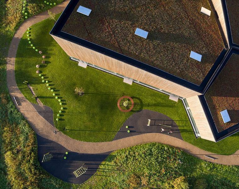 室內(nèi)的墻壁上安裝著永久攀巖設(shè)施。其明亮的彩色面板讓色彩單一的室內(nèi)空間變得活躍起來。“這是當(dāng)?shù)伢w育和社交活動(dòng)的場所,所以創(chuàng)意和娛樂活動(dòng)都可以在這里進(jìn)行?!盢ORD Architects合伙人Johannes Molander Pedersen補(bǔ)充道?!斑@座建筑結(jié)構(gòu)輕盈,符合城市地區(qū)的開放性和不可預(yù)測性,我們相信它會(huì)為城市帶來社會(huì)活力。”入口是建筑物的最低點(diǎn),它具有人性化尺度,并對當(dāng)?shù)厣鐓^(qū)和路人呈現(xiàn)出宜人的歡迎感。使用者從建筑的入口處延伸出來的玻璃窗可以看到周圍公園的活動(dòng)區(qū)域。玻璃窗上方均覆蓋有垂直木板,為建筑帶來均勻的美感,因此這座建筑并沒有明確的主立面。木質(zhì)屋頂讓建筑與公園的環(huán)境更加融合,并配有綠化屋頂,為該地區(qū)增添了綠色植物。