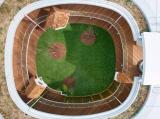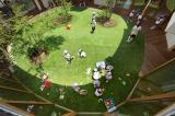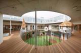 于是我們看到了一座從頂部看類似體育場的建筑,中央的“綠茵場”正是孩子們的課間活動場地。建筑共三層,首層二層在圍繞“綠茵場”設(shè)置了一圈環(huán)形外廊,外廊的寬度同樣適合在天氣不好時孩子們的活動,另外,在二層外廊上點綴了幾處外凸的小房子。這種卡通式的小空間,相信對小孩子有著極大的誘惑。