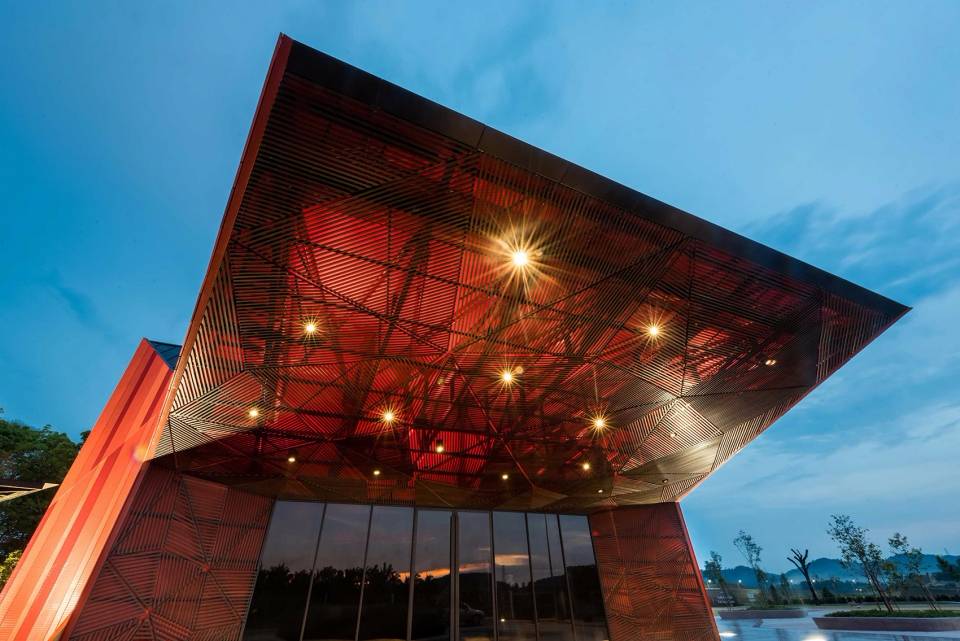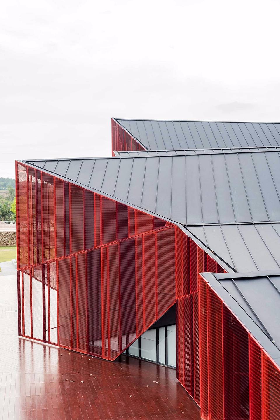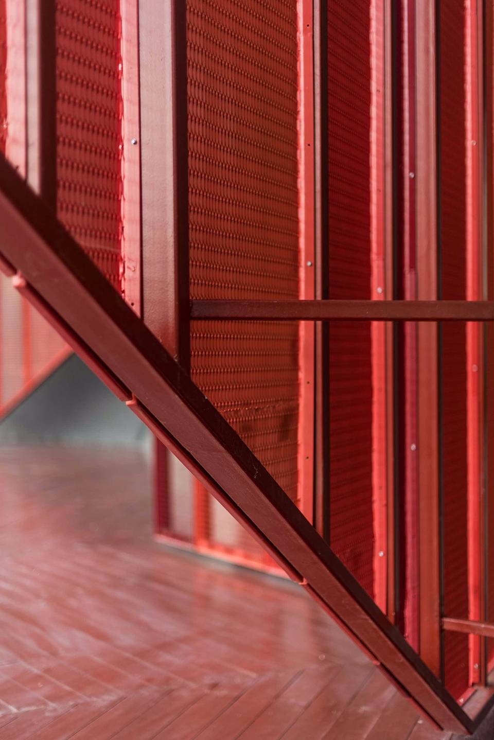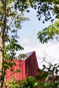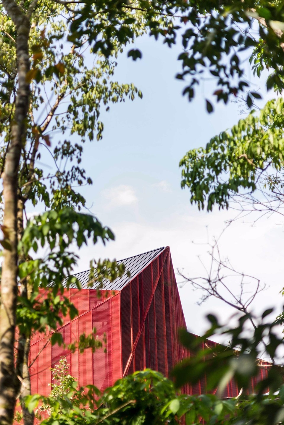 在構(gòu)建實(shí)體建筑之前,建筑團(tuán)隊(duì)首先對(duì)使用者的體驗(yàn)進(jìn)行了構(gòu)想。這是一次探索被遺忘之地的旅程。畫廊的入口路徑位于橡膠樹林的一端,參觀者們將借助抬升于地面的、蜿蜒的金屬平臺(tái)穿越樹林。醒目的紅色立面使人能夠輕易地從森林背后窺得它的身影,同時(shí)又不至于完全顯露出來。通往森林的路徑就像是走入一個(gè)黑暗的洞穴。而相反地,在進(jìn)入畫廊之后,人們將會(huì)看到一個(gè)巨大的白色洞穴。