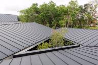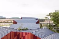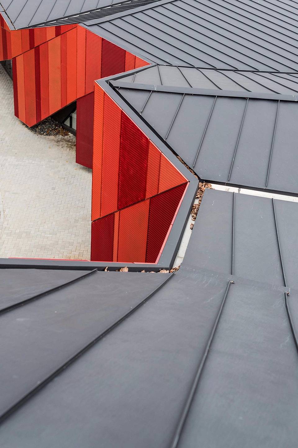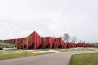 當(dāng)人們離開建筑,到達(dá)場地的南端,便又能看到建筑的完整立面以及它身后的樹林。建筑的形態(tài)使人聯(lián)想到向著地面緩緩延伸下來的連綿起伏的山丘。