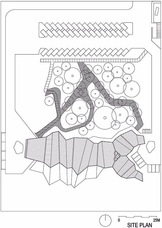 建筑團(tuán)隊(duì)在分析場地的過程中構(gòu)建出了一種不尋常的景觀格局。大量的油棕櫚樹形成了一道邊界,圈定出一個(gè)特殊的區(qū)域。該區(qū)域即是在場地清理之后被保留下來的“橡膠樹林”。這也是整個(gè)設(shè)計(jì)過程的根源所在。