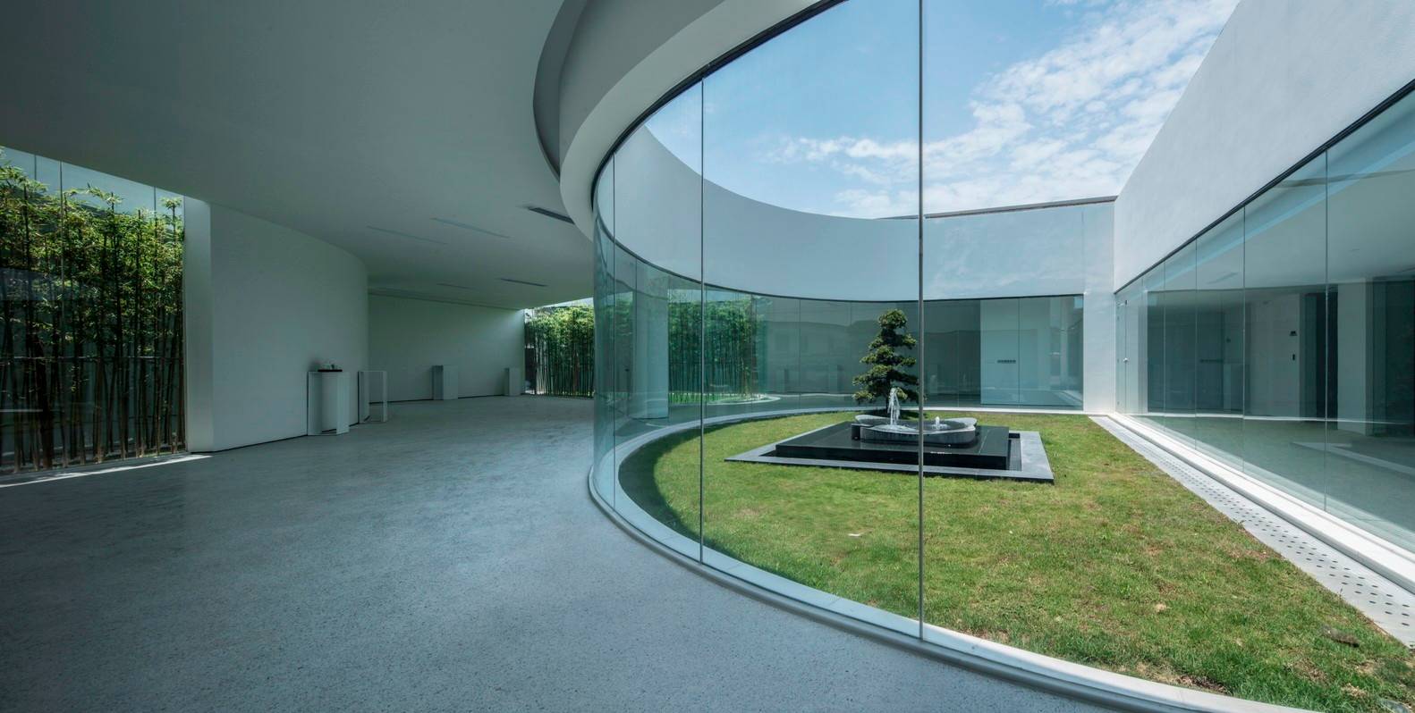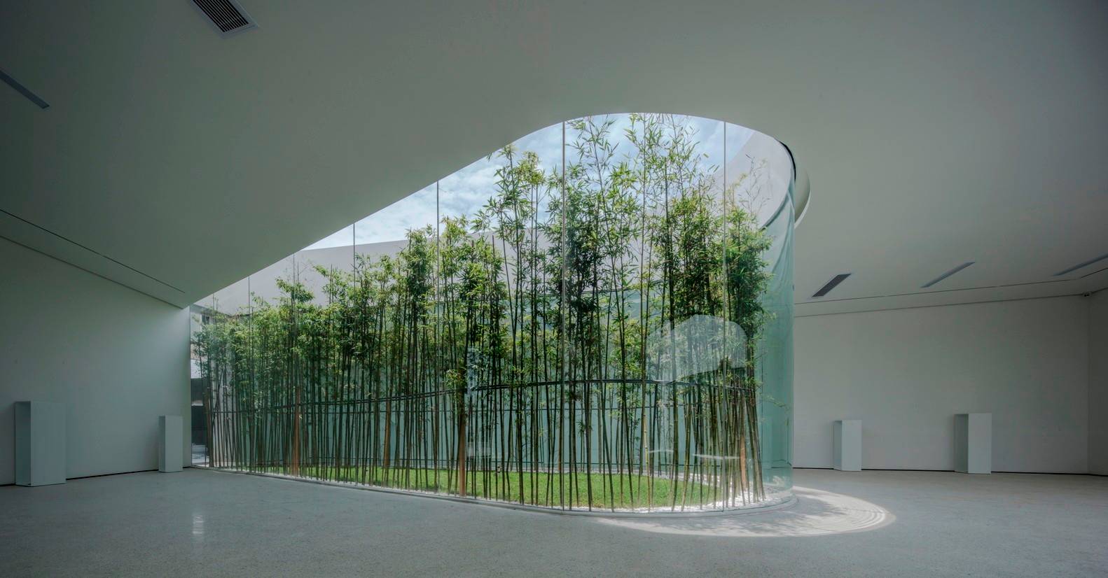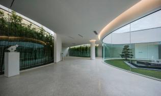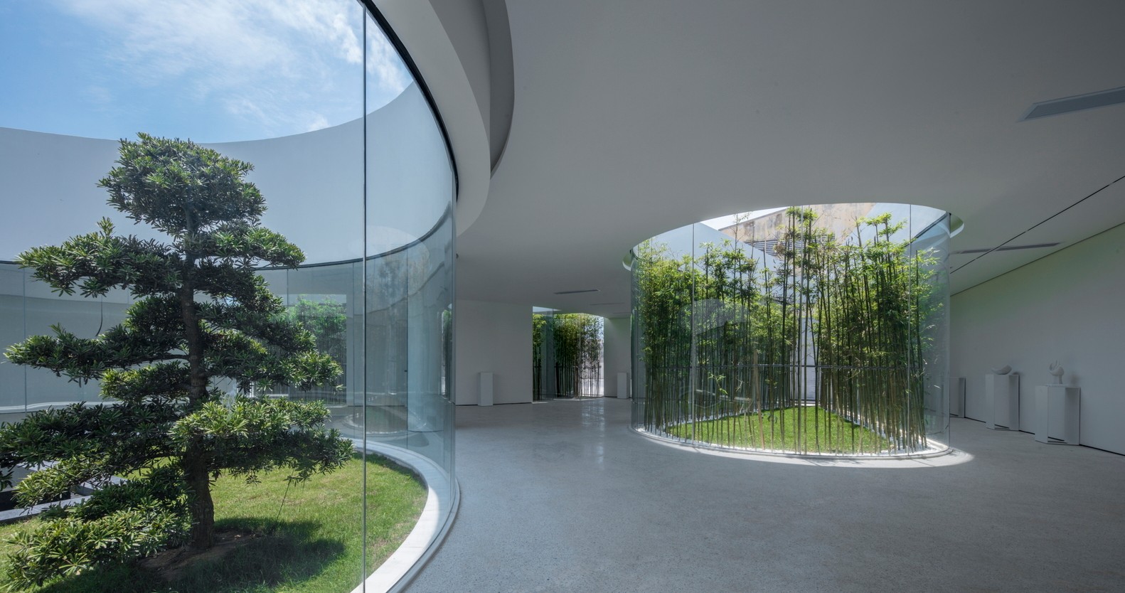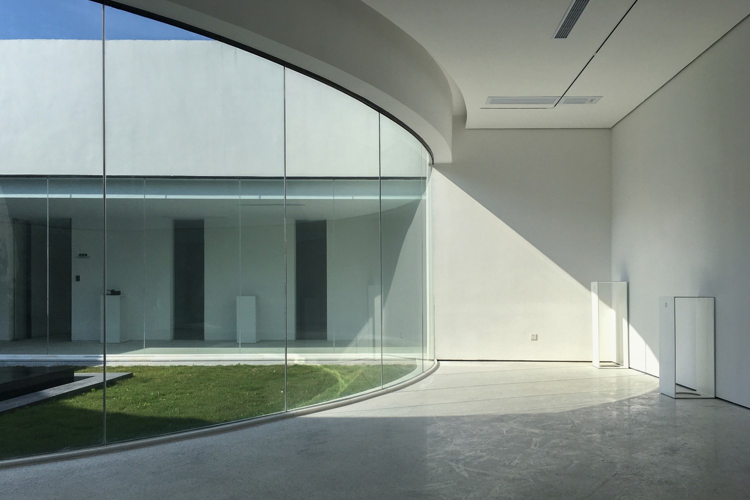 西南角U形天井創(chuàng)造出一面向內(nèi)伸展的天然畫屏,玻璃曲面將天光散射到展廳,營(yíng)造出通透、明亮的體驗(yàn)。