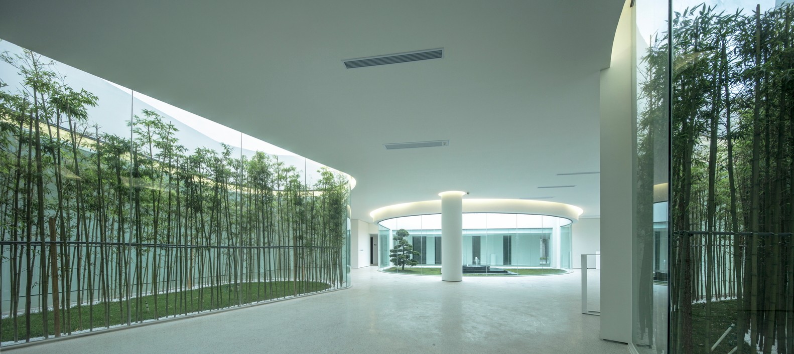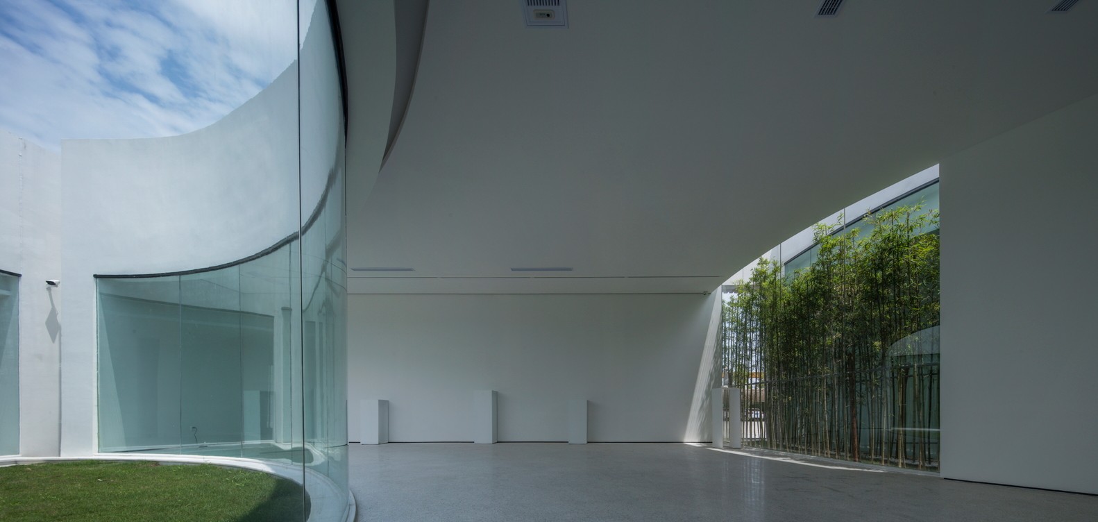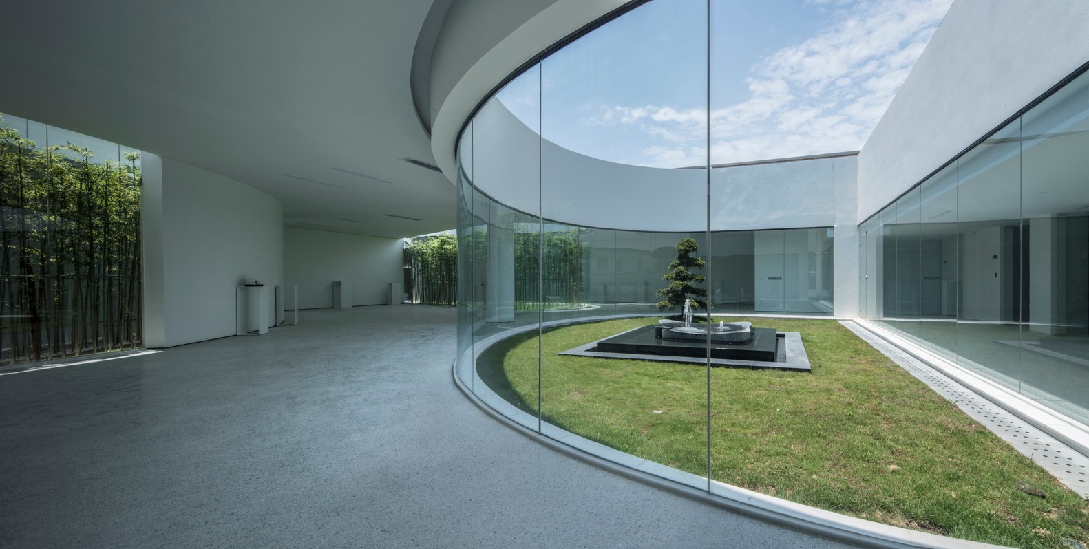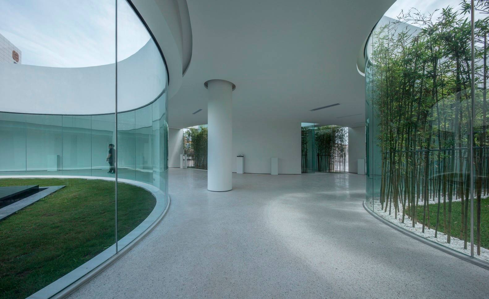 西南角U形天井創(chuàng)造出一面向內(nèi)伸展的天然畫屏,玻璃曲面將天光散射到展廳,營(yíng)造出通透、明亮的體驗(yàn)。
