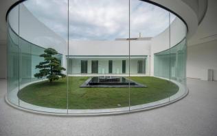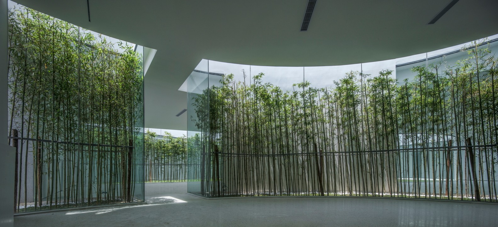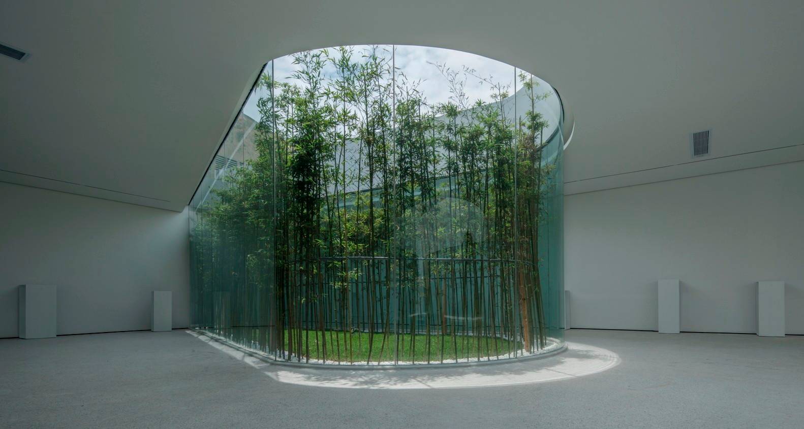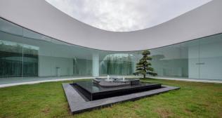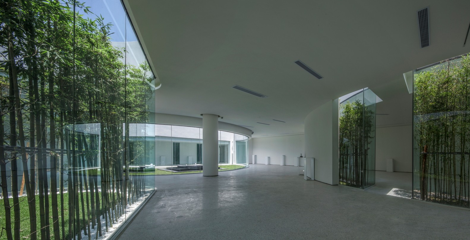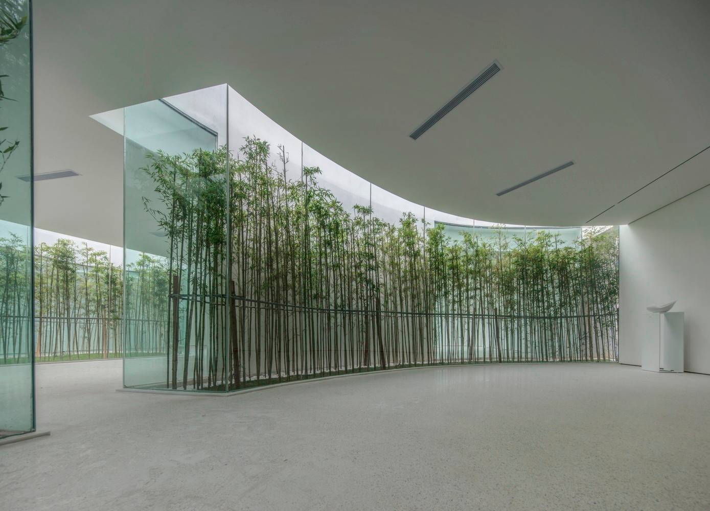 西南角U形天井創(chuàng)造出一面向內(nèi)伸展的天然畫屏,玻璃曲面將天光散射到展廳,營(yíng)造出通透、明亮的體驗(yàn)。