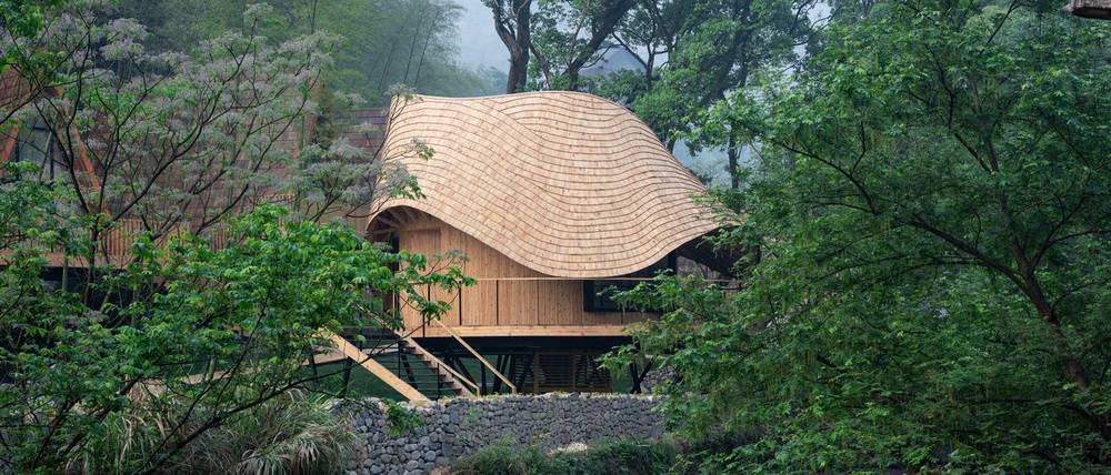 木屋總高約8米,大致與一棵成年毛竹等高,樹屋分為上下兩部分,下部為鋼結(jié)構(gòu)承托柱,上部為木結(jié)構(gòu)主體。樹屋位于小溪堤壩一側(cè),周圍環(huán)抱古樹竹林,隔岸與舊茶廠相望,部分露臺(tái)懸挑與溪水之上,實(shí)現(xiàn)了漂浮感,而且因?yàn)殇撝諗n為幾個(gè)點(diǎn)落在土地上,盡量的減少對(duì)周邊環(huán)境的影響,也獲得了較為自由的地面活動(dòng)空間。