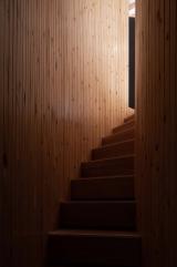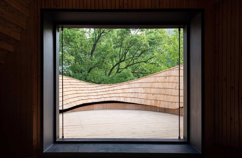 木屋部分分別為三個(gè)非同心圓構(gòu)成: 懸挑在溪邊的露臺(tái),兩層客房部分,以及起伏的屋頂與頂層露臺(tái)。平面形態(tài)則是一個(gè)簡(jiǎn)單的螺旋線,外墻環(huán)繞一圈融入室內(nèi),將盥洗室與步入夾層的樓梯從起居空間中剝離出來(lái)。每扇窗戶都有一份特殊的室外景觀,但最美妙的是爬到屋頂之巔享受山澗的自然氣息。