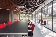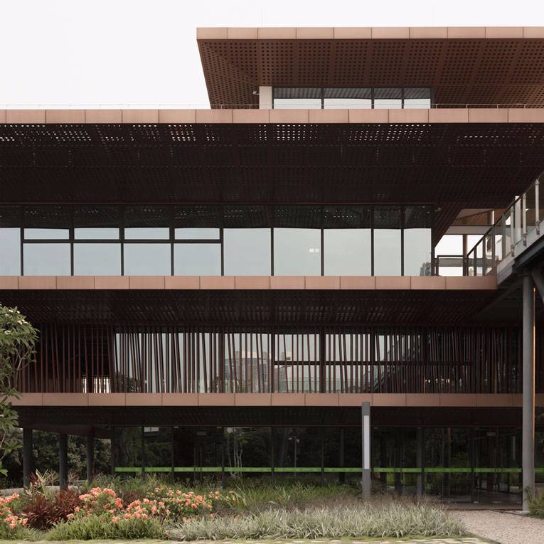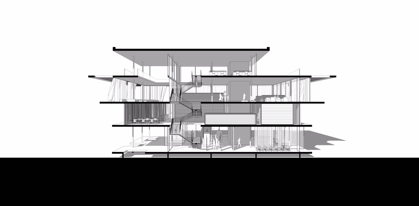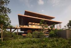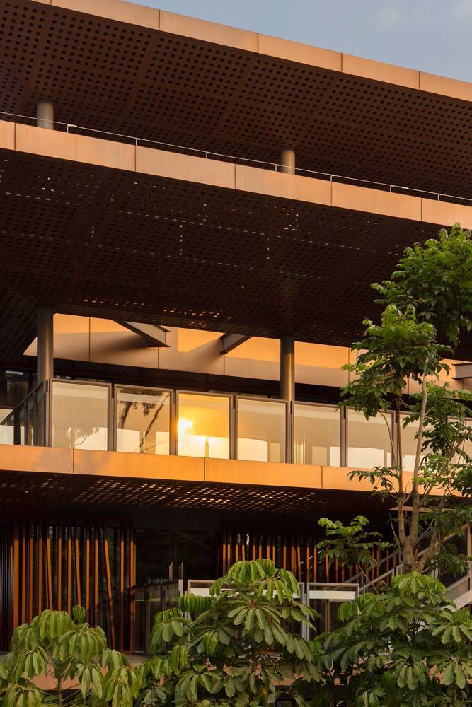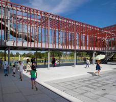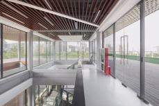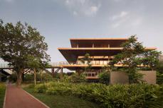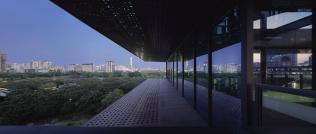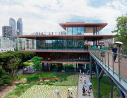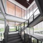 MLA+事務所設計的香蜜科學圖書館是一座輕盈的建筑,它與公園中的“樹頂步道”形成連接。鋼結構和全玻璃立面構成了建筑明亮而通透的基礎。巨大的懸臂式結構覆蓋以金屬涂層,被用于遮擋陽光,其形態(tài)參考了當?shù)亟ㄖ=ㄖ邪瑫h室、閱覽室、書籍雜志區(qū)、露臺以及行政辦公室。公共空間從地面抬升,形成一個全景露臺,強調出對于自然環(huán)境的體驗。