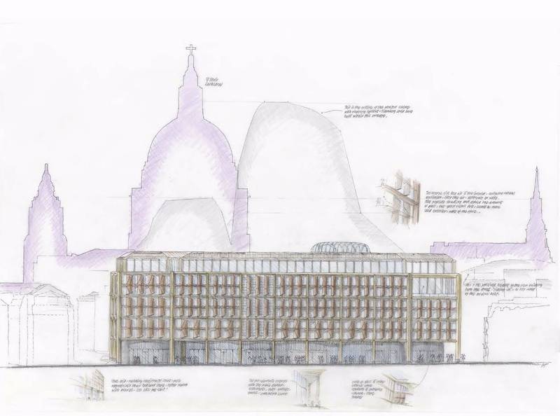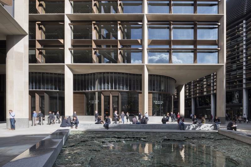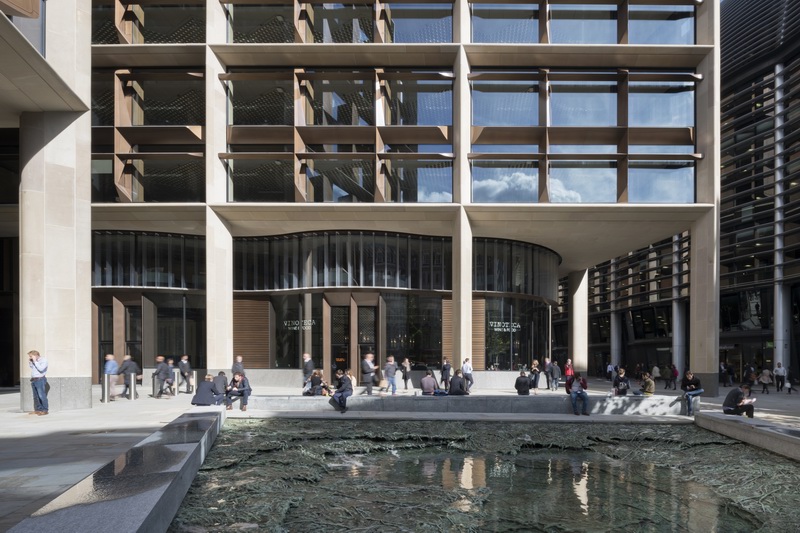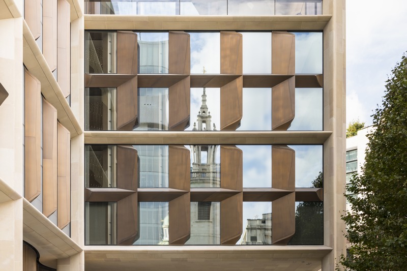建筑的高度保證了圣保羅教堂的主要視野不受遮擋,同時顯示出了對附近歷史建筑的充分尊重。以砂巖打造的結(jié)構(gòu)框架定義出鮮明的立面,一系列巨大的古銅色“扇片”為通高的玻璃墻帶來蔭蔽,同時與旁邊的法院大樓形成呼應(yīng)。扇片的大小、傾斜度和密度依據(jù)朝向和日光照射的不同而產(chǎn)生變化,在為建筑帶來視覺層次和韻律的同時,還構(gòu)成了自然通風(fēng)系統(tǒng)的一部分。