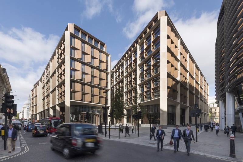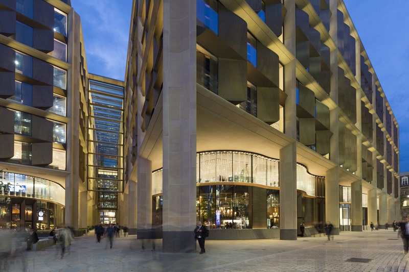 大樓占據(jù)了整個街區(qū),3.2英畝的場地中包含兩座建筑,由一座廊橋相連。廊橋下方的人行道激活了其所在的Watling大街,這座古老的羅馬式街道貫穿了整個場地。Bloomberg拱廊街如今成為了城市中的一條重要通道,餐廳和咖啡廳遍布在首層,后退于由柱廊構(gòu)成的波浪形的帶頂立面之后。三個公共廣場分別位于拱廊街的兩端以及大樓主入口的前方,為方圓一英里的范圍帶來全新的城市空間。