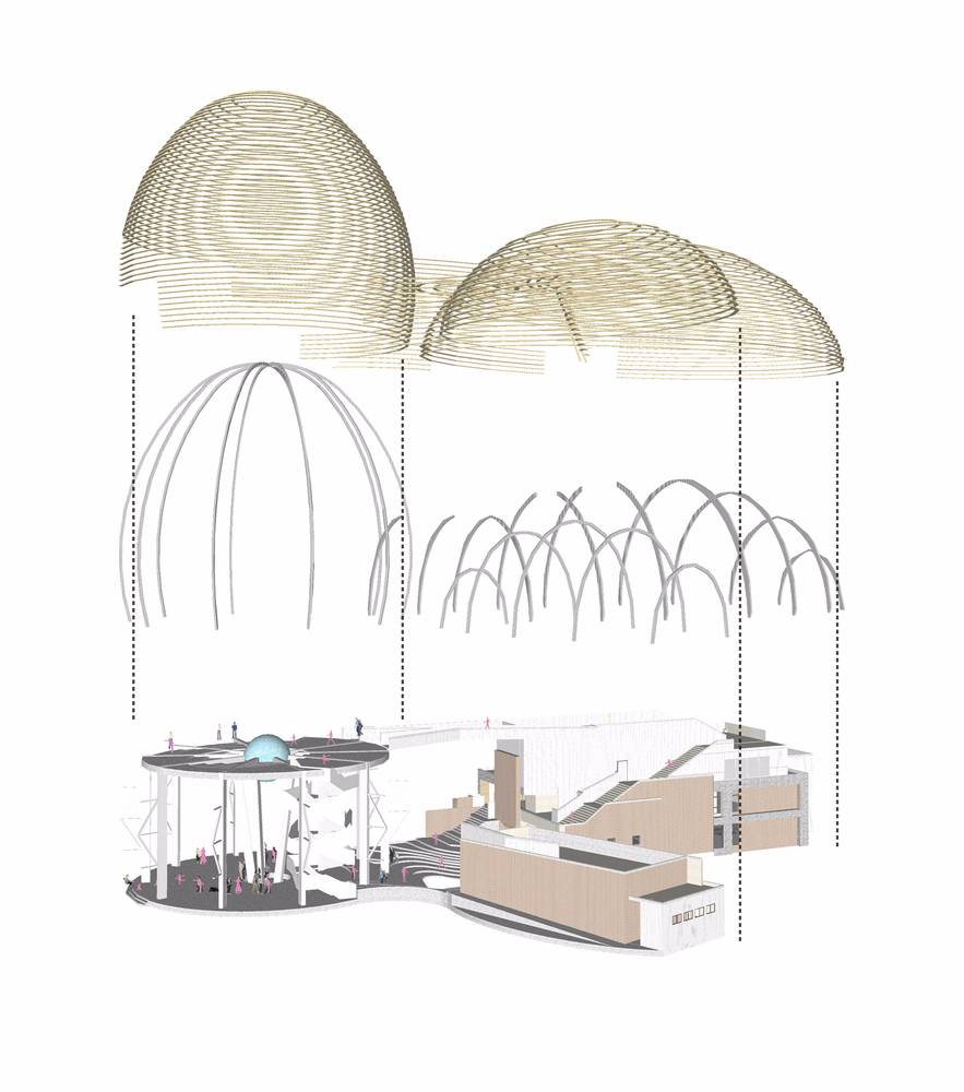 我們以“仿山”的皮層(double skin)結(jié)構(gòu)外罩于各個(gè)機(jī)能建筑體外,形成一錯(cuò)落疊砌的“群山”概念,而山的皮層主要由模矩化的鋼骨與鋁格柵組構(gòu)而成。