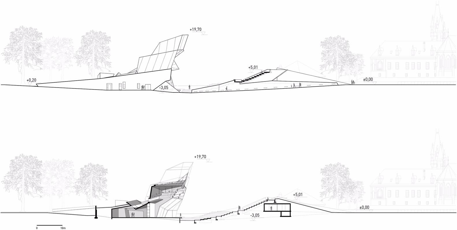 作為一個(gè)空間形象,展館是由景觀元素——凹陷、斜坡、切口、山丘——和屋頂?shù)慕ㄖ郫B產(chǎn)生的。