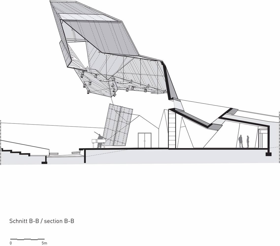 概念上,展館不受任何特定目的和功能約束,只在表演中被視為一個(gè)舞臺(tái)。這樣一個(gè)自由的結(jié)構(gòu)如何能作為一種聲學(xué)樂(lè)器,能夠聚焦聲音能量,并擁有1700個(gè)座位,以獲得理想的音樂(lè)體驗(yàn)?