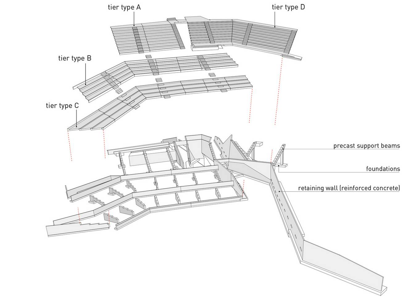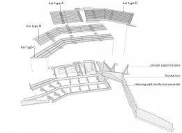 材料的選擇強(qiáng)調(diào)了場(chǎng)地的露天特性,并加強(qiáng)了建筑結(jié)構(gòu)和景觀之間的聯(lián)系。舞臺(tái)是一個(gè)整體結(jié)構(gòu)的清水混凝土,鋼和玻璃嵌入圍繞的小山。觀眾層采用預(yù)制混凝土構(gòu)件、密實(shí)的礫石表面和草坪覆蓋的幾何精確的小山進(jìn)行設(shè)計(jì)。