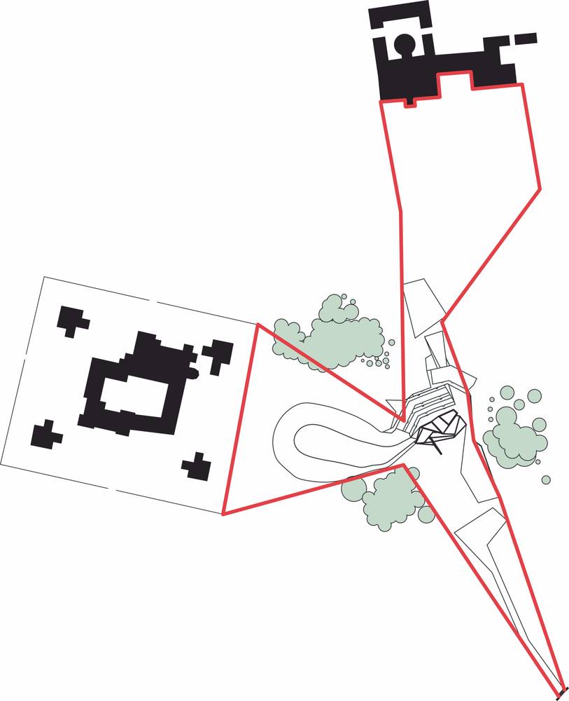 展館是插入到現(xiàn)有的大門、騎術(shù)學(xué)校、城堡、“黑門”和“Gro?e Senke”(大意為下沉位置)相關(guān)聯(lián)的區(qū)域,在這個(gè)過(guò)程中,將景觀中的視圖網(wǎng)絡(luò)重新置于語(yǔ)境中。通過(guò)它的地形配置,用透視和視覺(jué)關(guān)系、收縮和擴(kuò)張、封閉和開放的游戲。重新詮釋了景觀花園的形式元素—。