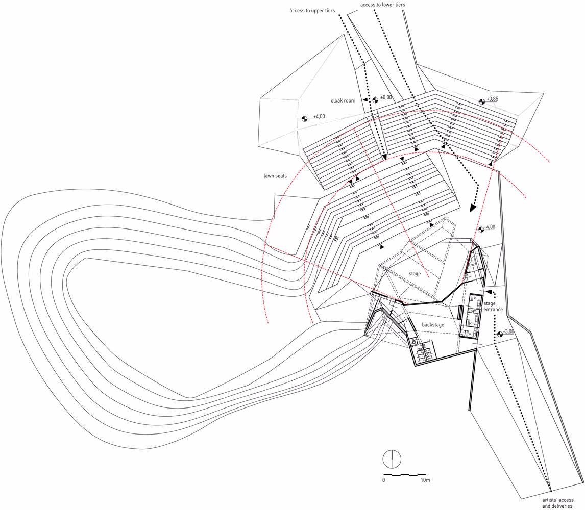 露天舞臺(tái)聲學(xué)的基本規(guī)則是,“你所看到的就是你所聽到的”,這可以作為一個(gè)線索來(lái)探索透視和聲學(xué)空間之間的密切關(guān)系?,F(xiàn)有的地形下沉——“Gro?e Senke”——通過(guò)地形建模被強(qiáng)調(diào)出來(lái)。 人工山丘是通過(guò)進(jìn)一步挖掘洼地,然后在其周邊重新分配土壤,從而創(chuàng)建禮堂層。盡管如此,舞臺(tái)和觀眾席與場(chǎng)地的地形流暢地結(jié)合在一起,這明顯地區(qū)別于自然地形。