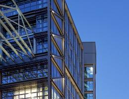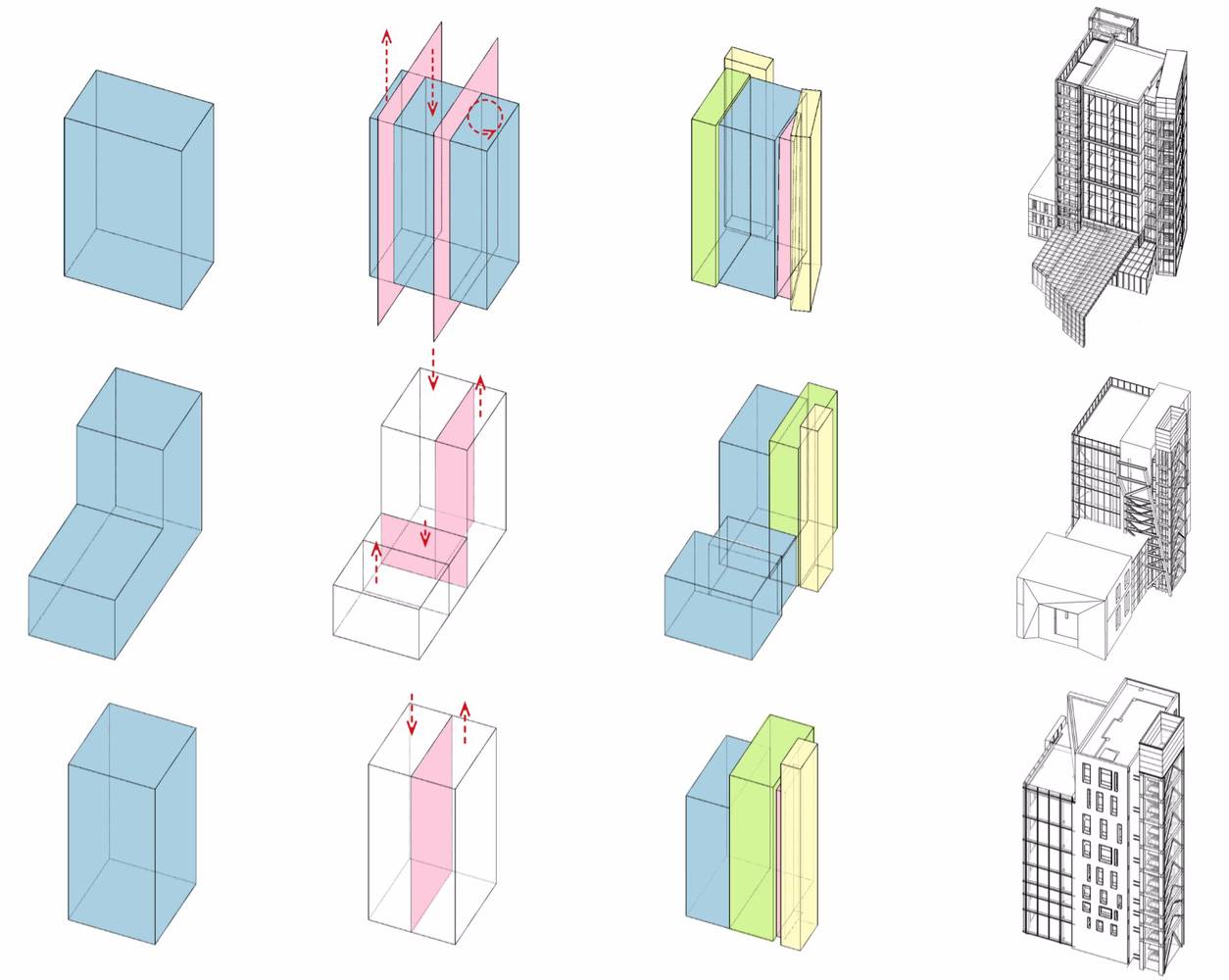 要想保留原有遺存的混凝土和鋼框架,就必須不破壞其自身的結(jié)構(gòu)強(qiáng)度。設(shè)計(jì)把原有結(jié)構(gòu)空間作為主要功能空間使用,而把樓電梯間外置,這樣既不打穿原有樓板,又通過(guò)加建補(bǔ)強(qiáng)了原結(jié)構(gòu)剛度。同時(shí),通過(guò)碳纖維、鋼板和阻尼抗震撐等手段對(duì)原有主體結(jié)構(gòu)加固以適應(yīng)新的功能需求,類似結(jié)構(gòu)構(gòu)建也作為了建筑立面核心表現(xiàn)的元素。輕質(zhì)的石英板材和穿孔鋁板的使用也契合了改造建筑嚴(yán)控外墻材料容重的原則,避免給原有結(jié)構(gòu)帶來(lái)過(guò)大結(jié)構(gòu)負(fù)荷。