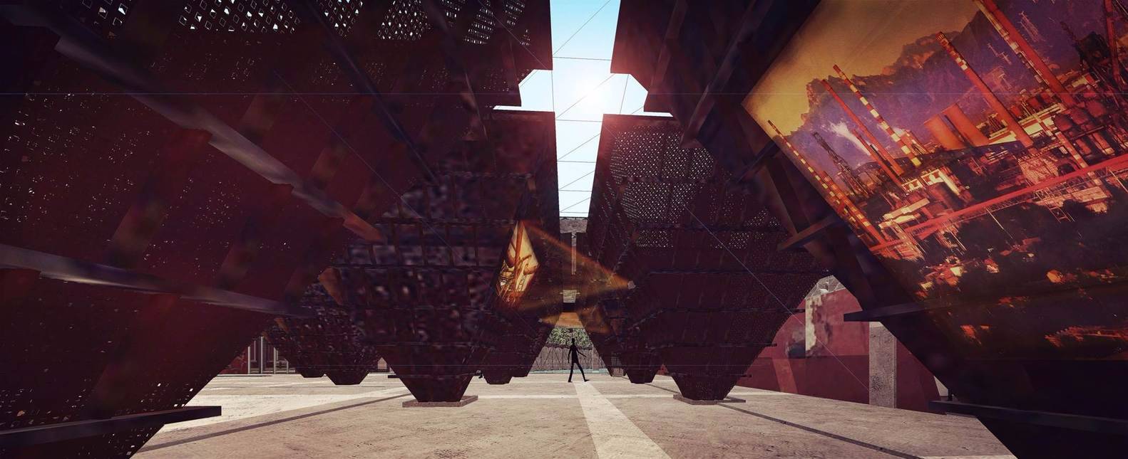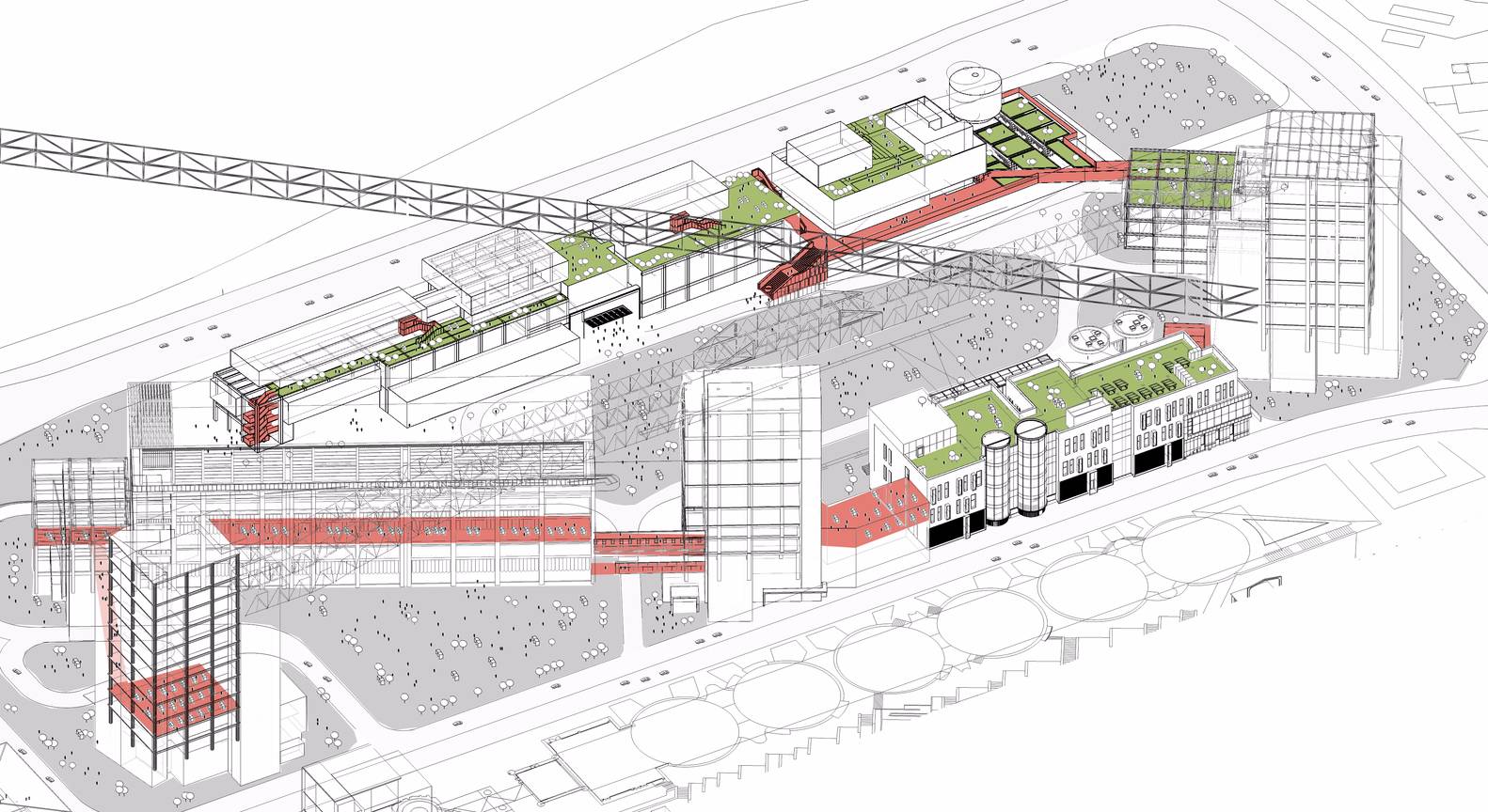 作為一、三號(hào)高爐的主要供料區(qū),區(qū)域內(nèi)原有料倉(cāng)、轉(zhuǎn)運(yùn)站和皮帶通廊等工業(yè)遺存都是完全依據(jù)生產(chǎn)的工藝流程而布局的,缺少城市空間的秩序感,巨型工業(yè)尺度也讓人缺乏親近和安全感。