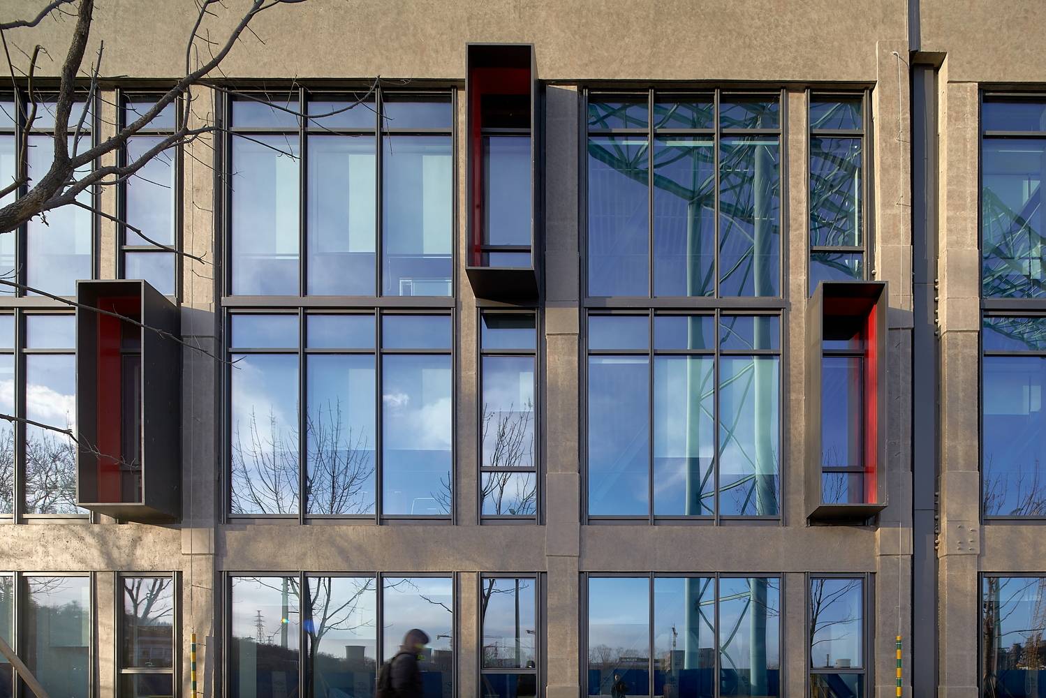 設(shè)計(jì)在幾十乃至上百米的工業(yè)尺度和精巧的人體工程學(xué)尺度之間植入了一到兩層的中尺度新建筑,銹蝕耐候鋼門(mén)頭、玻璃門(mén)廳和邊庭、遮陽(yáng)棚架等建構(gòu)筑物盡力彌合了原有大與小尺度的差異。保留的鍋爐房小水塔改造的特色奧運(yùn)展廳和干法除塵器前壓差發(fā)電室改造的咖啡廳等一系列和人性尺度相關(guān)的小尺度建筑也為園區(qū)塑造細(xì)膩豐富的尺度關(guān)系增添了精彩的亮色。