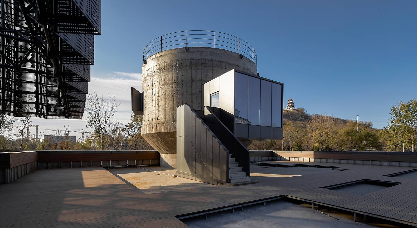 聯(lián)合泵站西側(cè)的原鍋爐房小水塔是設(shè)計(jì)踏勘時(shí)被建議保留的一座小構(gòu)筑物,精致而出彩。水塔一樓的半開(kāi)敞環(huán)形吧臺(tái)讓它成為了展廳的有機(jī)組成部分,二樓開(kāi)出的四個(gè)窗洞則分別向四個(gè)方位指向功碑閣、三高爐、秀池和天車廣場(chǎng),形成獨(dú)具魅力的框景,我們稱之為“首鋼之眼“,通過(guò)它,可以以一種切口的方式一窺園區(qū)重要工業(yè)景致。