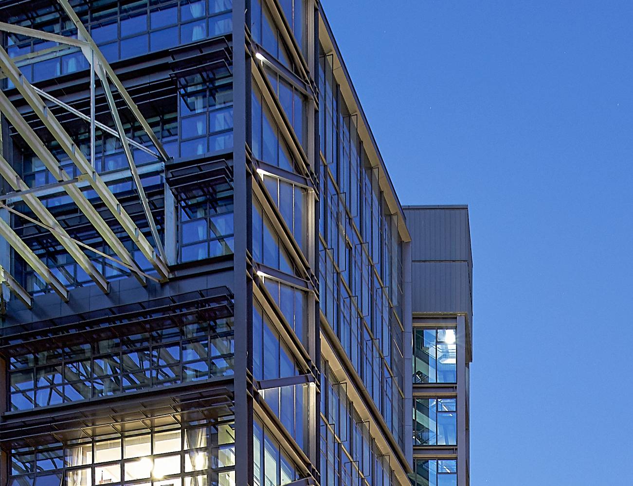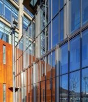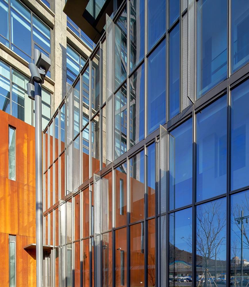 為了凸顯工業(yè)構(gòu)架的力量美,避免因?yàn)殚_(kāi)啟扇的凌亂弱化遺存與插建間的虛實(shí)體量,設(shè)計(jì)采用了垂直彩釉飛翼、水平遮陽(yáng)百葉、折尺形玻璃飛翼和穿孔板等多種遮蔽方式以及雙層幕墻空腔及內(nèi)天井排風(fēng)等手段,希望外墻開(kāi)窗盡可能消隱。但事與愿違,辦公樓的使用方希望多數(shù)房間可以直接在幕墻上手動(dòng)開(kāi)窗,這較大顛覆了原有開(kāi)窗系統(tǒng),對(duì)立面效果有一定影響。