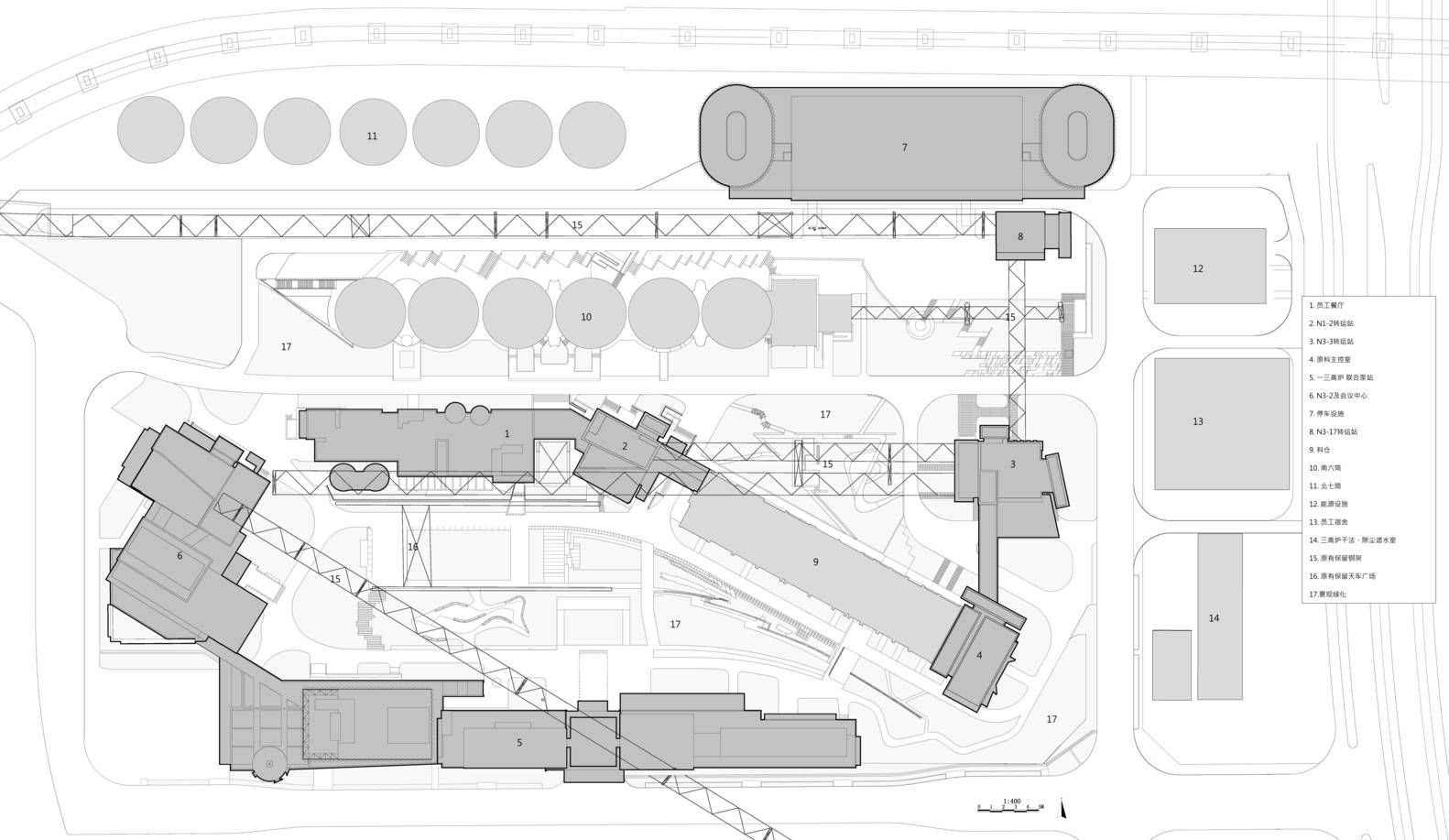 冬奧廣場(chǎng)基地南側(cè)的秀池和西側(cè)的石景山山體及永定河生態(tài)綠廊,為項(xiàng)目帶來(lái)了絕佳的外部山水自然環(huán)境。而與之對(duì)應(yīng)的則是基地內(nèi)部的筒倉(cāng)、料倉(cāng)、供料通廊、轉(zhuǎn)運(yùn)站及供水泵站的密集布局,它是園區(qū)一號(hào)、三號(hào)煉鐵高爐煉鐵工藝的復(fù)雜巨系統(tǒng)中的重要組成部分。這一密集供料區(qū)的轉(zhuǎn)運(yùn)站、料倉(cāng)、筒倉(cāng)和泵站等十個(gè)工業(yè)遺存,正籍由冬奧的強(qiáng)大助推,被改造為集辦公、會(huì)議、展示和配套休閑于一體的綜合園區(qū)。