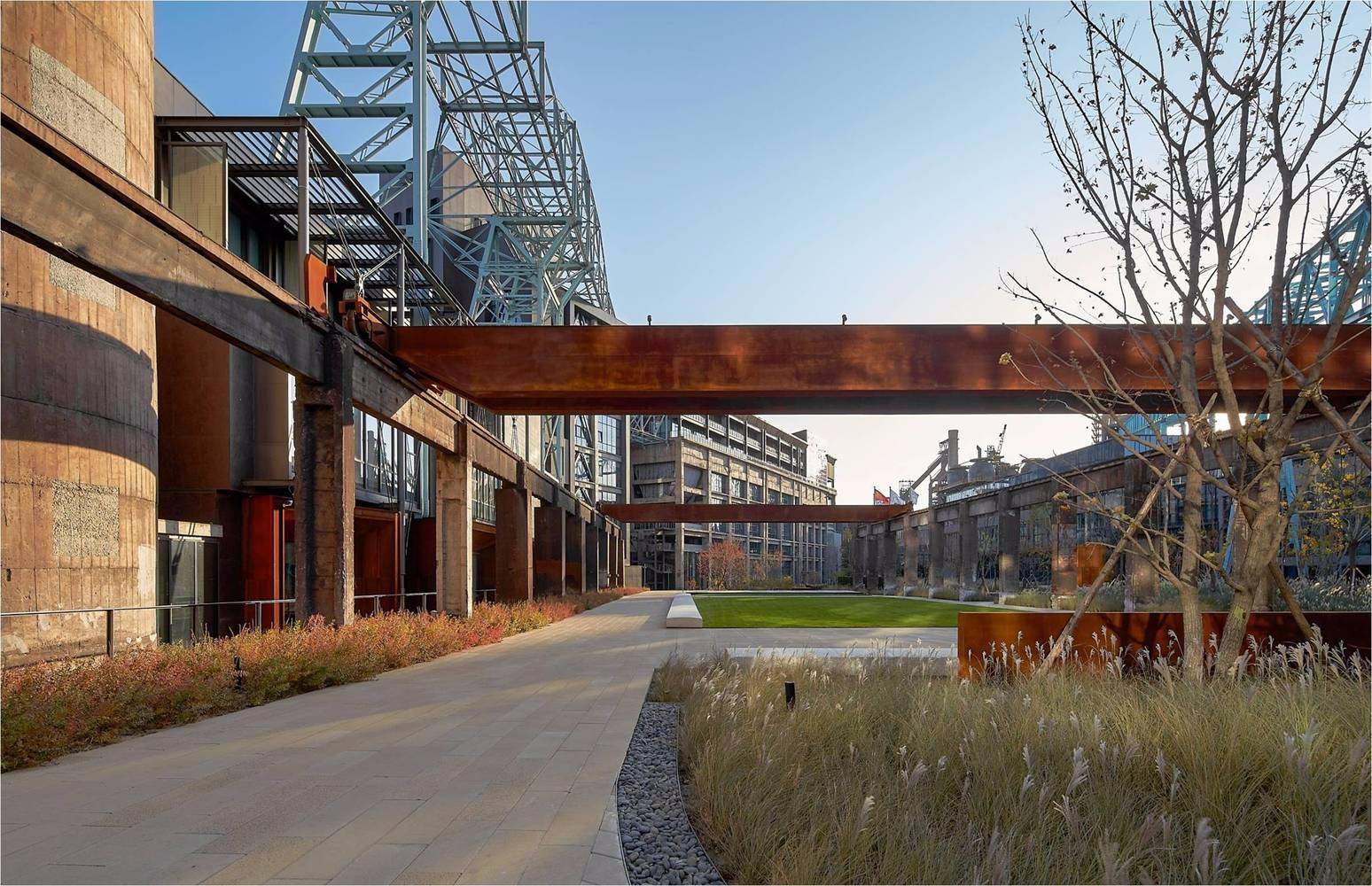 設(shè)計(jì)師為園區(qū)設(shè)置了一條穿行于建筑之間和屋面的室外樓梯+棧橋的步行系統(tǒng),這為整個(gè)建筑群在保持工業(yè)遺存原真性的同時(shí)疊加了園林化特質(zhì)。整組建筑就是一個(gè)立體的工業(yè)園林,步移景異間,傳遞出一種中國(guó)特有的空間動(dòng)態(tài)閱讀方式。