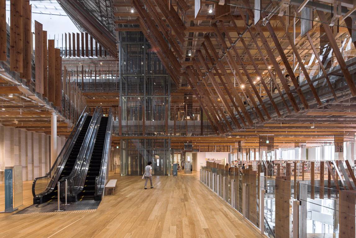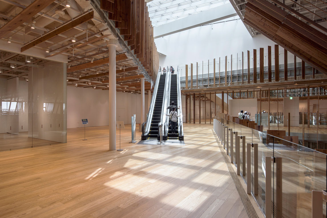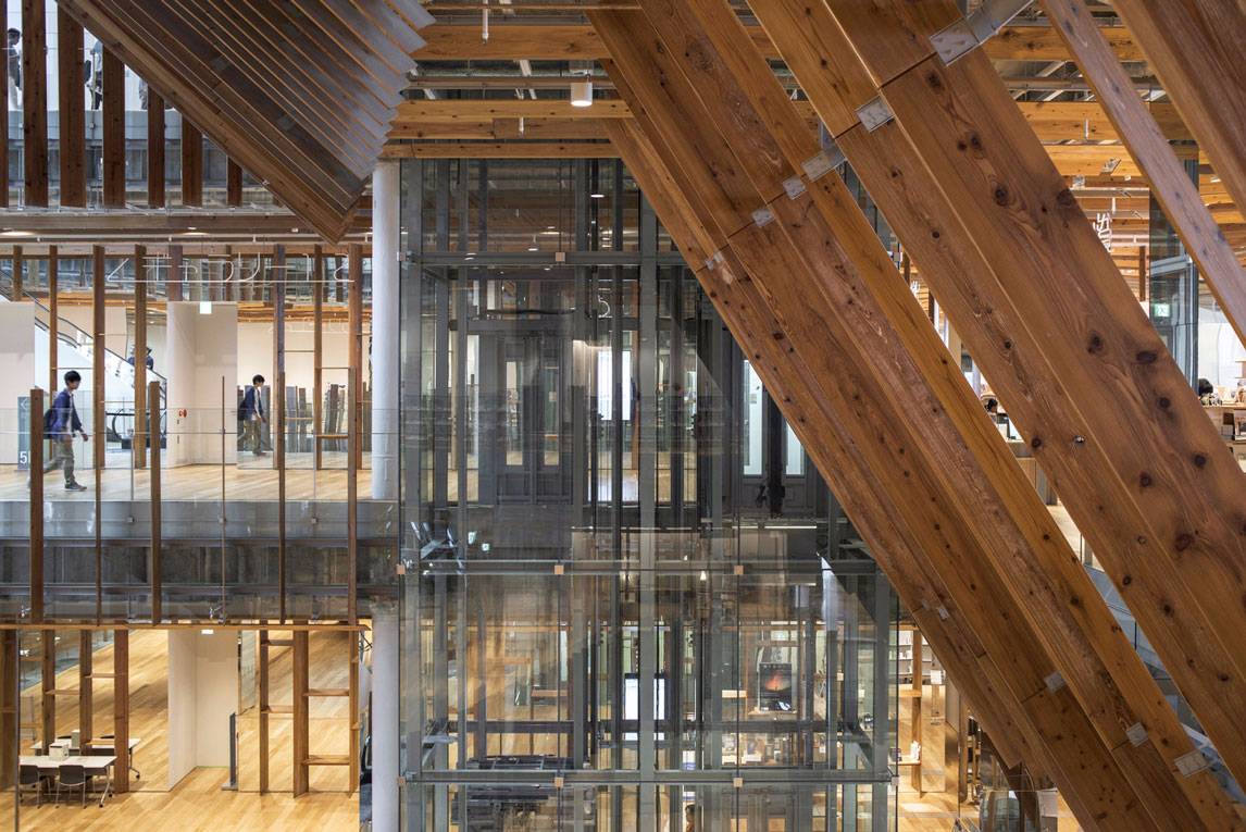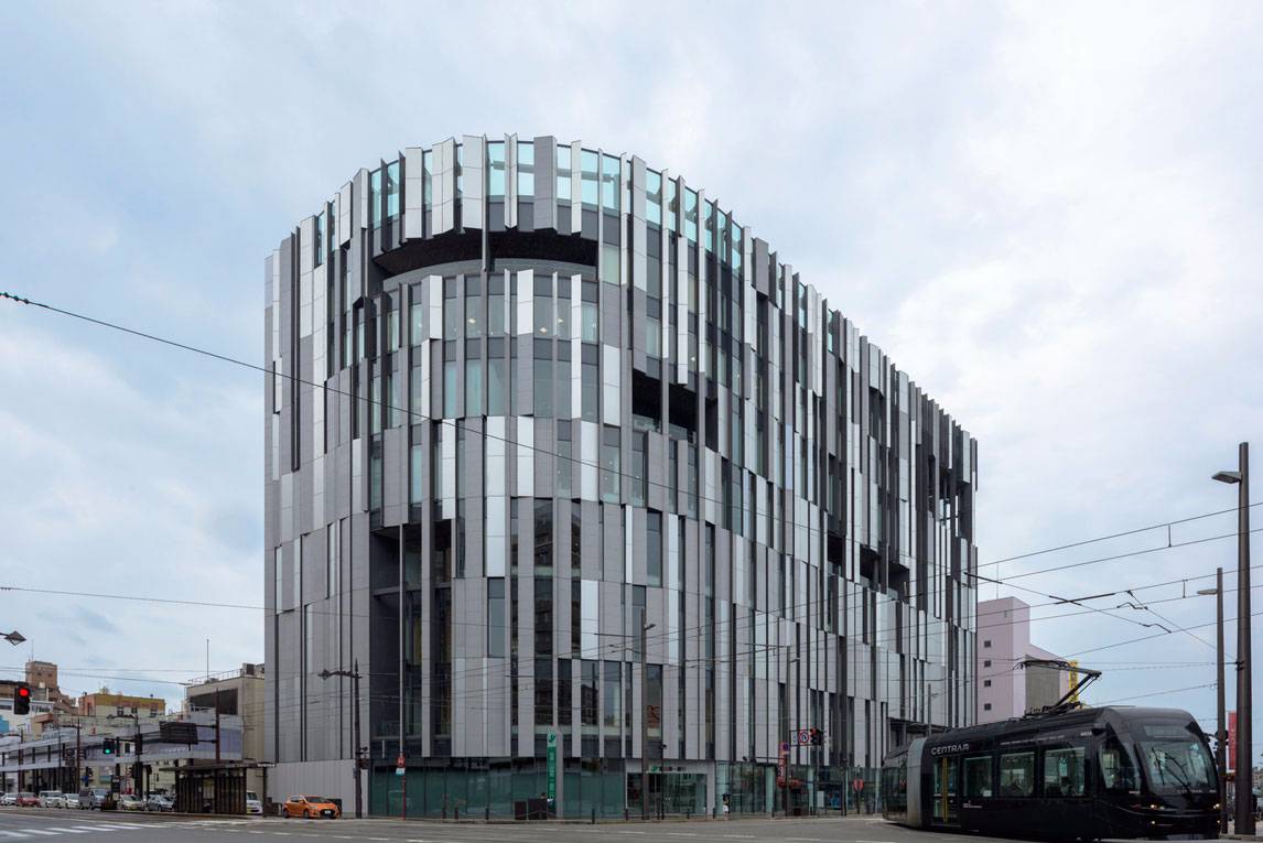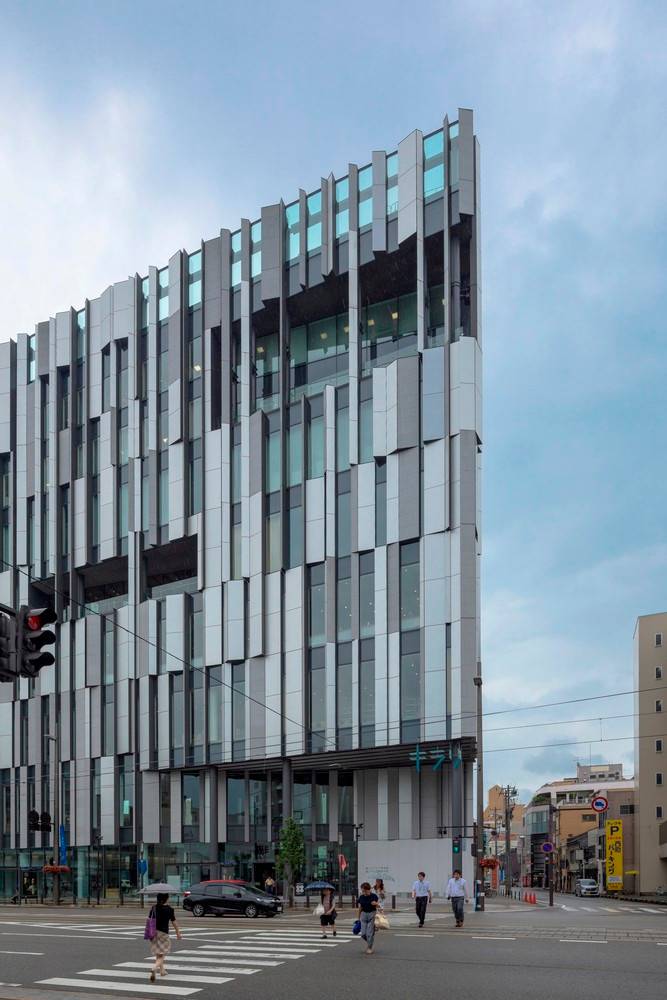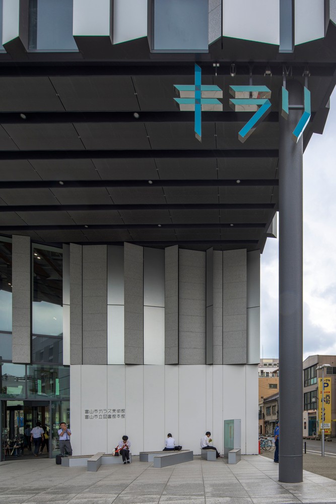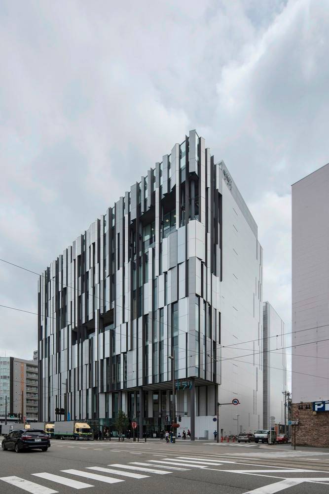 福山希良梨大樓位于富山市中心。這座文化綜合體將玻璃藝術(shù)博物館、城市圖書館和當(dāng)?shù)劂y行整合在一棟建筑中。