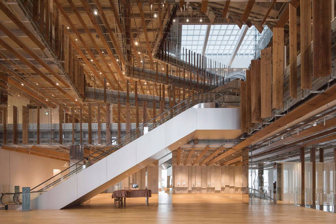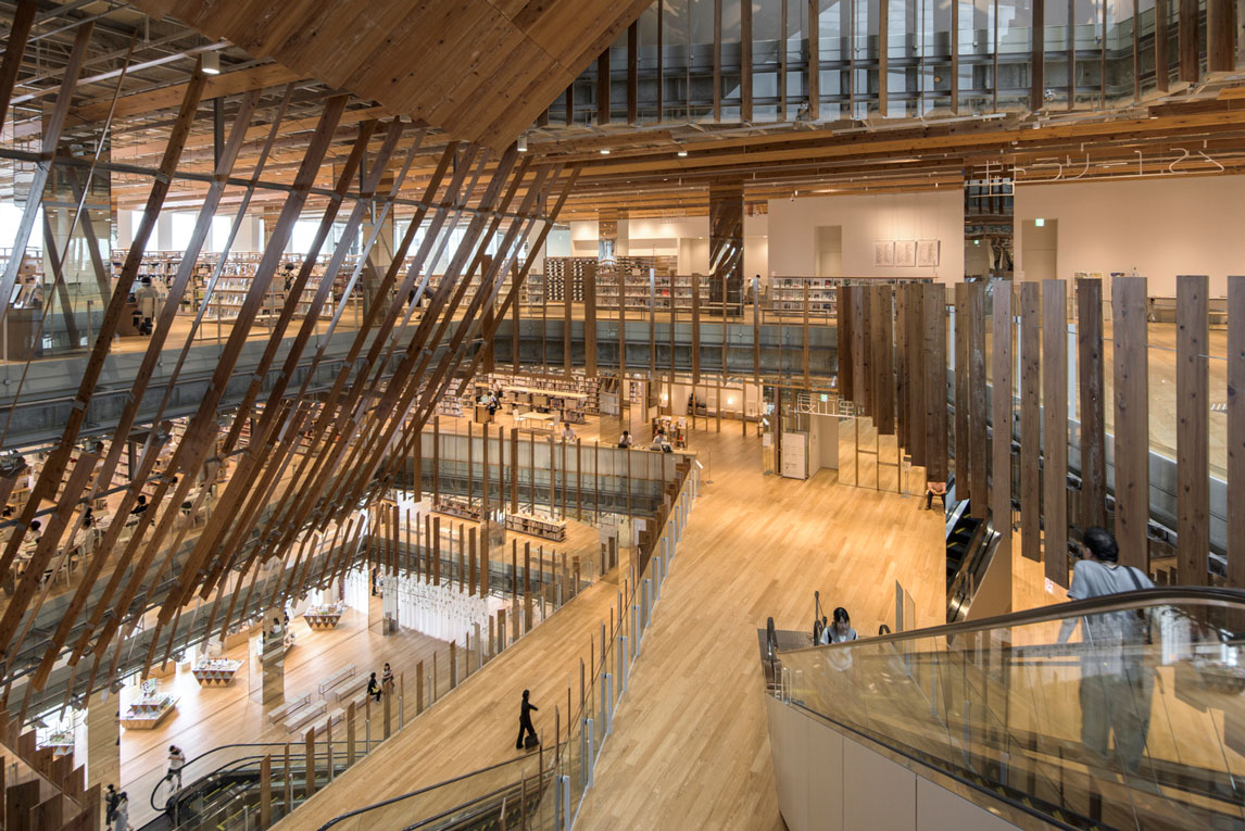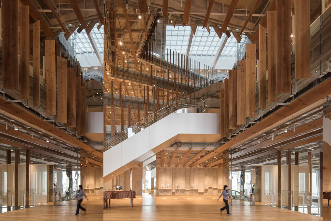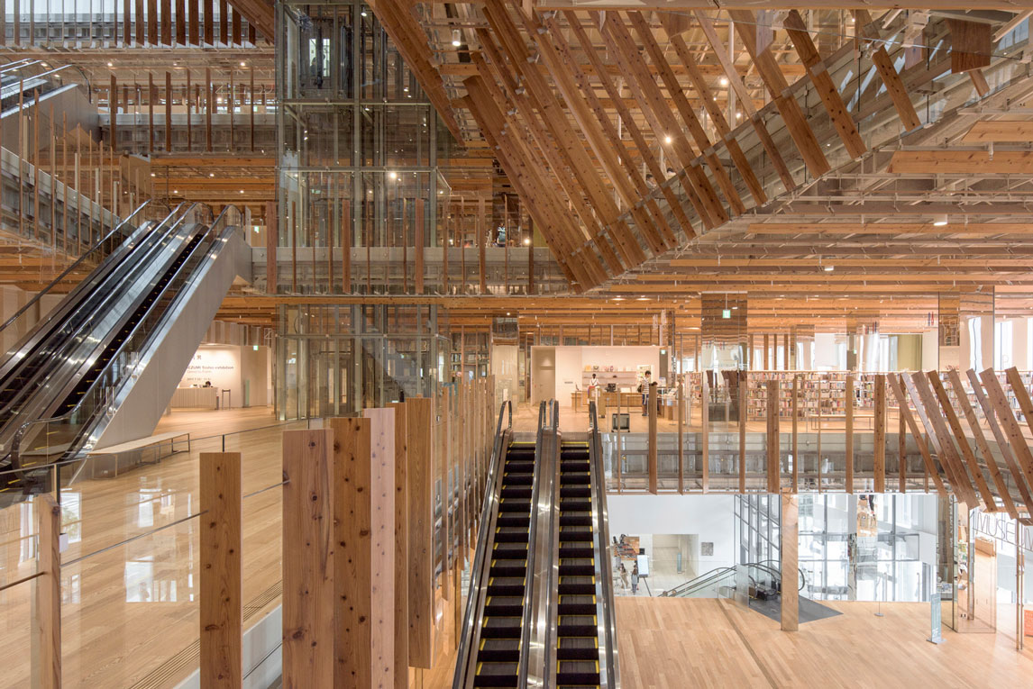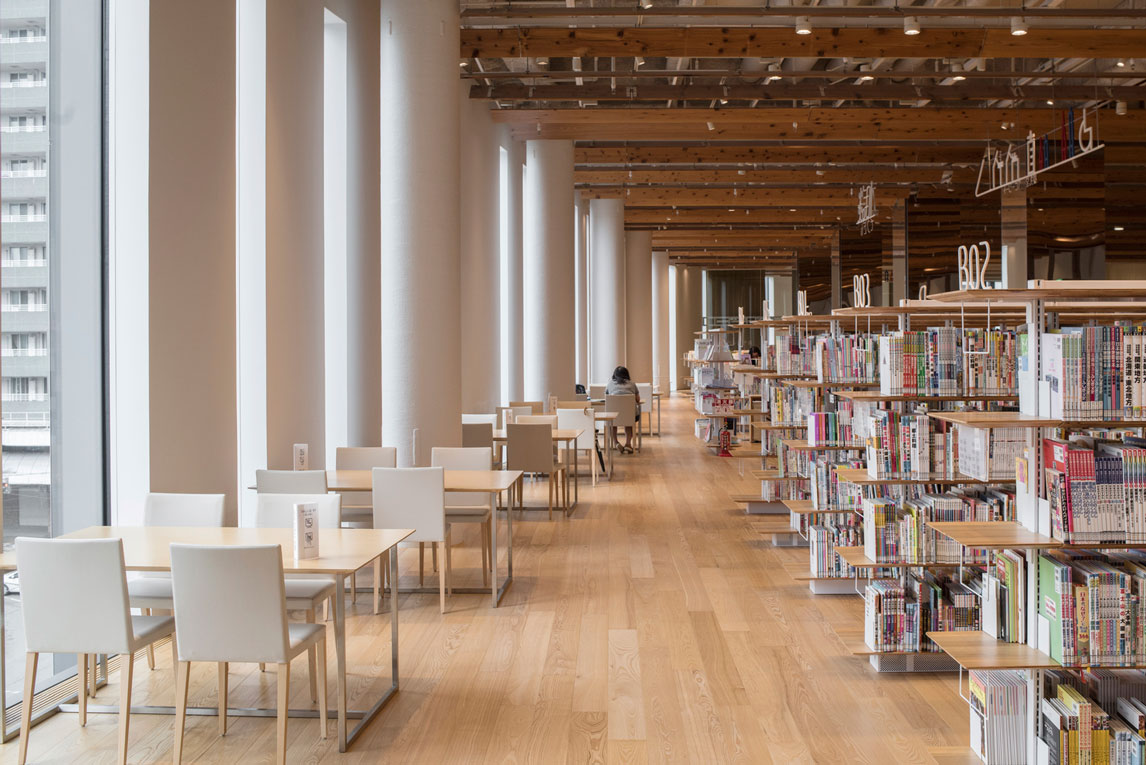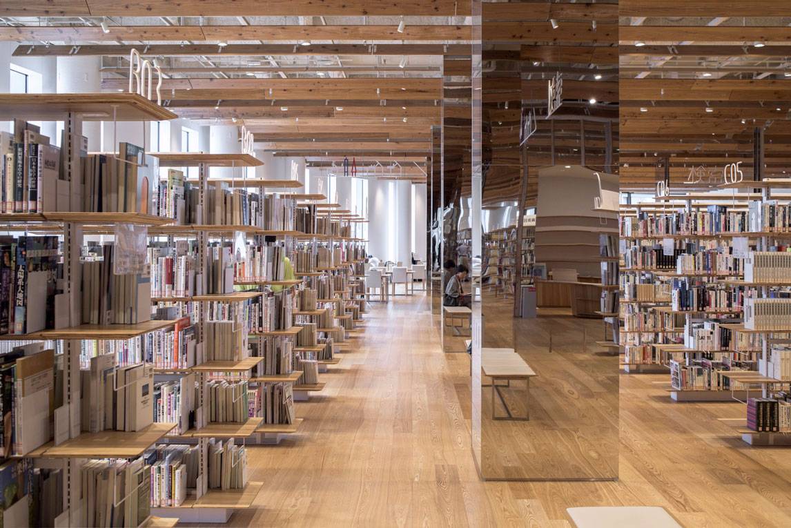 福山希良梨大樓位于富山市中心。這座文化綜合體將玻璃藝術(shù)博物館、城市圖書館和當(dāng)?shù)劂y行整合在一棟建筑中。