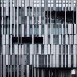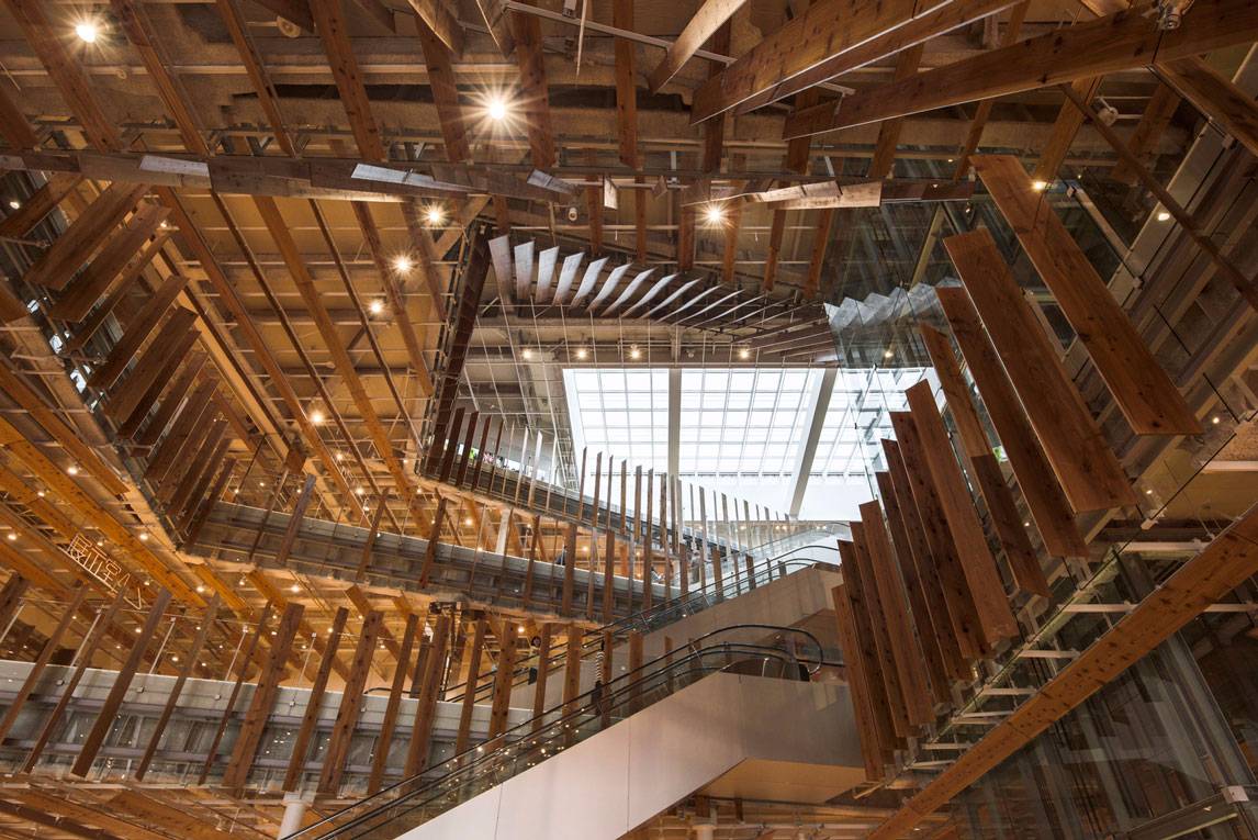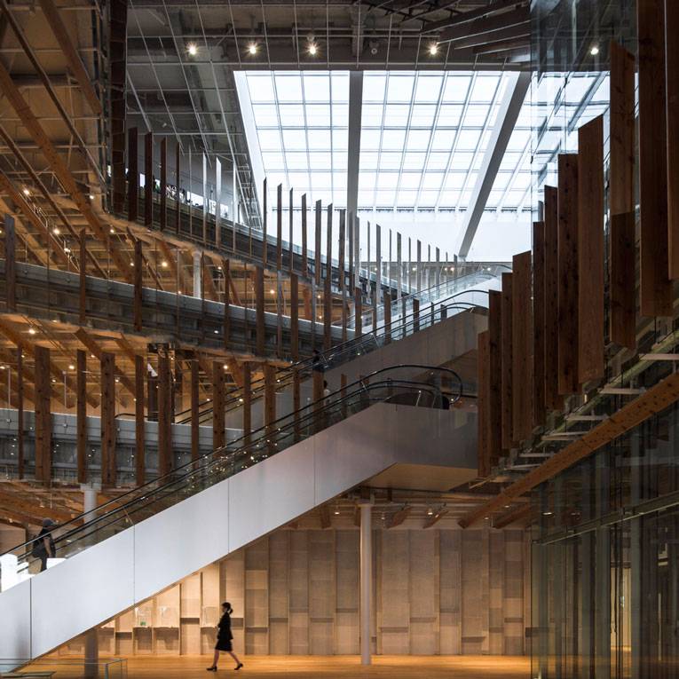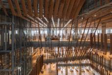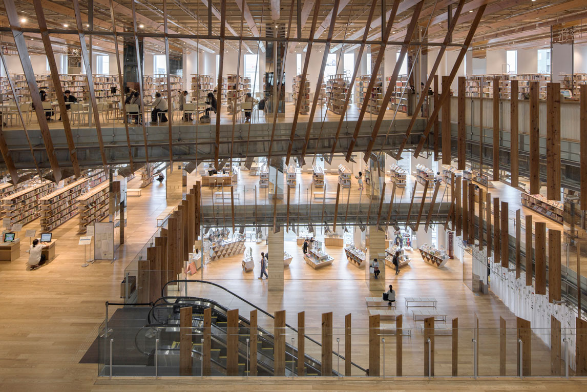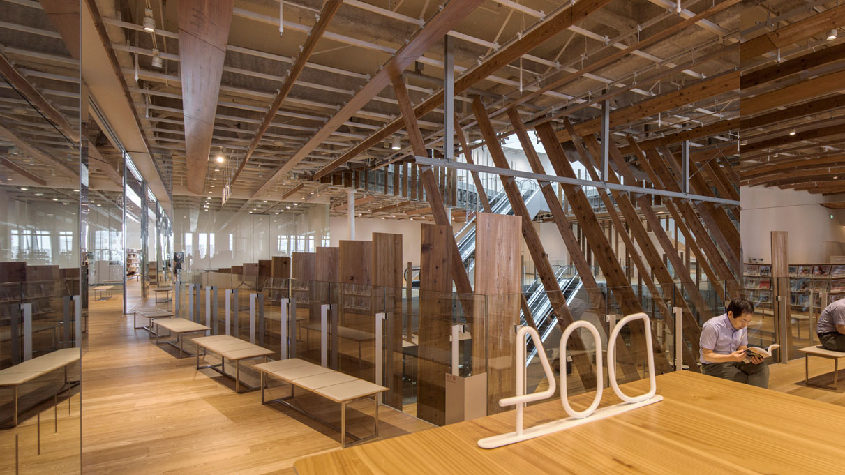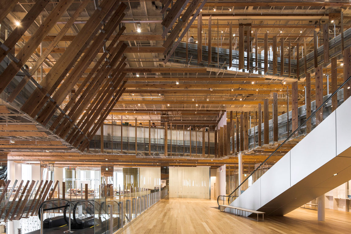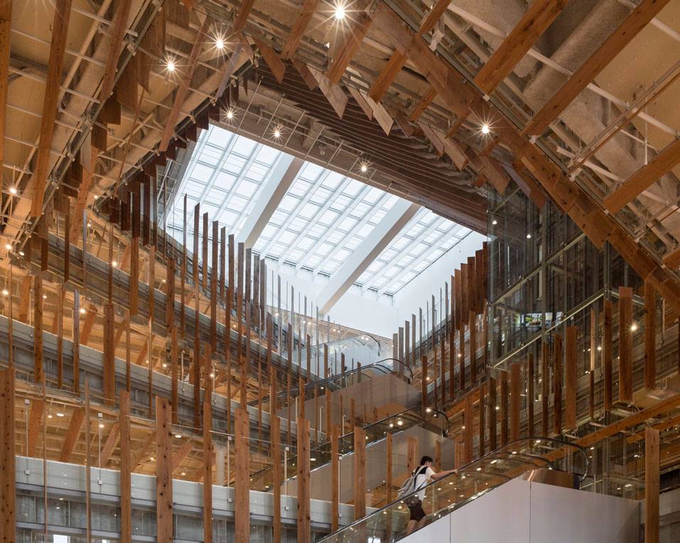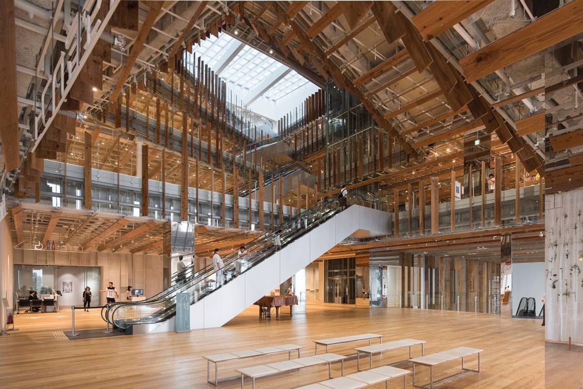 福山希良梨大樓位于富山市中心。這座文化綜合體將玻璃藝術(shù)博物館、城市圖書館和當(dāng)?shù)劂y行整合在一棟建筑中。