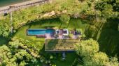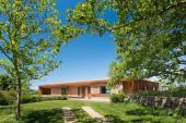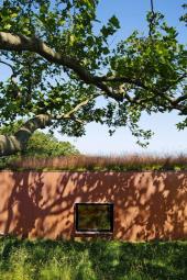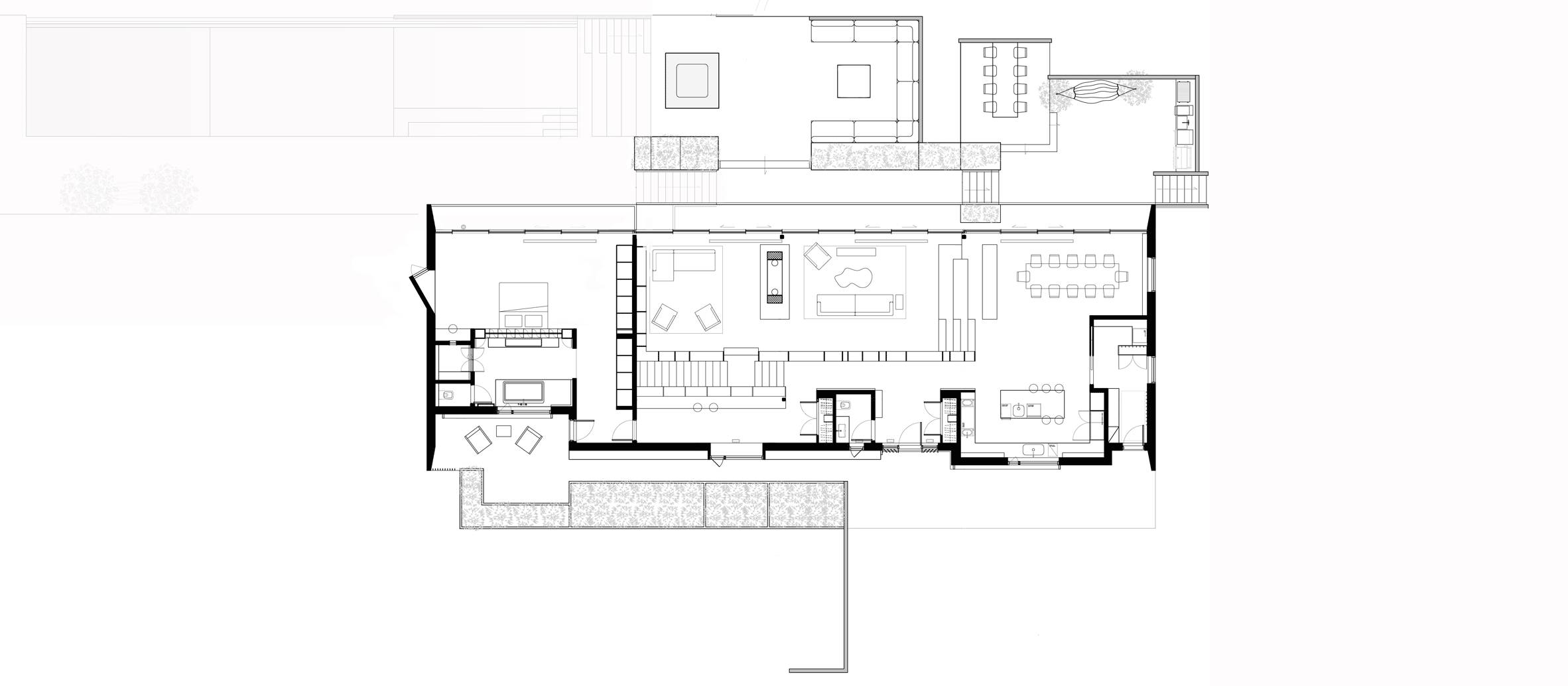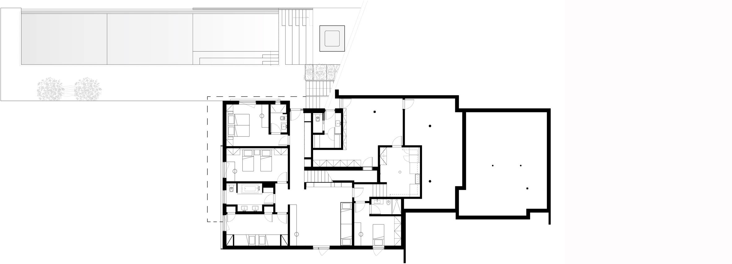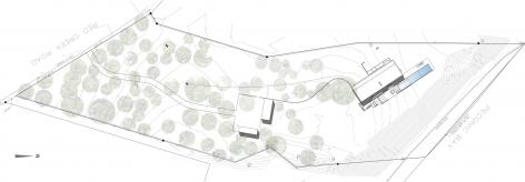 住宅呈細(xì)長條狀,位于小山的山頂上,供整個家庭使用。這座建筑沿東西走向設(shè)置,沿著場地的斜坡排布,給人一種從地面上冒出來的感覺。階梯狀的露臺嵌入到地塊內(nèi)部,最下方設(shè)有一個無邊泳池,在泳池的兩端均可以俯瞰到大海??颇峥俗≌奈蓓敱还嗄緟哺采w,與周圍草坪和樹木的綠色色調(diào)相協(xié)調(diào)。為了能夠延續(xù)住宅與環(huán)境相融的理念,事務(wù)所為房子選用了一種大地色的外觀。