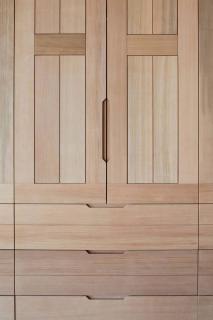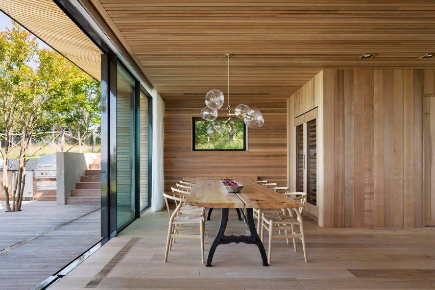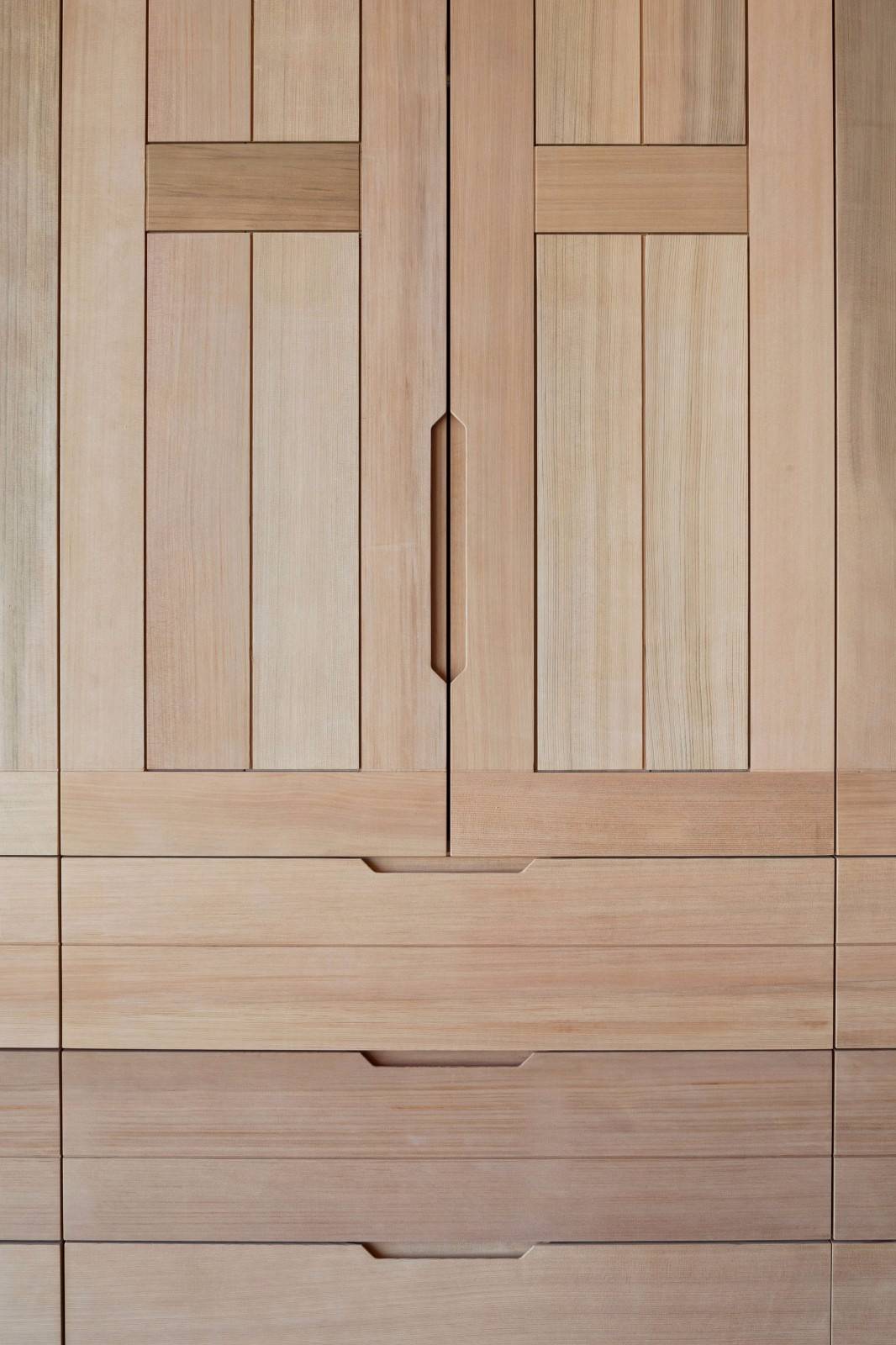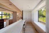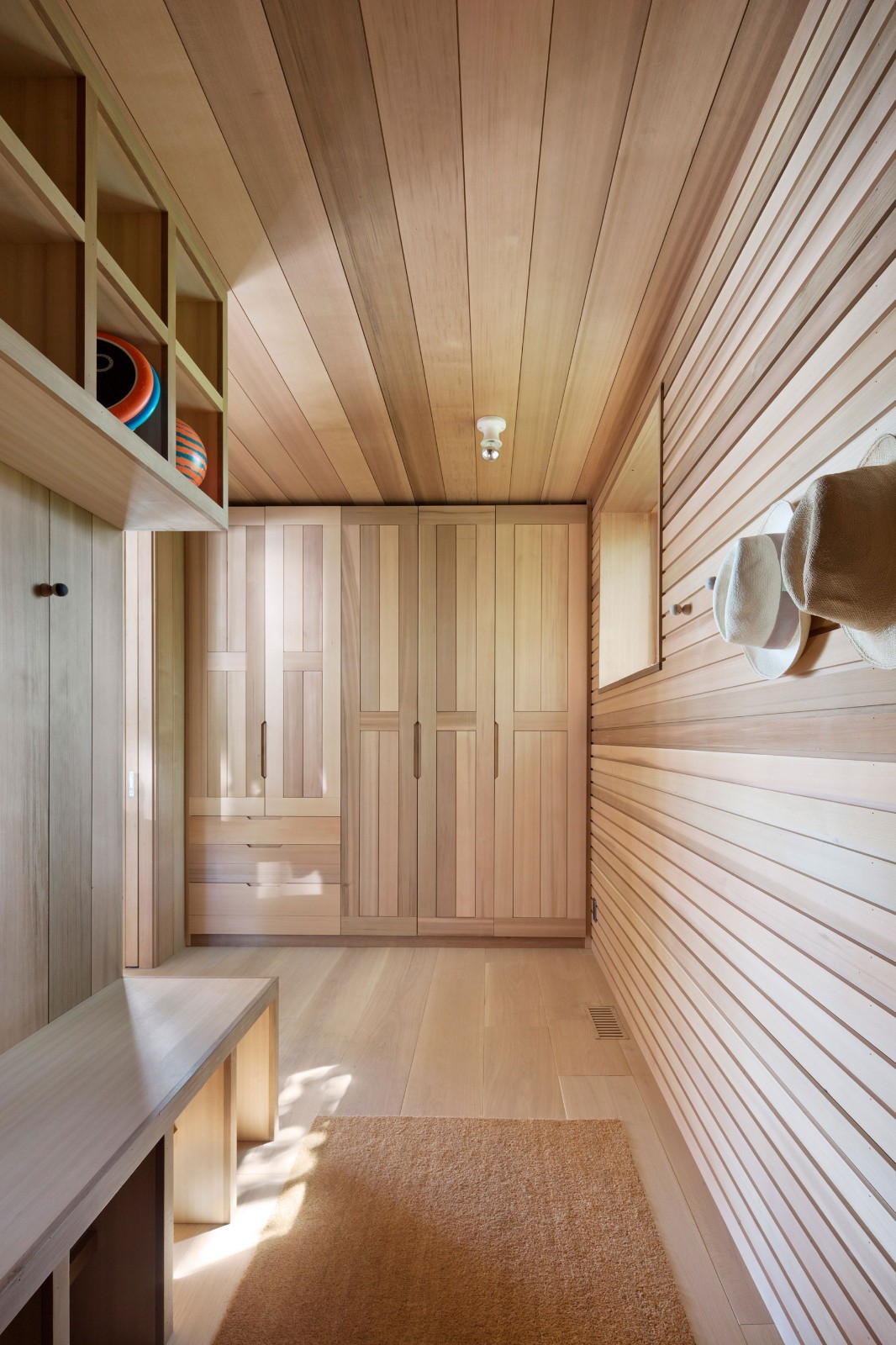 建筑外立面采用混凝土、雪松和再生的IPE木材建造,木材部分都未經(jīng)過多處理,這樣可以隨著時間的流逝逐漸呈現(xiàn)出風(fēng)化的印記。訪客到達(dá)住宅內(nèi)部時,映入眼簾的是一面風(fēng)化的鋼墻,這面墻的設(shè)置建筑師們參考了現(xiàn)代雕塑家理查德·塞拉的作品設(shè)計而成。“這些未加工的材料正在慢慢地演變出一種天然的古銅色,這些顏色最終會融入環(huán)境并成為景觀的一部分,”事務(wù)所在項目說明中描述道。木工在室內(nèi)也占有顯著地位,墻面、地板和天花板均以木材為飾面,其中部分版面刷有白色油漆。