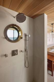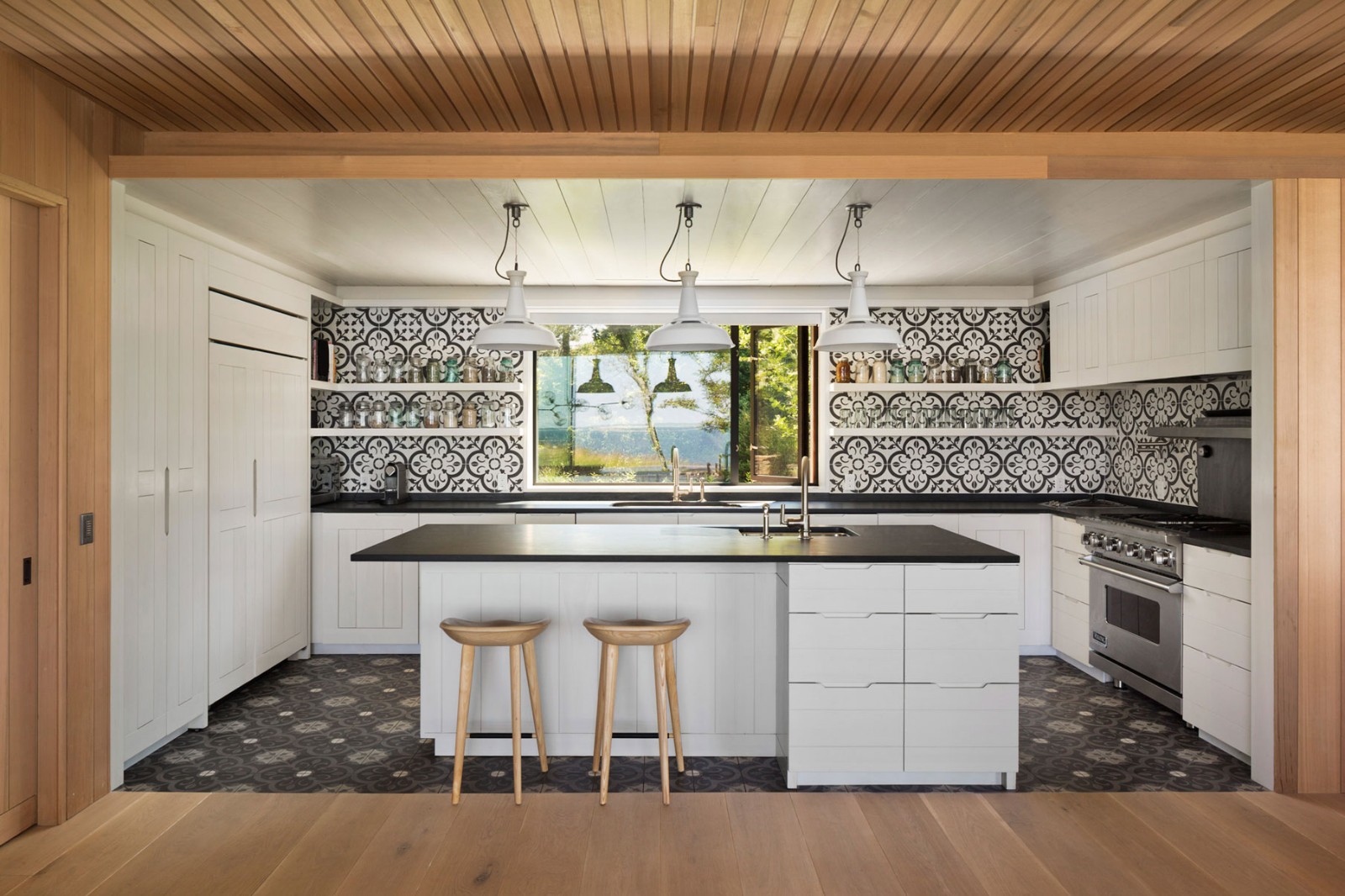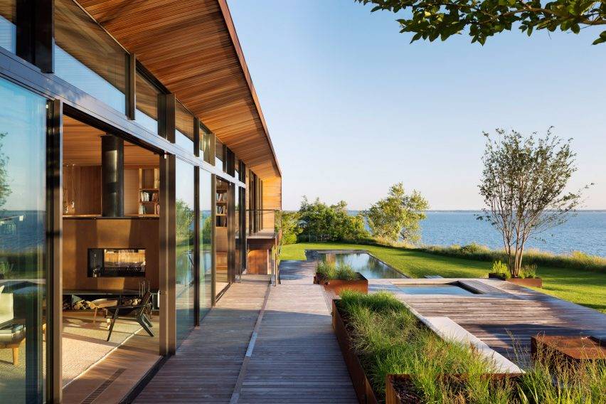 寬敞的客廳位于階梯狀室外露臺的上部盡端,形成了住宅的中心部分?;瑒硬AчT可以沿著面向海灣的墻壁向兩側(cè)推拉,力求將室外景觀最大化地納入室內(nèi)。Mapos事務(wù)所于2016年完成了這座住宅的設(shè)計建造工作,它順利成為漢普頓片區(qū)住宅的一份子,這里是紐約富人的周末度假勝地。