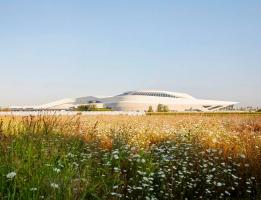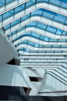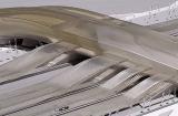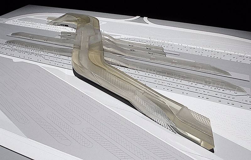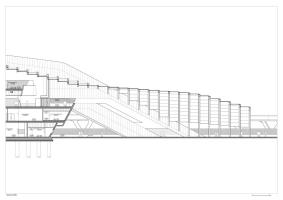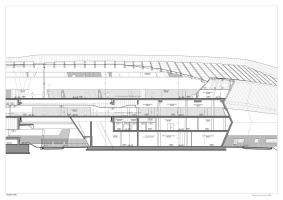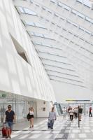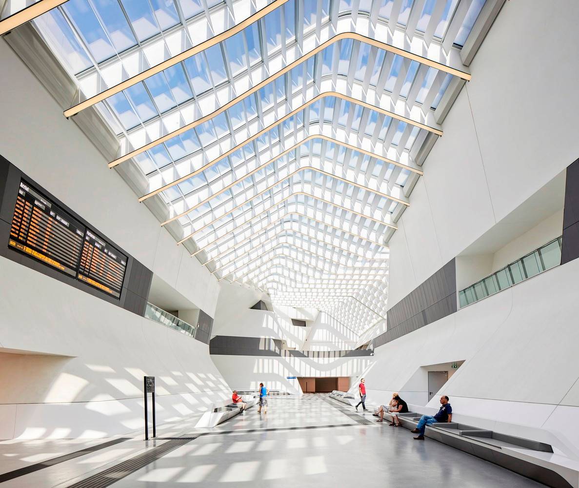 火車站沿450米長(zhǎng)的彎曲路徑設(shè)計(jì)成不等邊四邊形體量,高架大廳由200個(gè)不同形狀的鋼肋制成,這些鋼肋用科里安玻璃屋頂包覆。