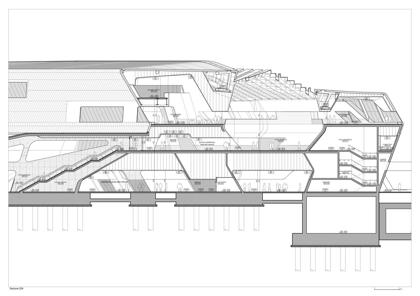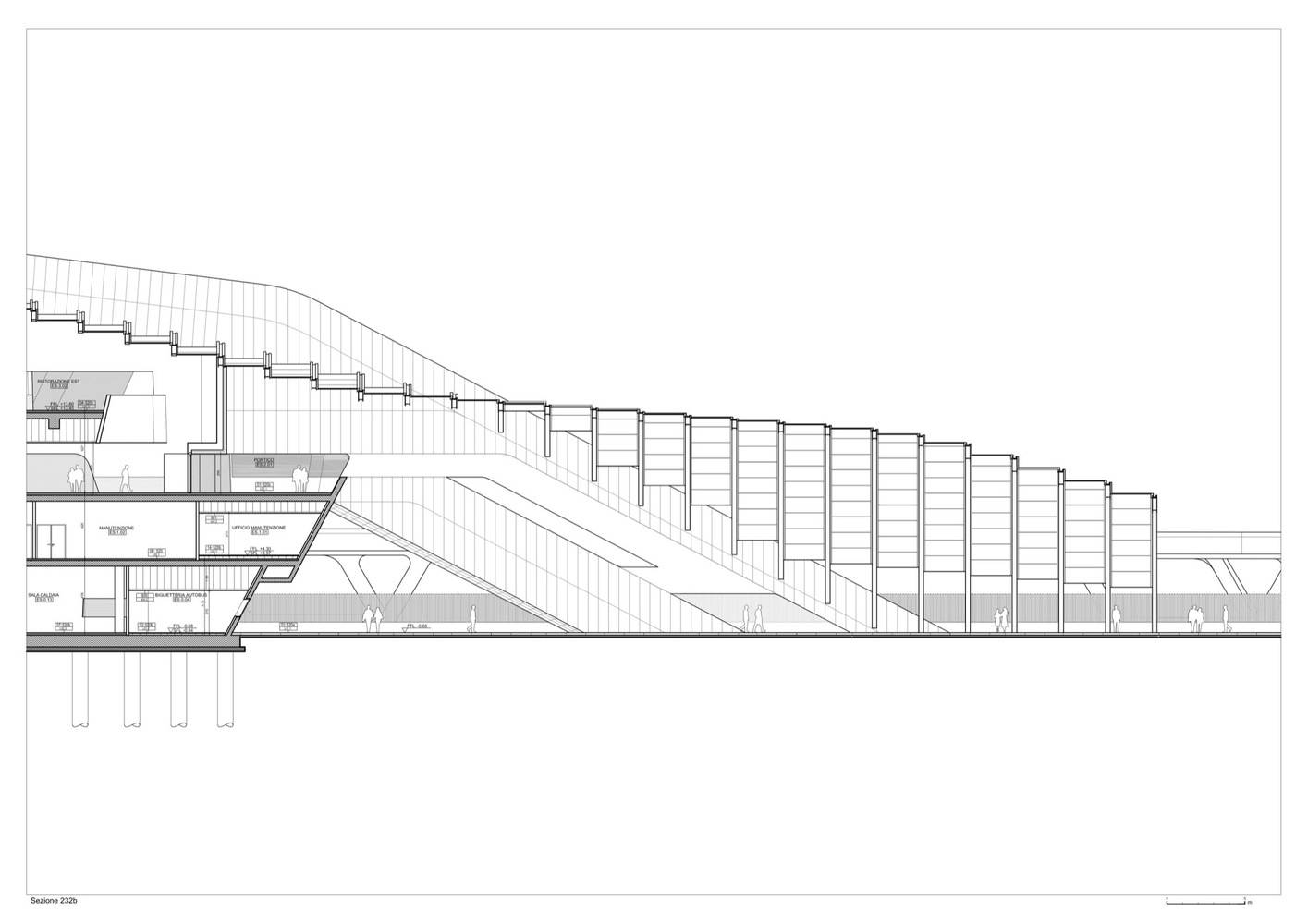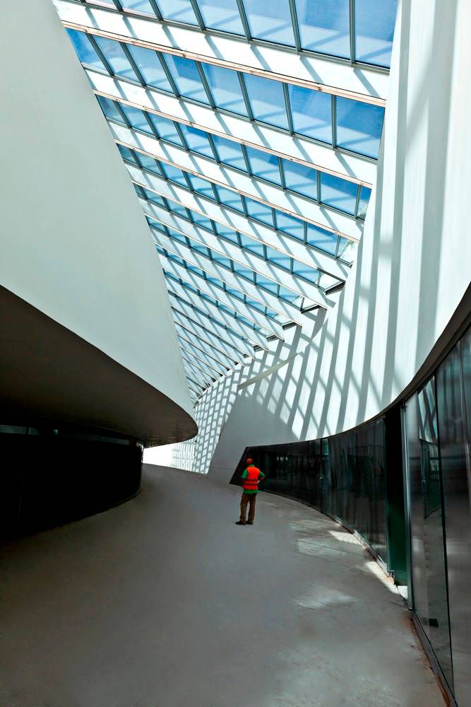 車站內(nèi)使用的混凝土采用了特殊配料,將其性能提升至最佳。彎曲結(jié)構(gòu)混凝土構(gòu)件的建造則采用了在羅馬MAXXI博物館建造期間首次開發(fā)的技術(shù),用預(yù)制鋼原件代替木模板,雙曲線的構(gòu)件則通過(guò)數(shù)控車床制造的聚苯乙烯模具進(jìn)行澆筑。