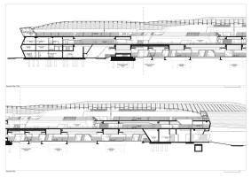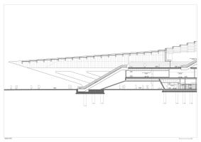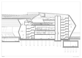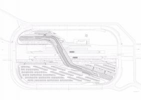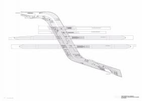 乘客的路徑也決定了內(nèi)部空間的幾何平面布局。車站兩端的大入口迎接并引導(dǎo)游客到高架公共區(qū)域,這些公共區(qū)域內(nèi)排布有商店和其他設(shè)施。車站兩邊的乘客在中央庭院相遇,向上可以看到咖啡館和餐館。鐵軌上方的這個(gè)中央庭院是新火車站急需的新公共空間,也是火車乘客下樓到站臺(tái)的主要大廳。