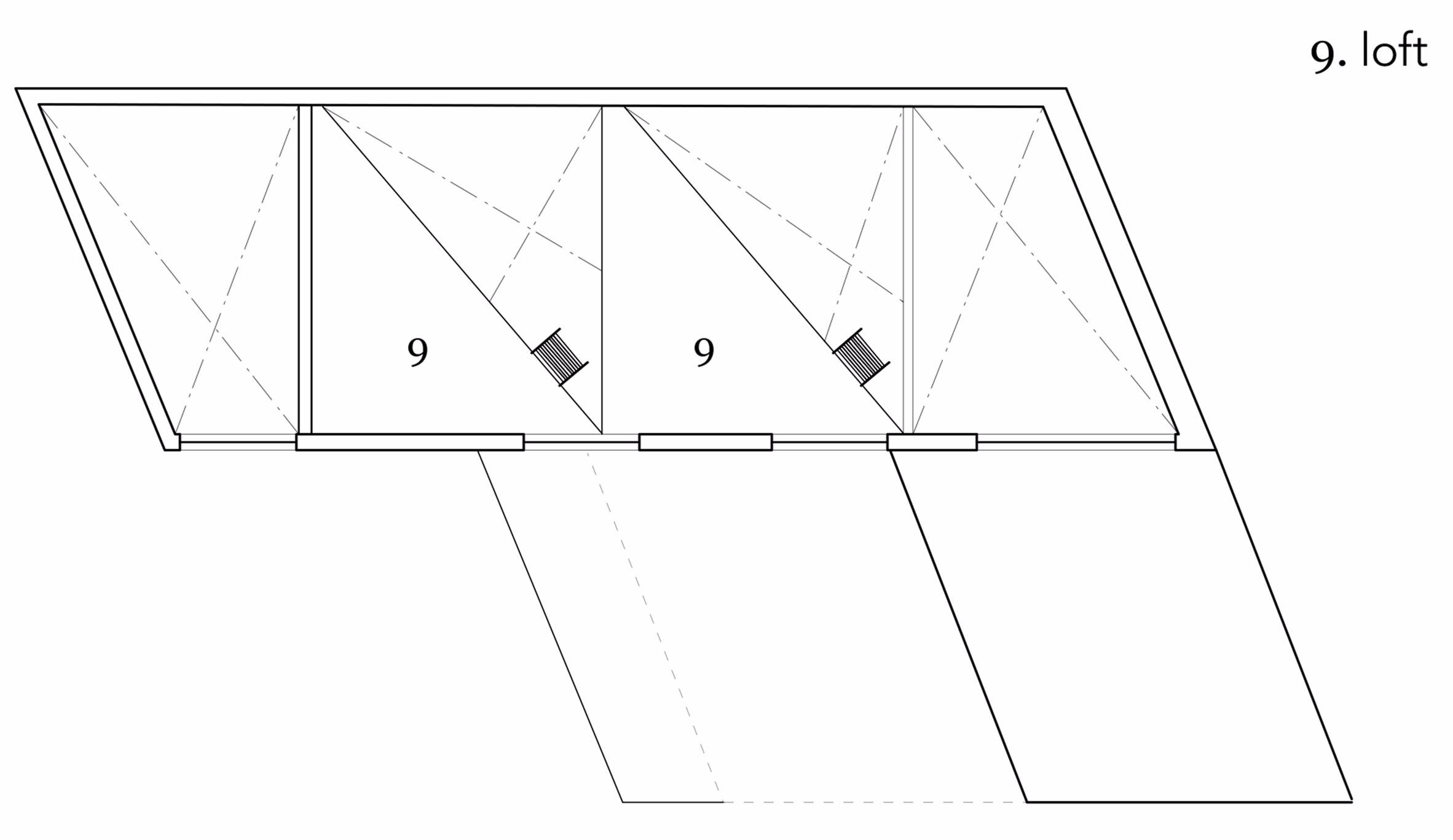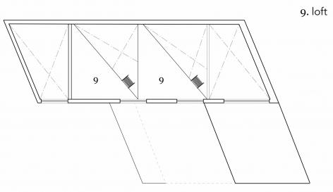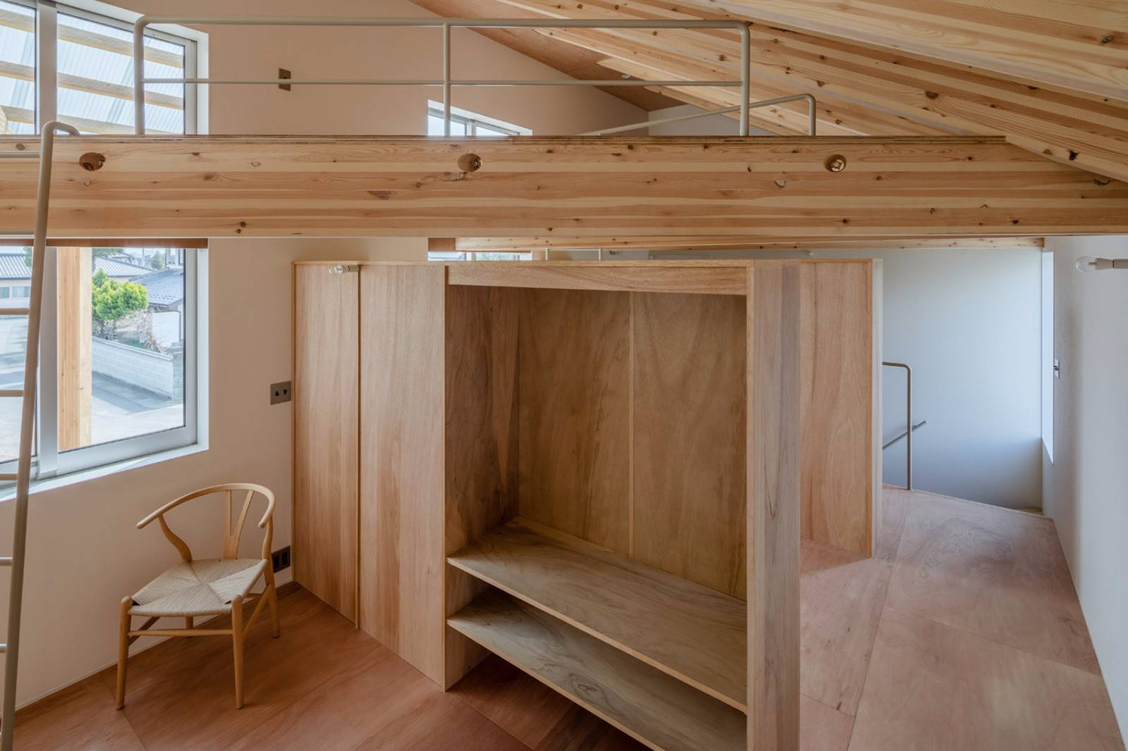 室內空間內置的儲藏柜將房間劃分成兩個相對私密的私人空間,包括梯子,可以進入屋頂斜木(也叫做椽子)下方狹窄壓縮的床鋪平臺。