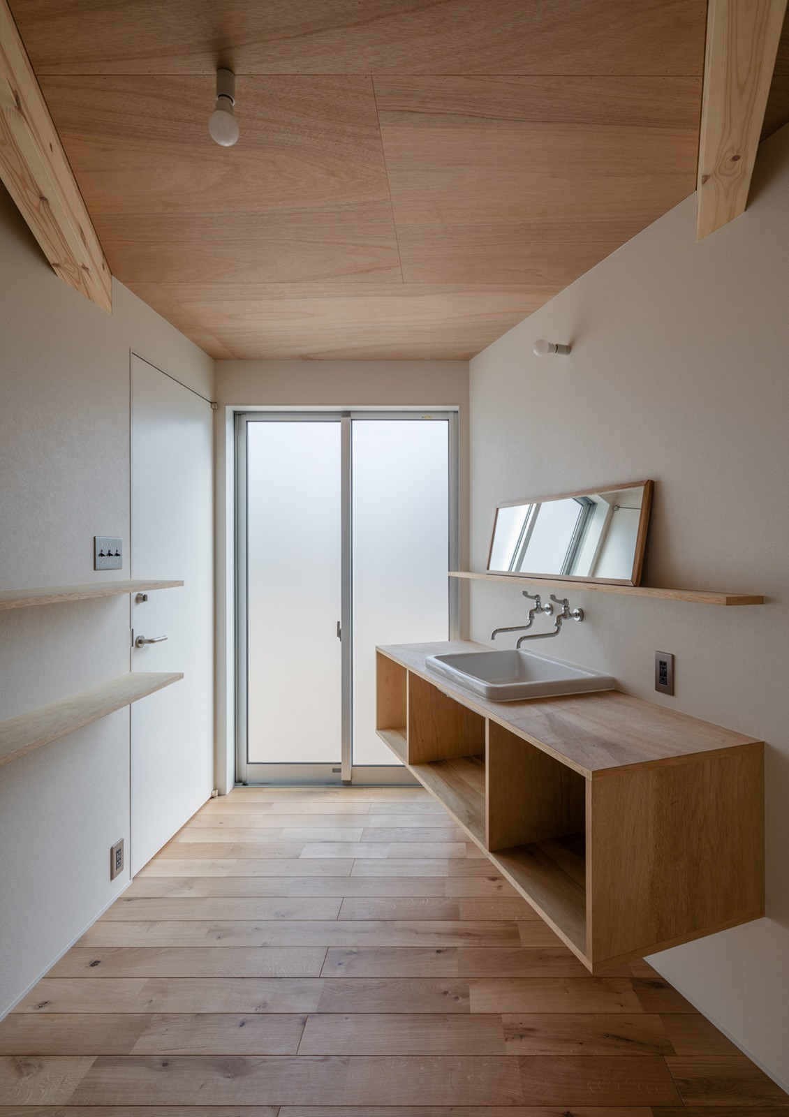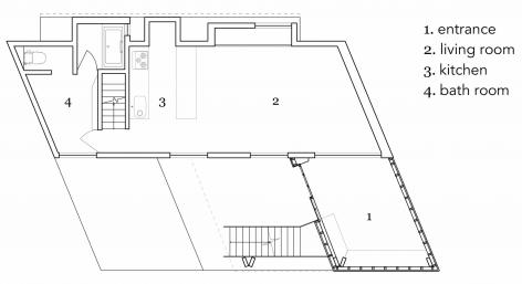 入口門廊直接與開放式起居區(qū)相連,起居區(qū)的一端設有廚房。浴室和樓梯隱藏在廚房墻后面。樓梯通向一樓,為兒童提供一個共用空間,夾在一端的私人臥室和另一端的書房之間。