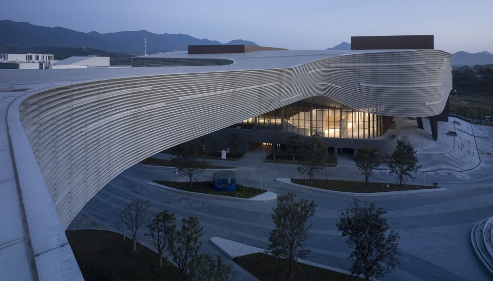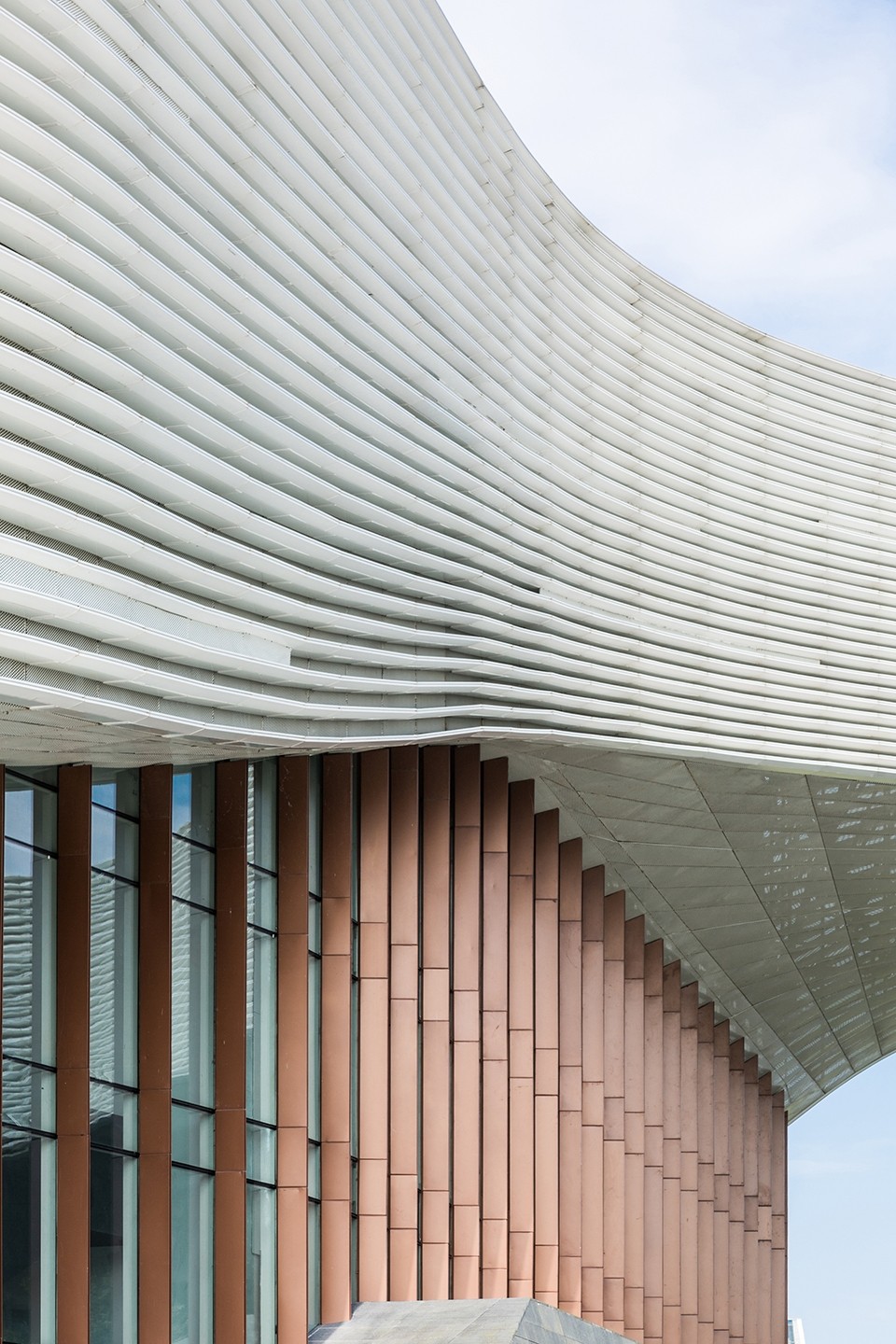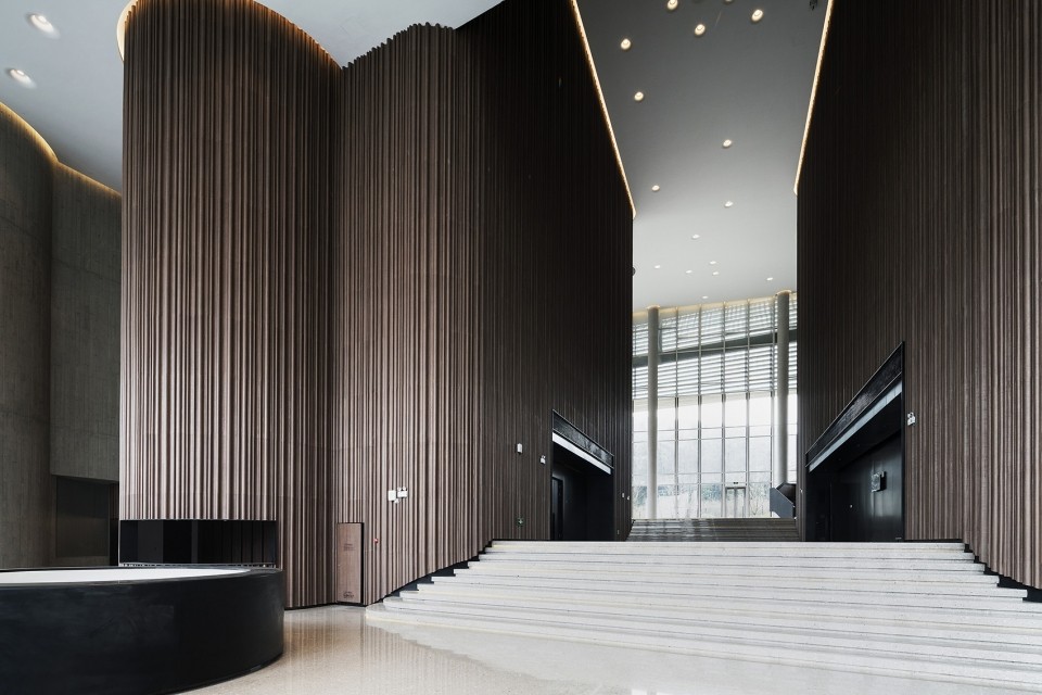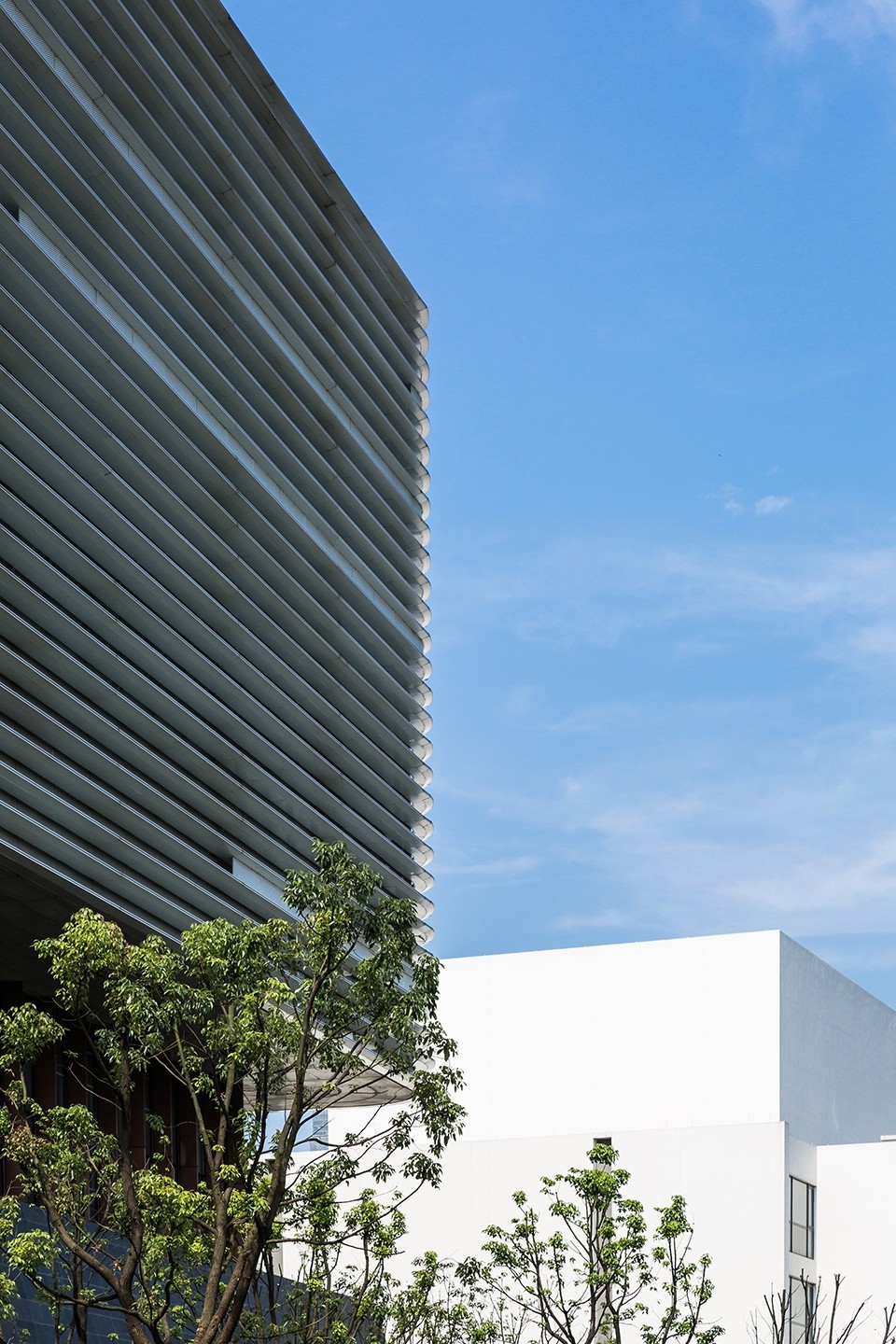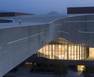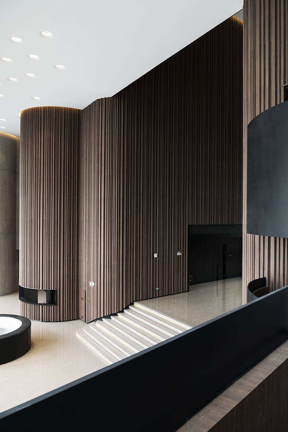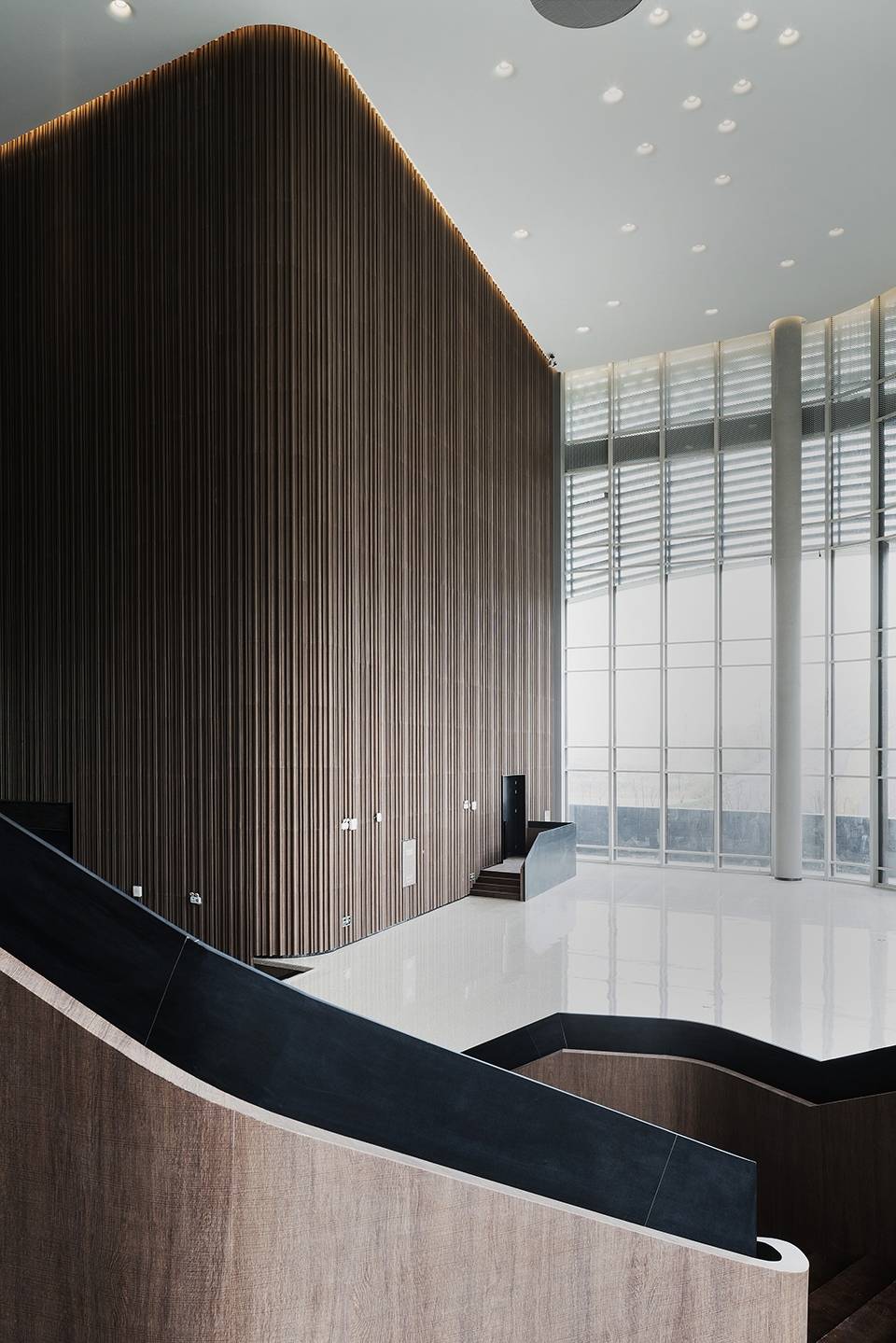 被火山石包裹的基座容納著各類設(shè)備與輔助功能空間,并通過大臺階與前場地面融合在一起。中段的開敞空間由前廳、交通空間所組成,被玻璃幕墻和縱向百葉所覆蓋的表皮也順應(yīng)其公共特質(zhì),從視野上向外部打開。上段的空間容納著各類演藝功能空間和辦公場所,由30道白色百葉和背襯穿孔板所構(gòu)成的復(fù)合流動表皮將這些空間統(tǒng)一在一個整體的“漂浮樂章”之中。