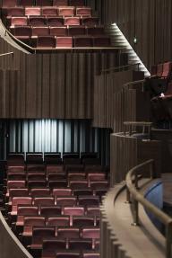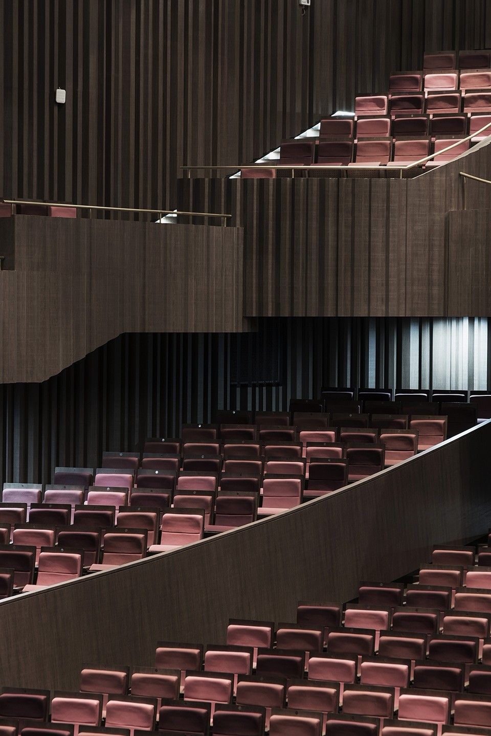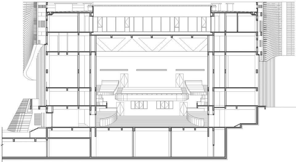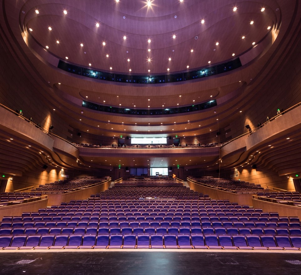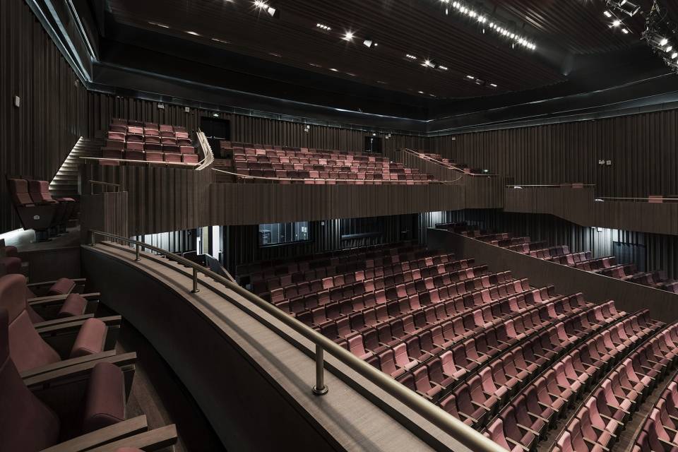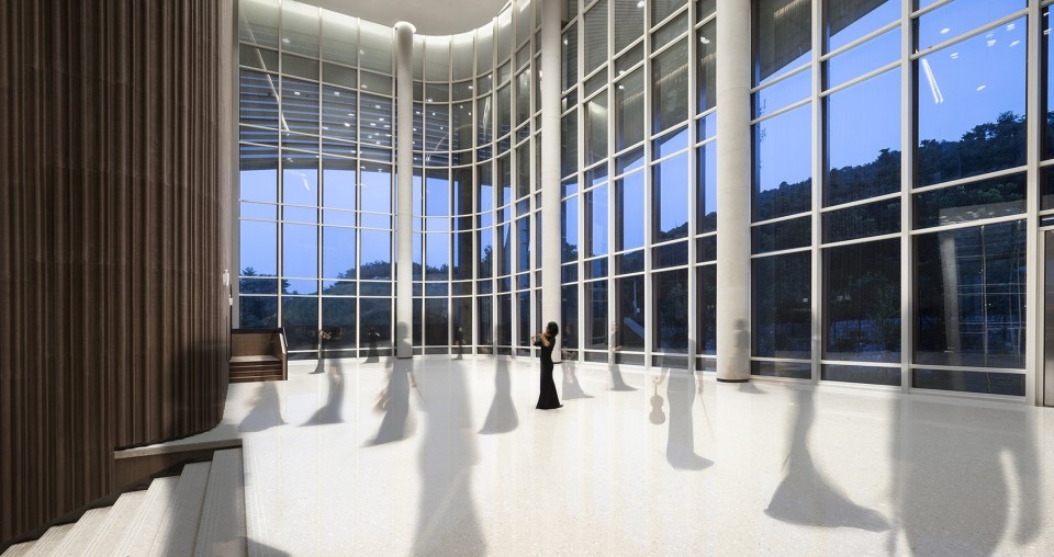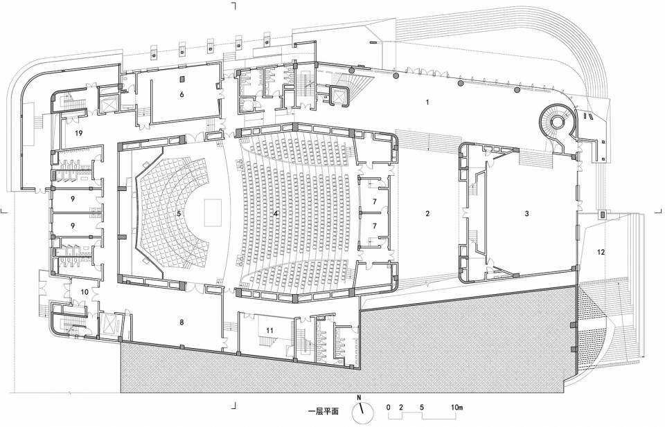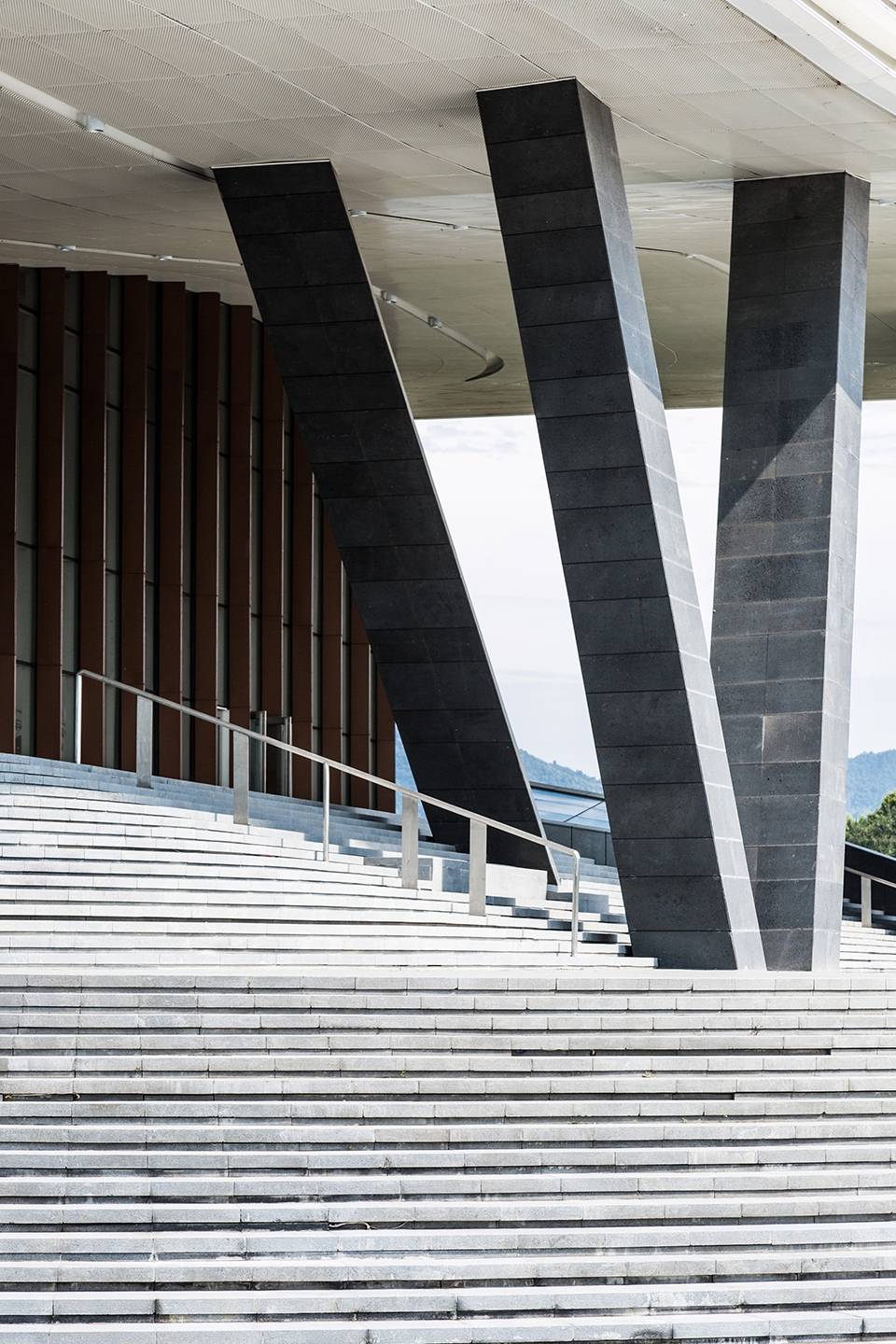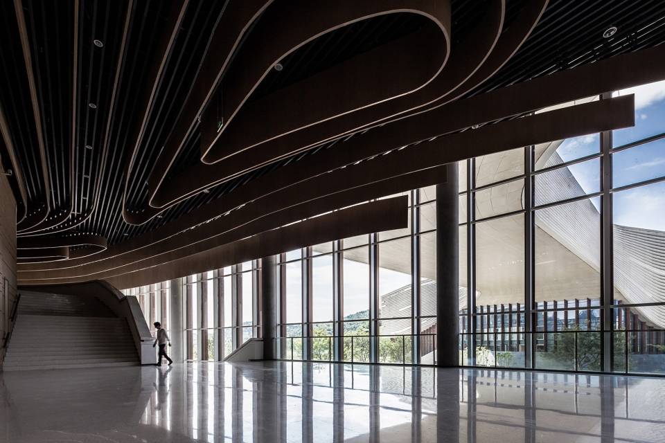 被火山石包裹的基座容納著各類設(shè)備與輔助功能空間,并通過大臺階與前場地面融合在一起。中段的開敞空間由前廳、交通空間所組成,被玻璃幕墻和縱向百葉所覆蓋的表皮也順應(yīng)其公共特質(zhì),從視野上向外部打開。上段的空間容納著各類演藝功能空間和辦公場所,由30道白色百葉和背襯穿孔板所構(gòu)成的復(fù)合流動表皮將這些空間統(tǒng)一在一個整體的“漂浮樂章”之中。