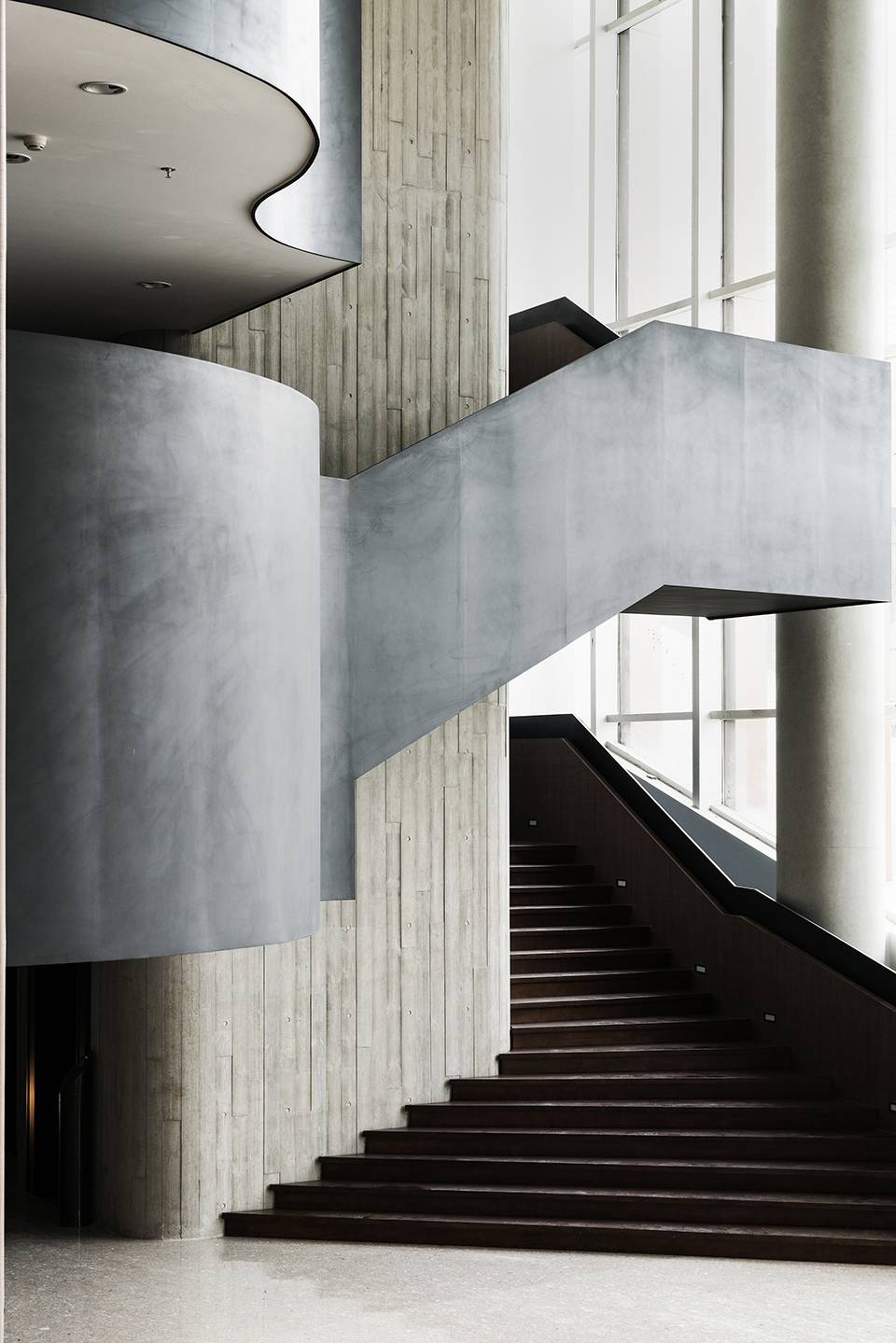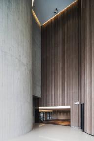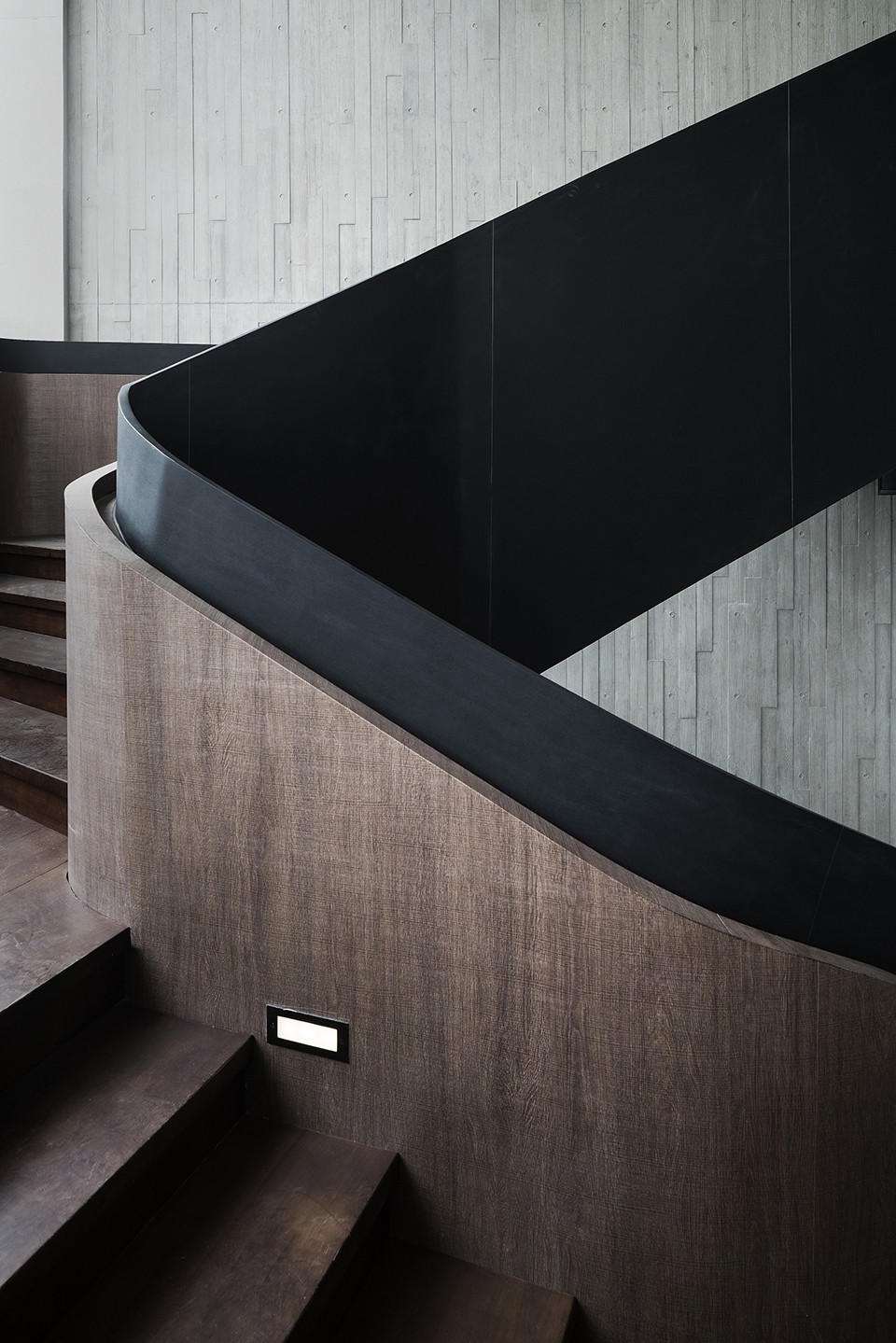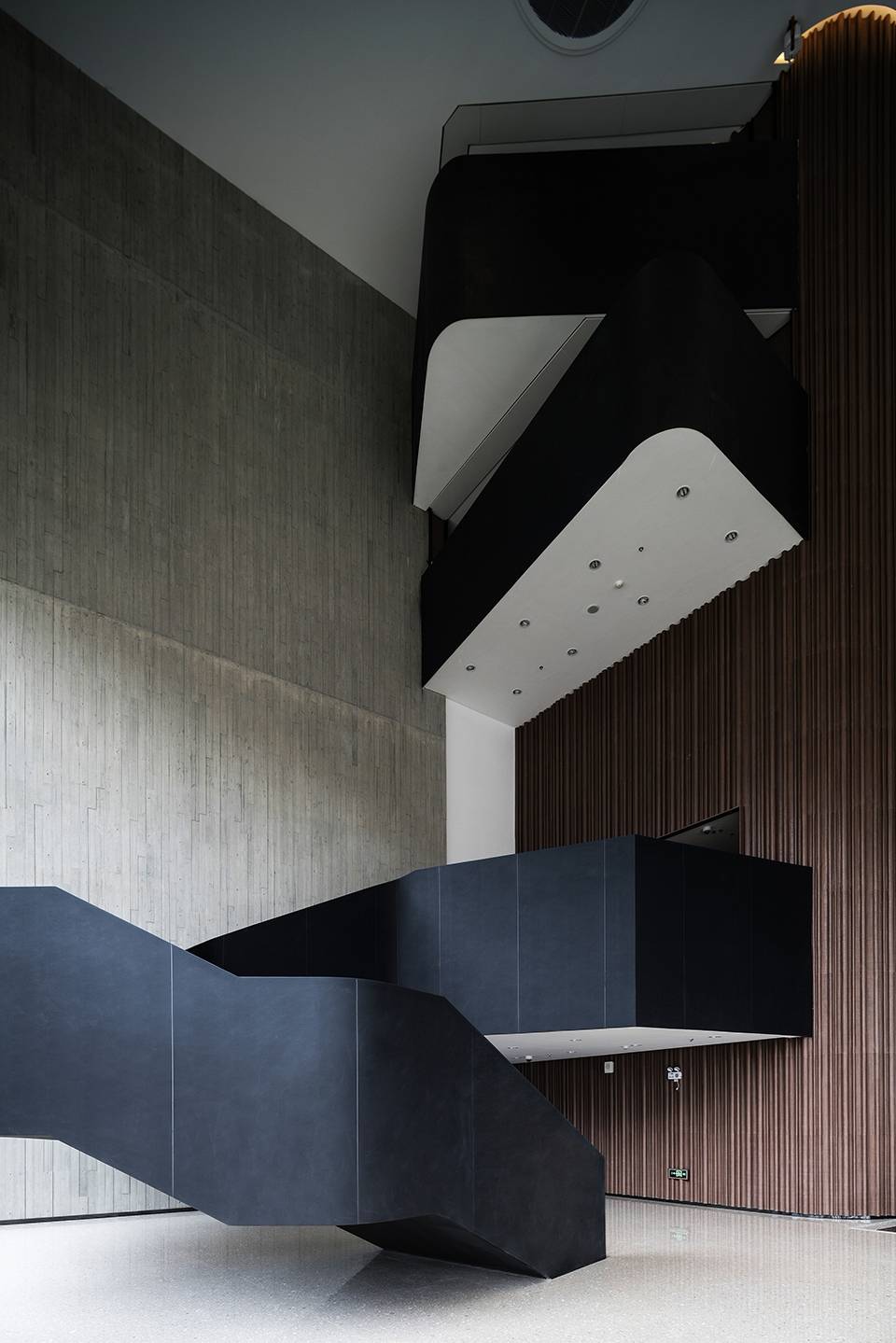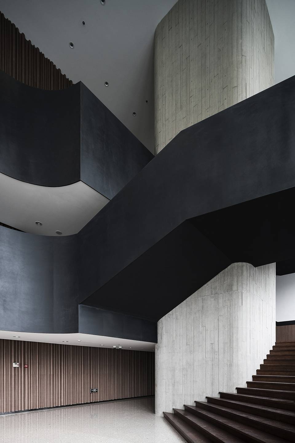 室內(nèi)的處理延續(xù)了建筑外部的整體性,空間成為了室內(nèi)營造的核心,在內(nèi)置盒子體量的表面則通過混凝土、grc、鋼、木材等材質(zhì)的應(yīng)用和對比,試圖傳達(dá)出符合藝術(shù)院校對外窗口氛圍的戲劇化空間。