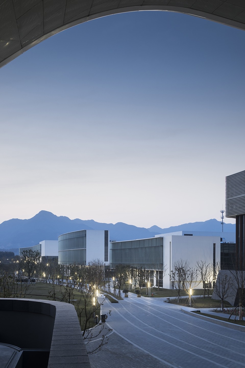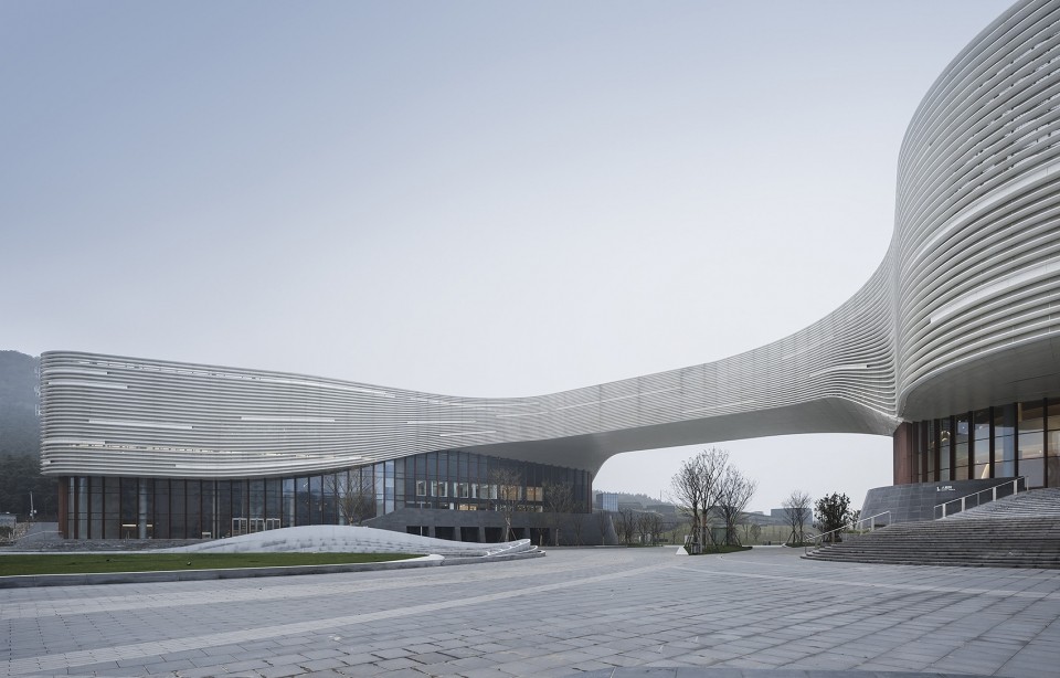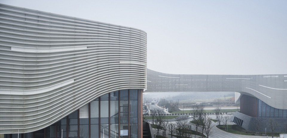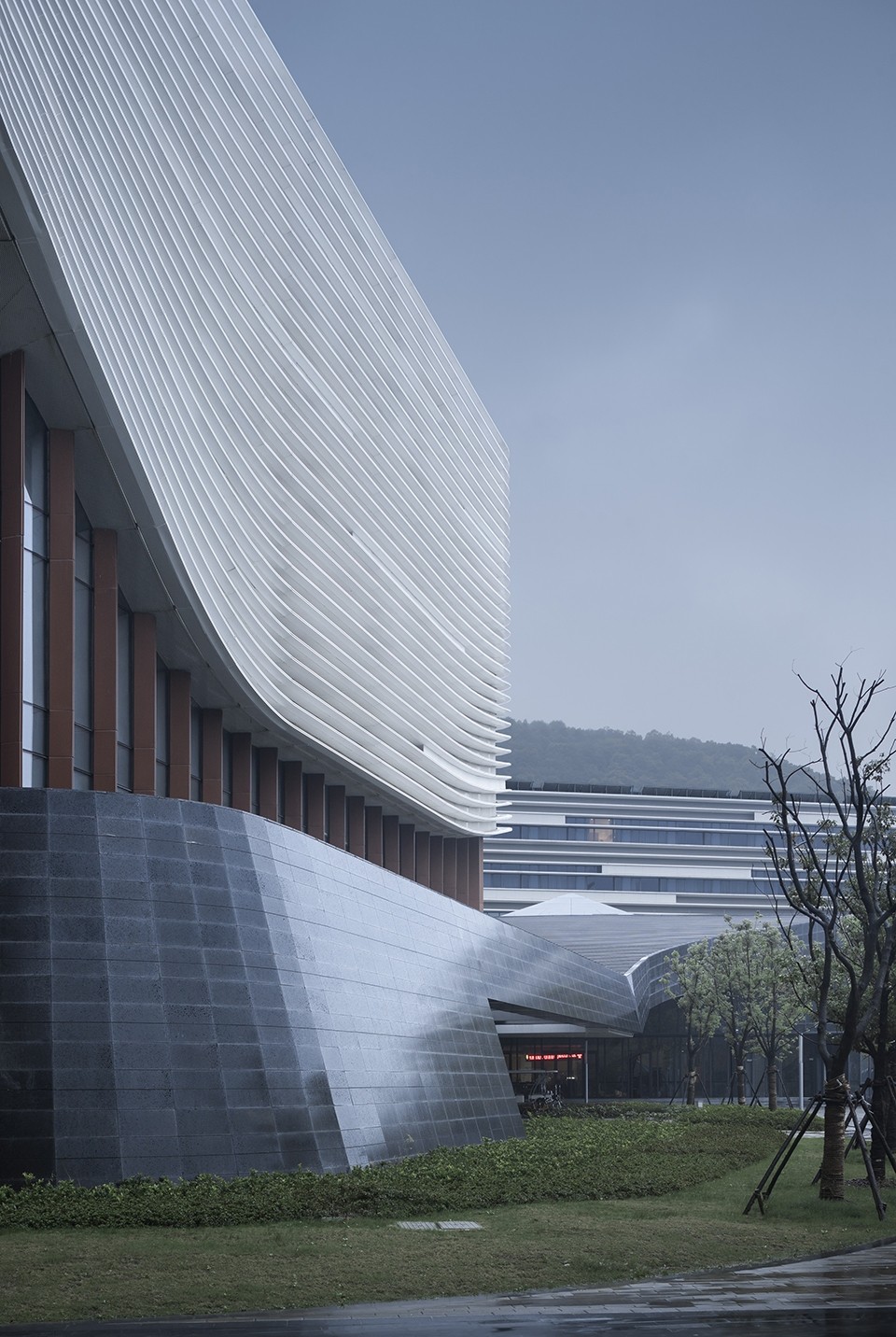浙江音樂學(xué)院公共場館群建設(shè)在杭州轉(zhuǎn)塘、望江山麓,由大劇院和音樂廳兩座建筑聯(lián)體構(gòu)成,特殊的形式語言、以及與外界聯(lián)系密切的功能定位使其自然地承擔(dān)起學(xué)校的東大門的重要職責(zé)。