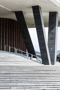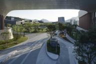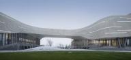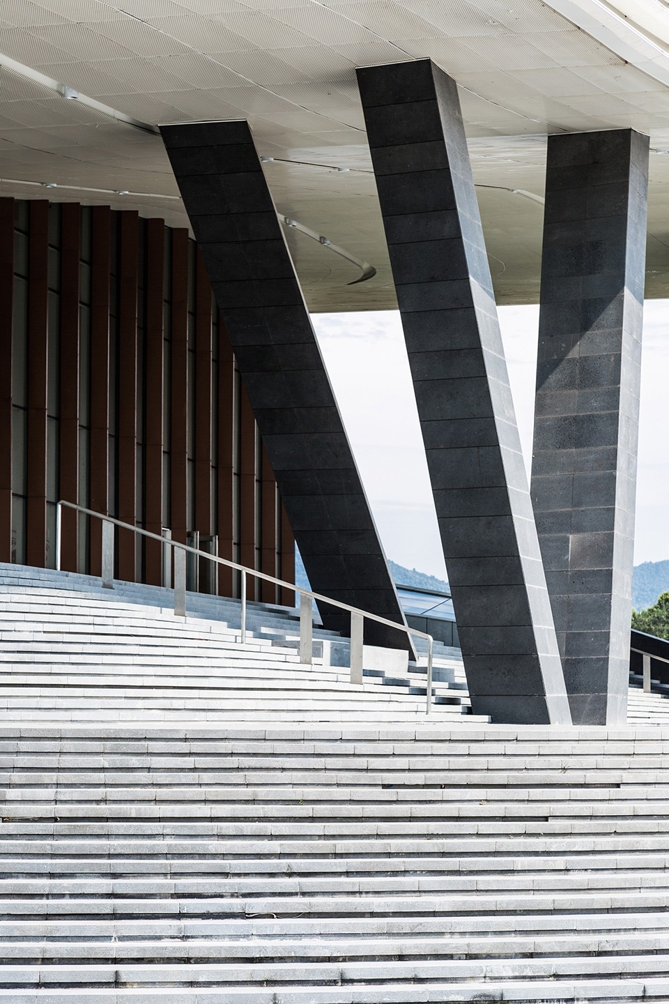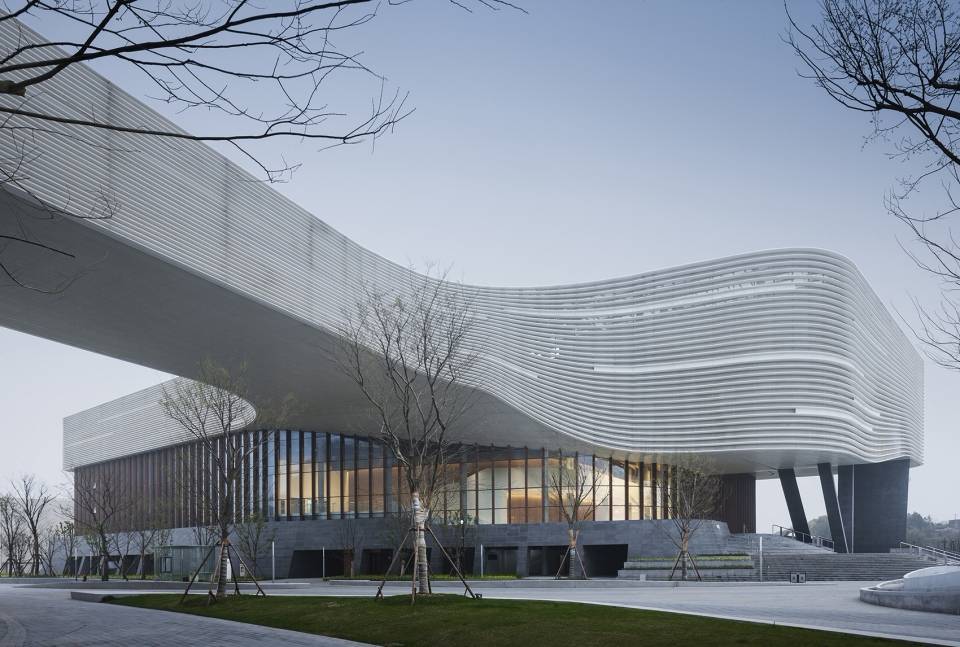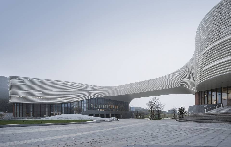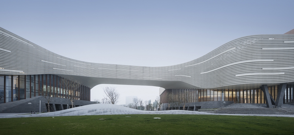 浙江音樂學(xué)院公共場館群建設(shè)在杭州轉(zhuǎn)塘、望江山麓,由大劇院和音樂廳兩座建筑聯(lián)體構(gòu)成,特殊的形式語言、以及與外界聯(lián)系密切的功能定位使其自然地承擔(dān)起學(xué)校的東大門的重要職責(zé)。