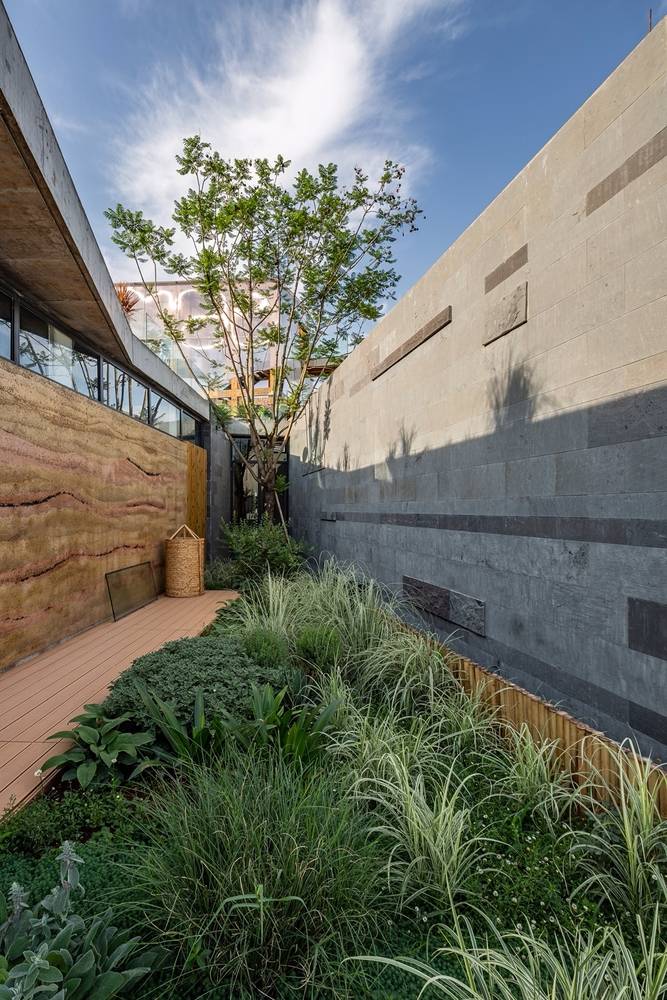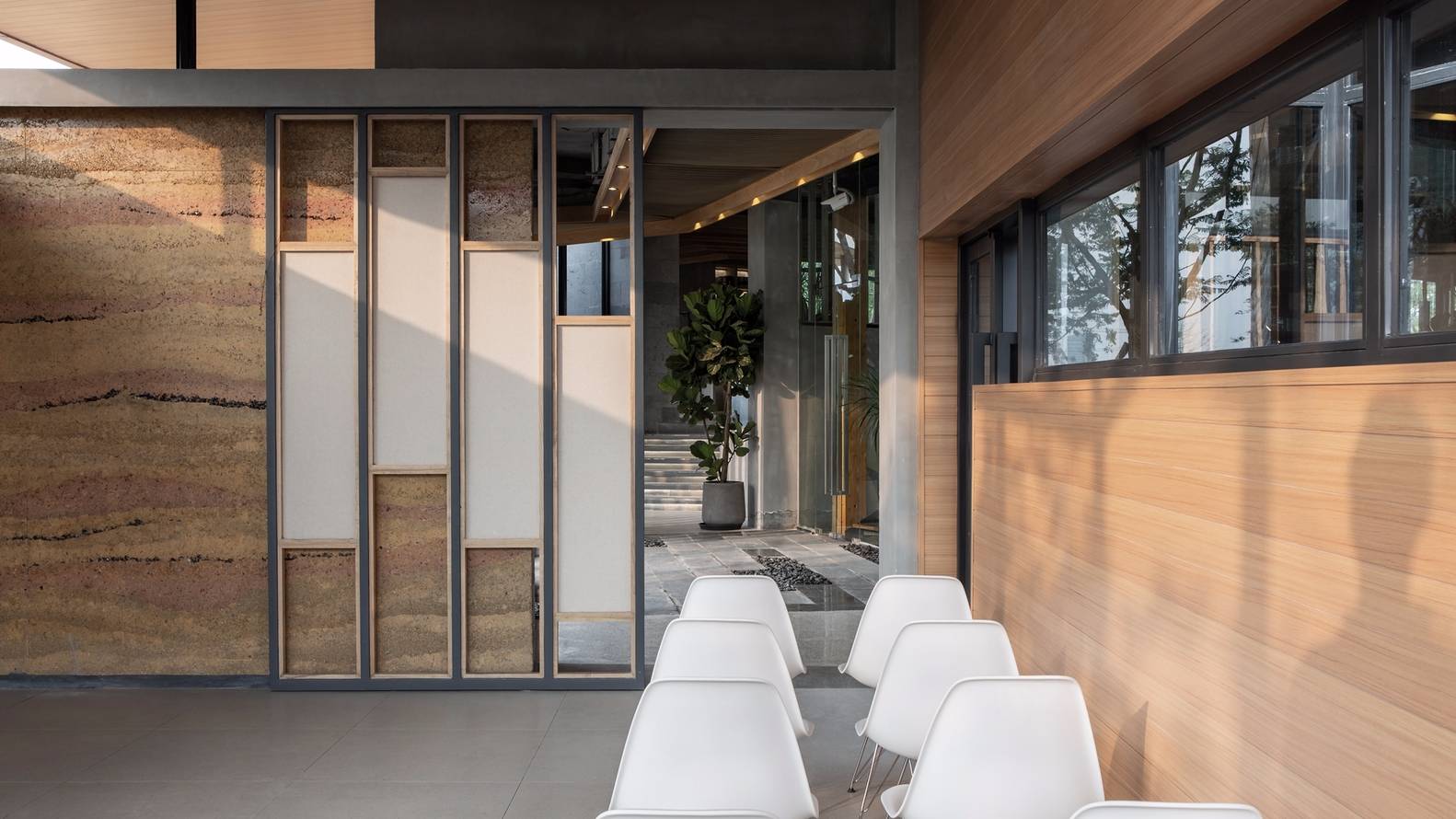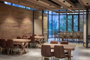 室內(nèi)設(shè)計中,木制家具與夯土和木結(jié)構(gòu)相融合,鄉(xiāng)土材料的再設(shè)計與疊加為花房餐廳的室內(nèi)空間帶來寧靜與細致。