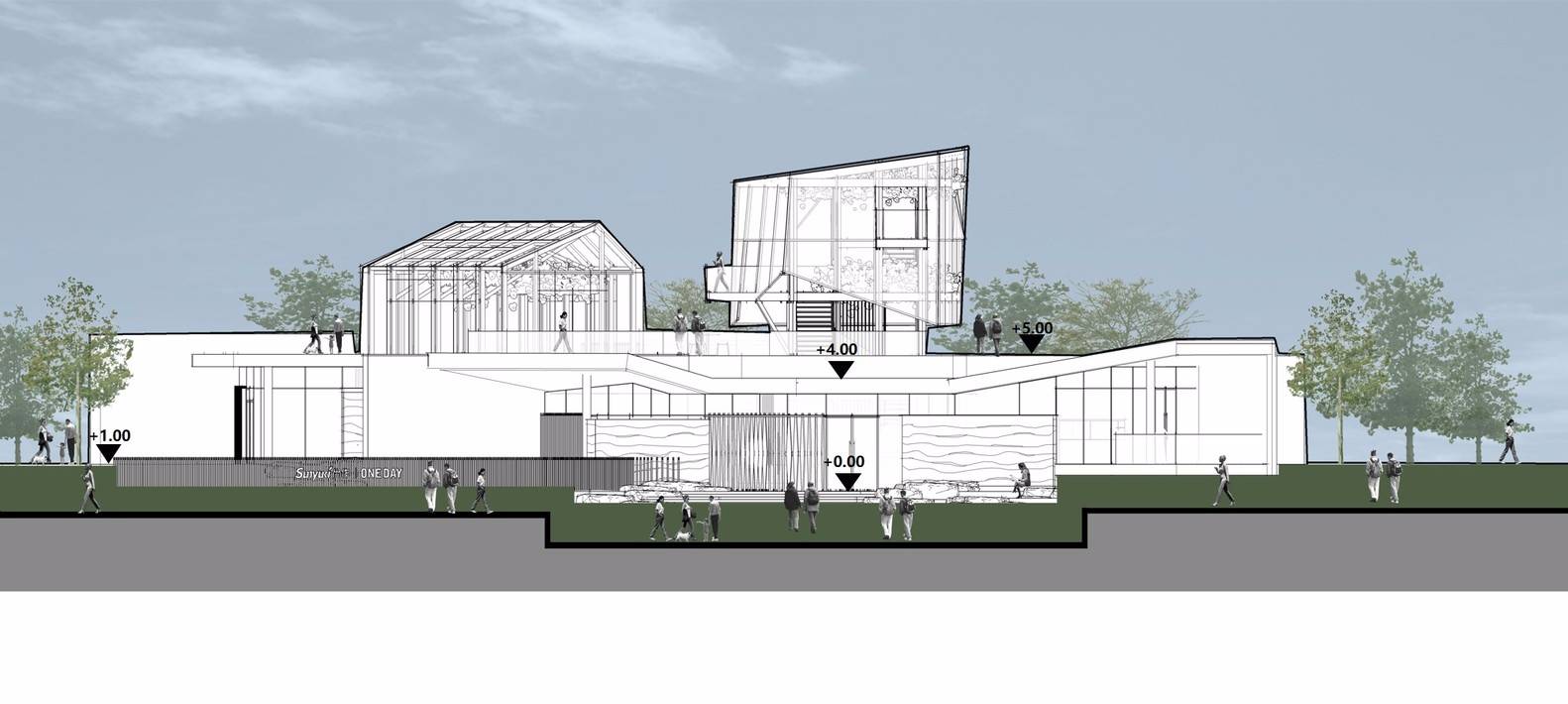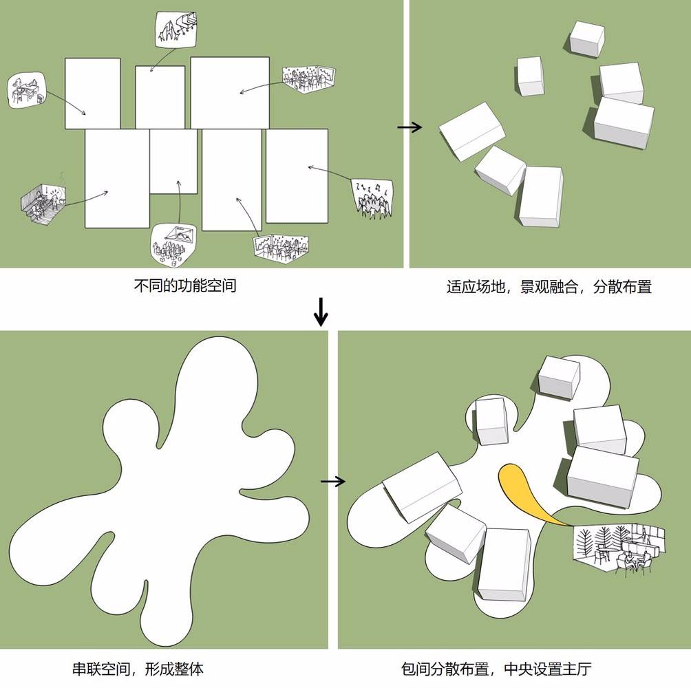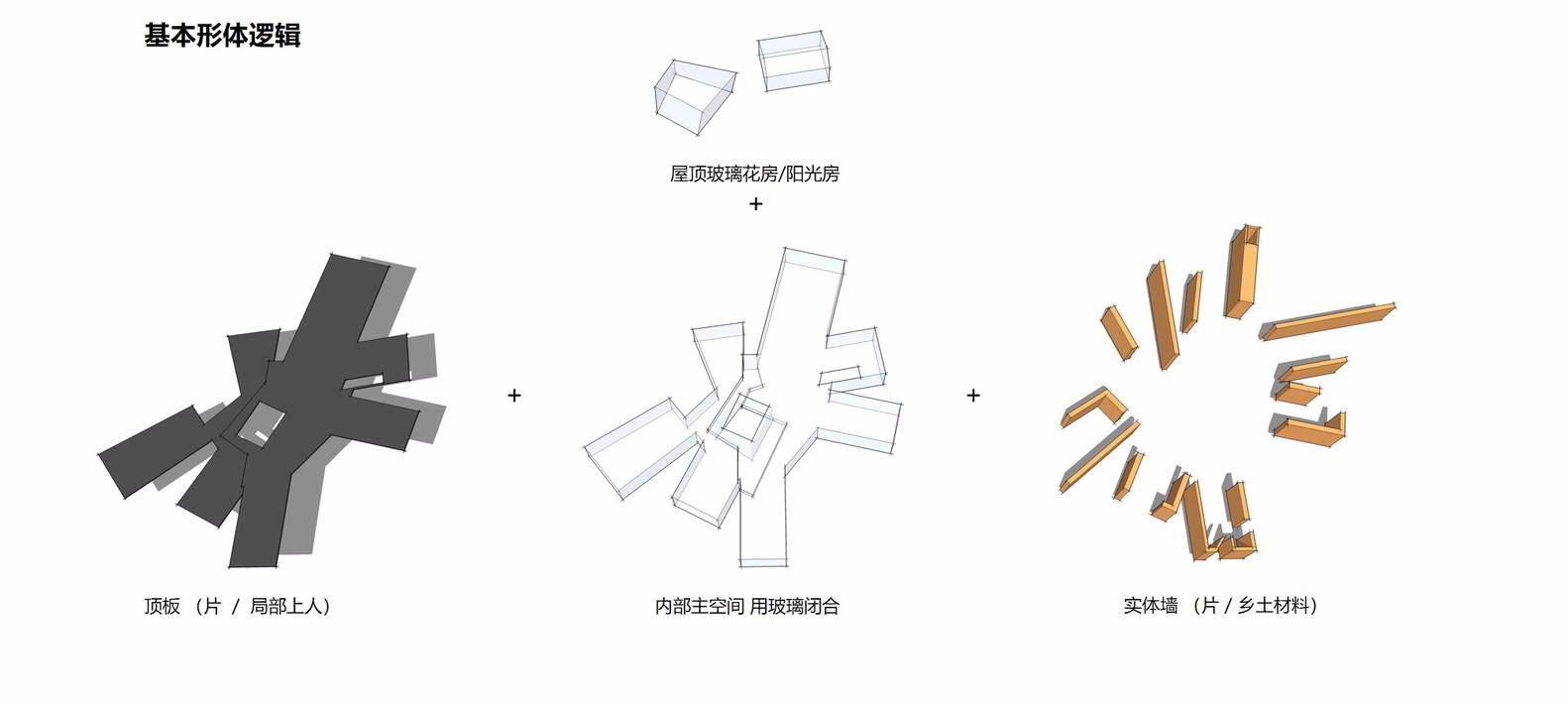 花房餐廳是為了減少地形的改造,并解決臨近的兩條道路導(dǎo)致的兩側(cè)高差,在設(shè)計中將建筑主體設(shè)計為不同標高的兩個區(qū)域,體量生成過程:在復(fù)雜的空間需求,材料需求,地形條件,以及綠建技術(shù)要求下,花房餐廳特別注重”融合“,體現(xiàn)在以下幾點: