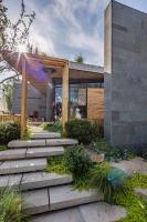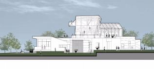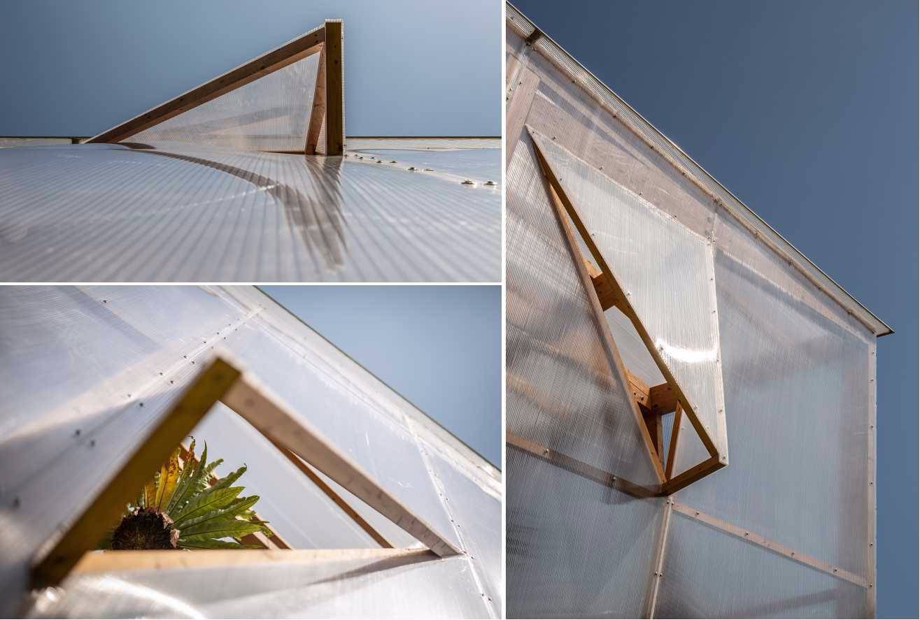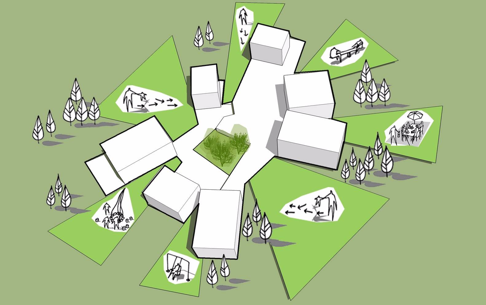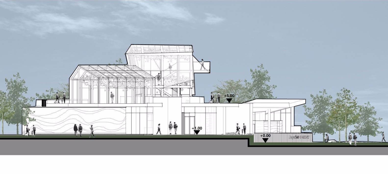 花房餐廳是為了減少地形的改造,并解決臨近的兩條道路導(dǎo)致的兩側(cè)高差,在設(shè)計中將建筑主體設(shè)計為不同標高的兩個區(qū)域,體量生成過程:在復(fù)雜的空間需求,材料需求,地形條件,以及綠建技術(shù)要求下,花房餐廳特別注重”融合“,體現(xiàn)在以下幾點: