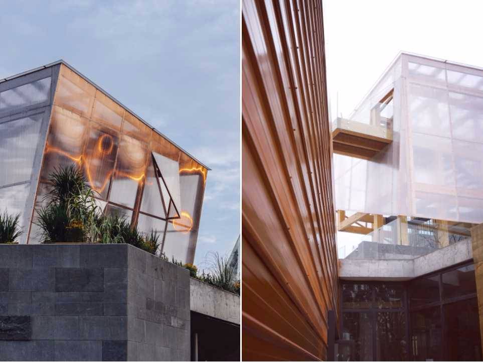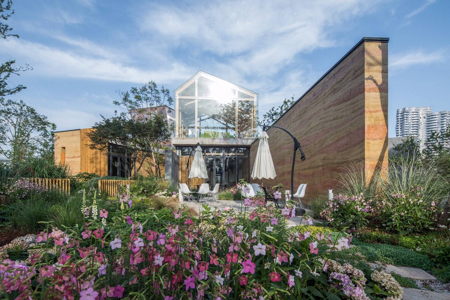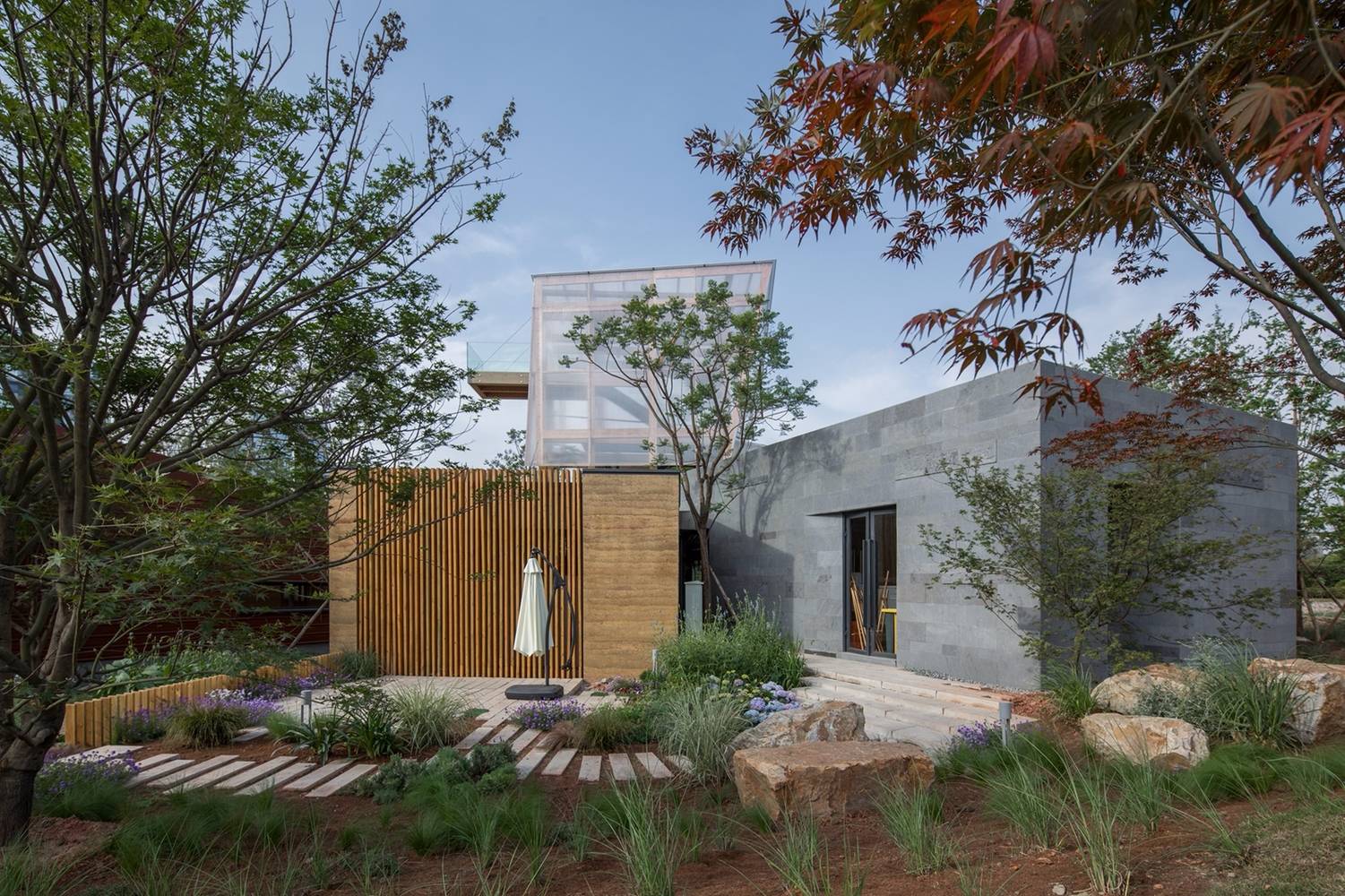 就地取材的夯土形式被大量運用,一方面保證了空間私密性,也使得建筑室內(nèi)冬暖夏涼,并減少了內(nèi)裝飾的資金投入。作為臨時性的景觀建筑,在苛刻的成本控制要求下,項目承擔(dān)更多廉價的選材和手法:普通石材,單層波紋鋼板,PVC陽光板,以及素混凝土等。